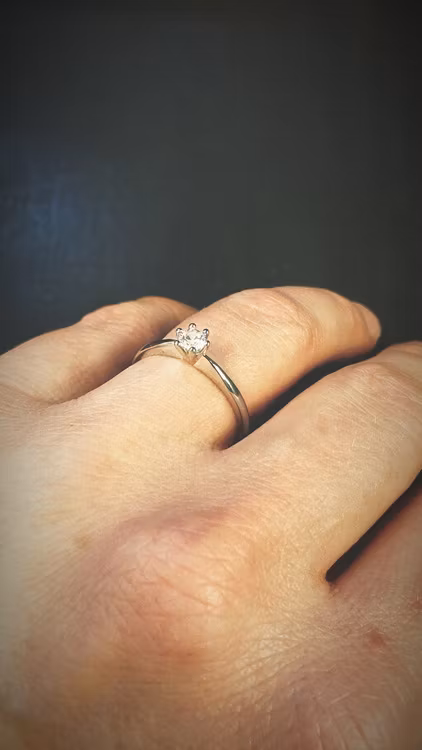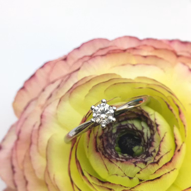 Ring med 0.20 ct briljant som tillverkas på beställning. Mycket nätt modell med en filad spetsskena som mäter 2 mm i bredd. Romantisk sexklofattning stabilt fäste i en vacker v-form. Kan med fördel bäras ihop med en alliansring eller varför inte "Twist" som syns på näst sista bilden. Ringen tillverkas i 18 karats vitt eller rött guld.