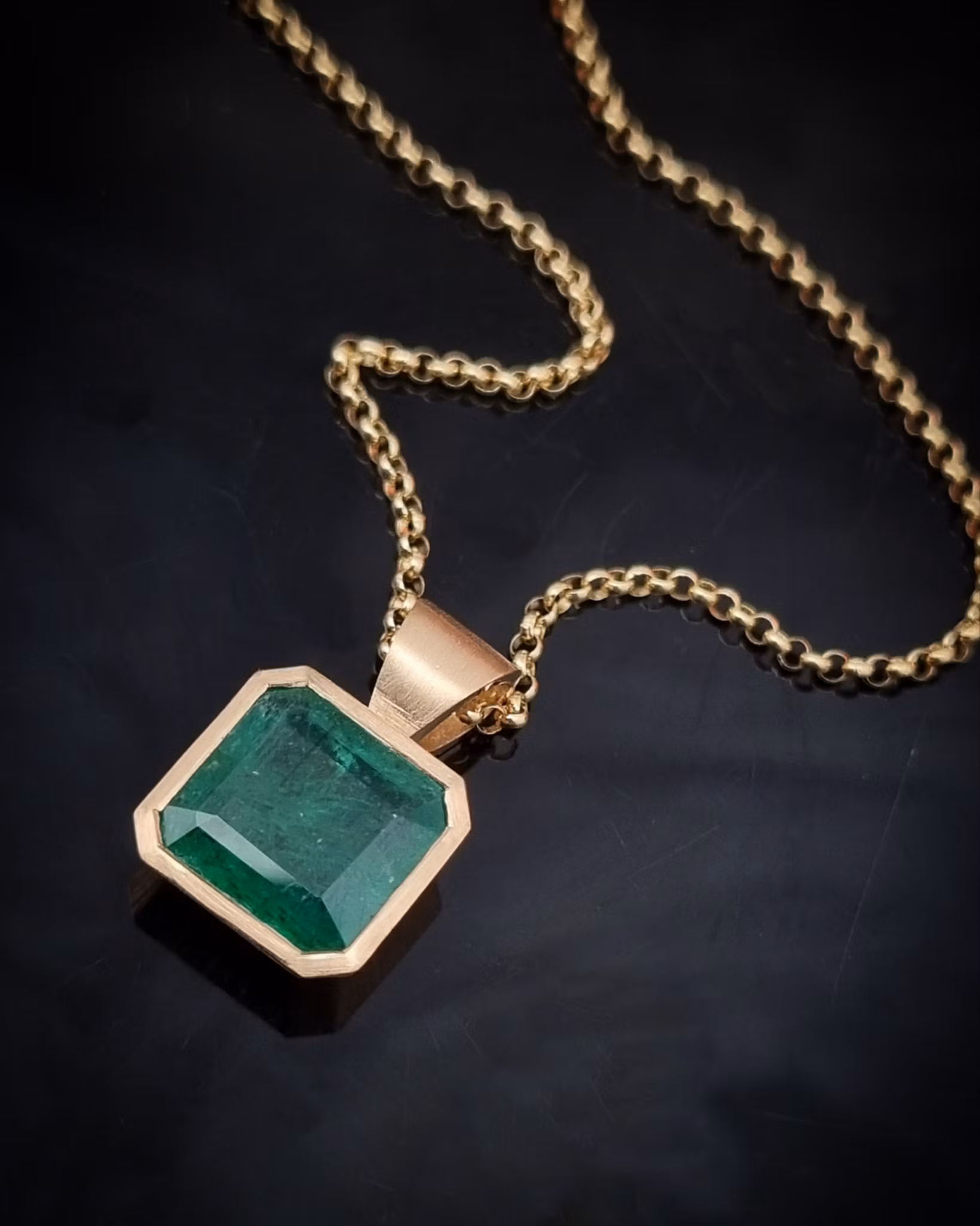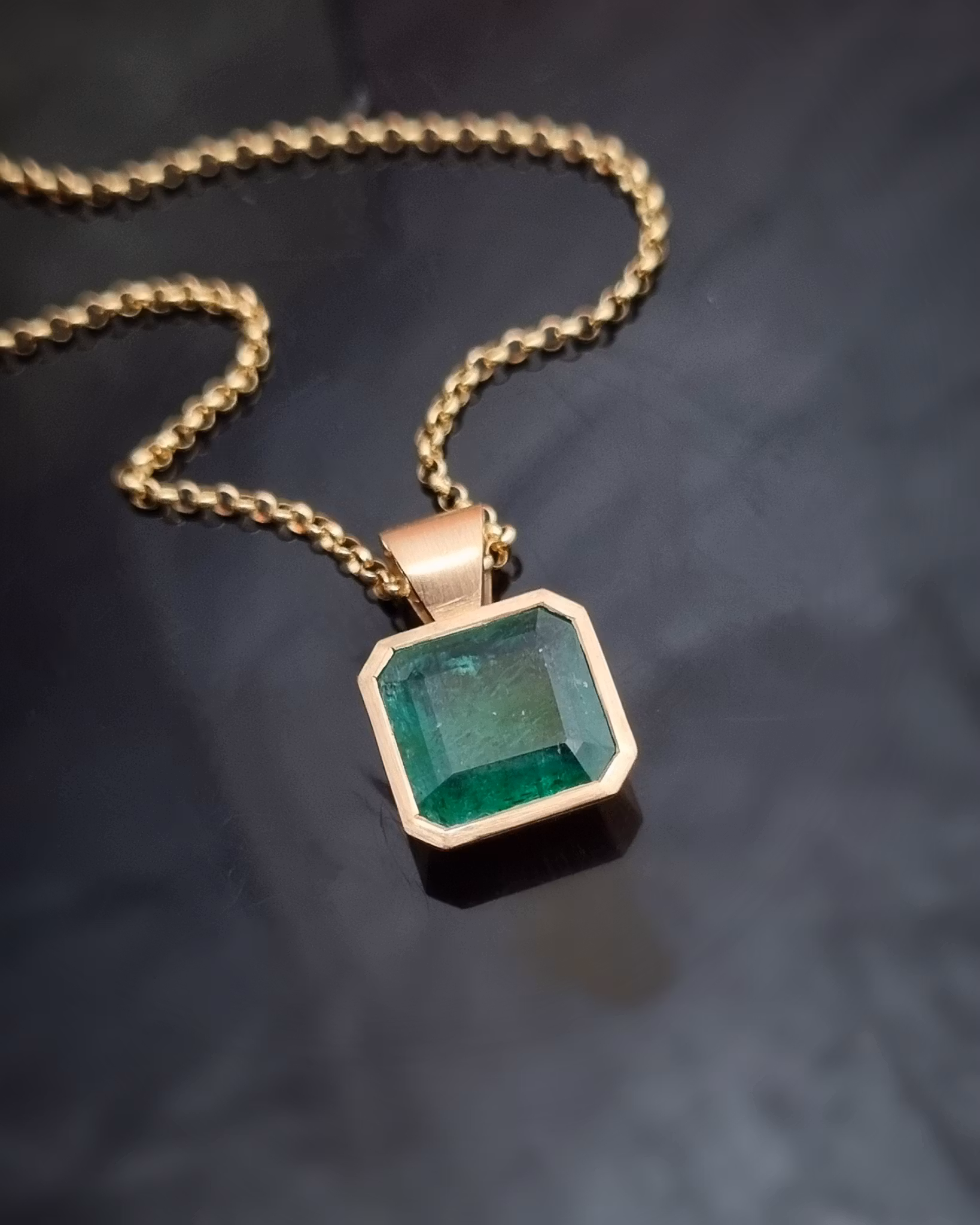 Smaragd i hänge mått 9,7 x 9 mm, 3.06 ct fattad i slät helsarg med sidenmatt yta och fast ögla.