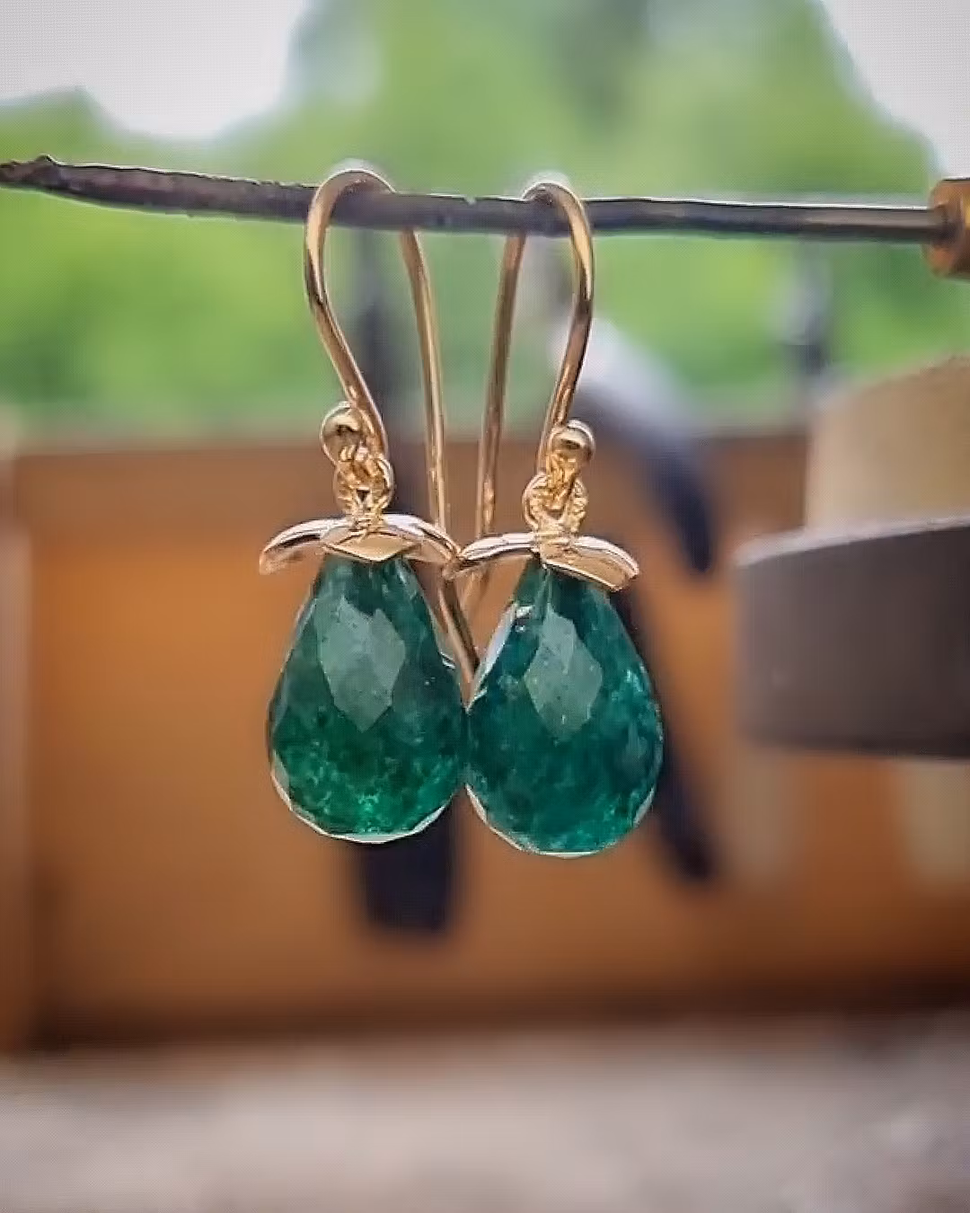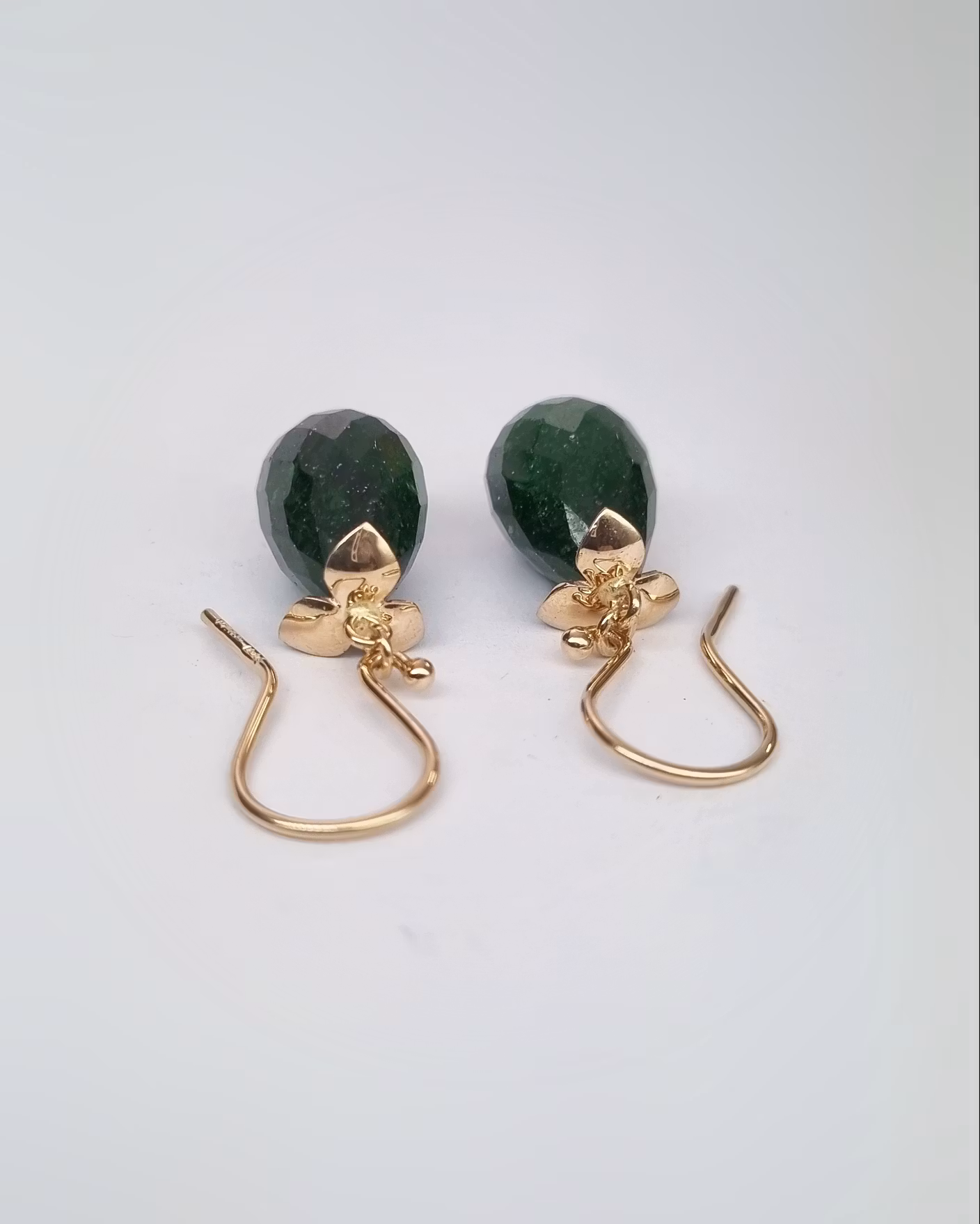 Handgjorda snödroppar i återvunnet 18K med gröna Aventuriner. Ädelstenarna är briolettslipade och har vackra naturliga inneslutningar vilket ger dom en unik karaktär. Färgen är djupt grön och i solljus är dom mustigt skogsgröna i tonen. Andra bilden visar ett par likadana stenar i annat ljus.