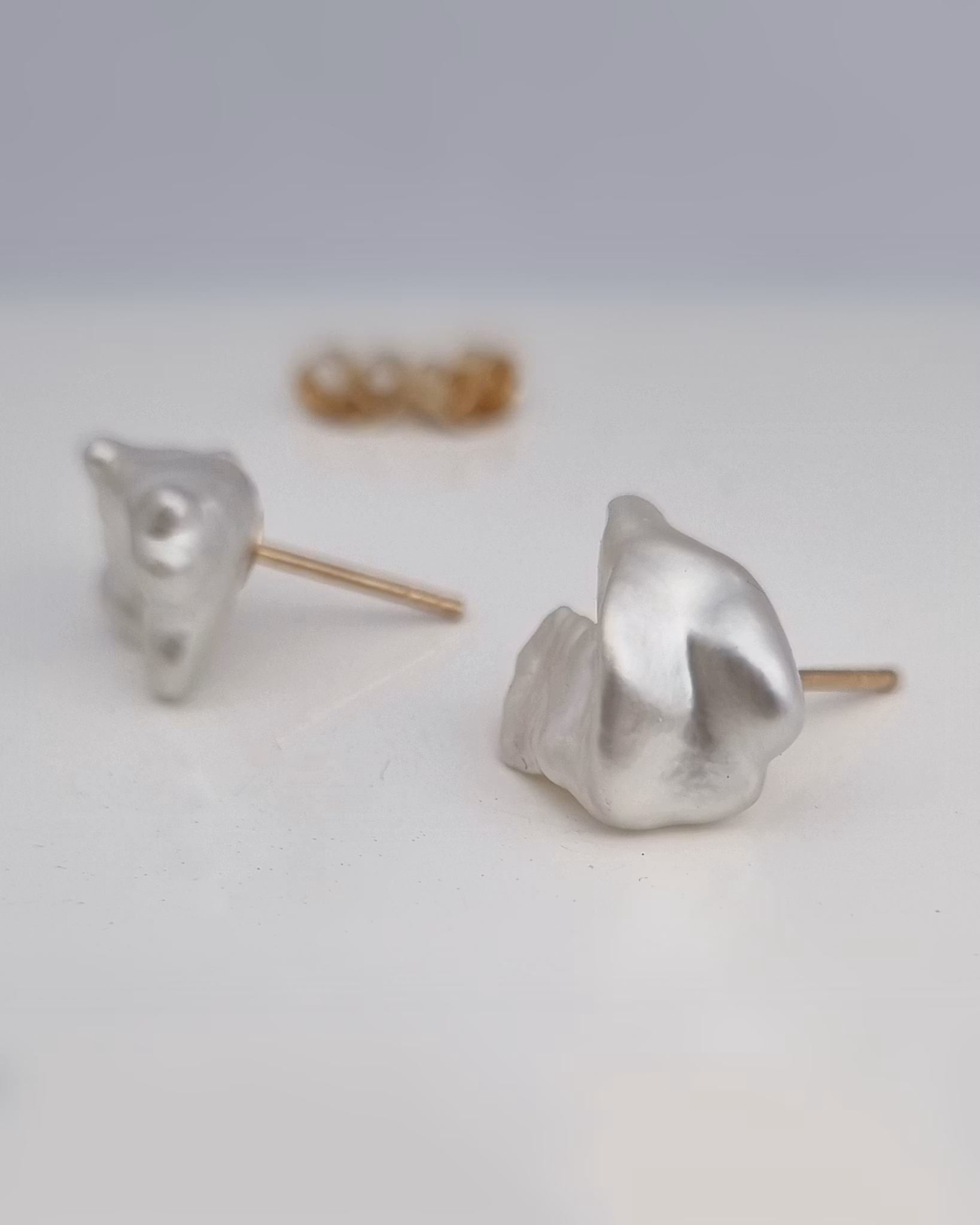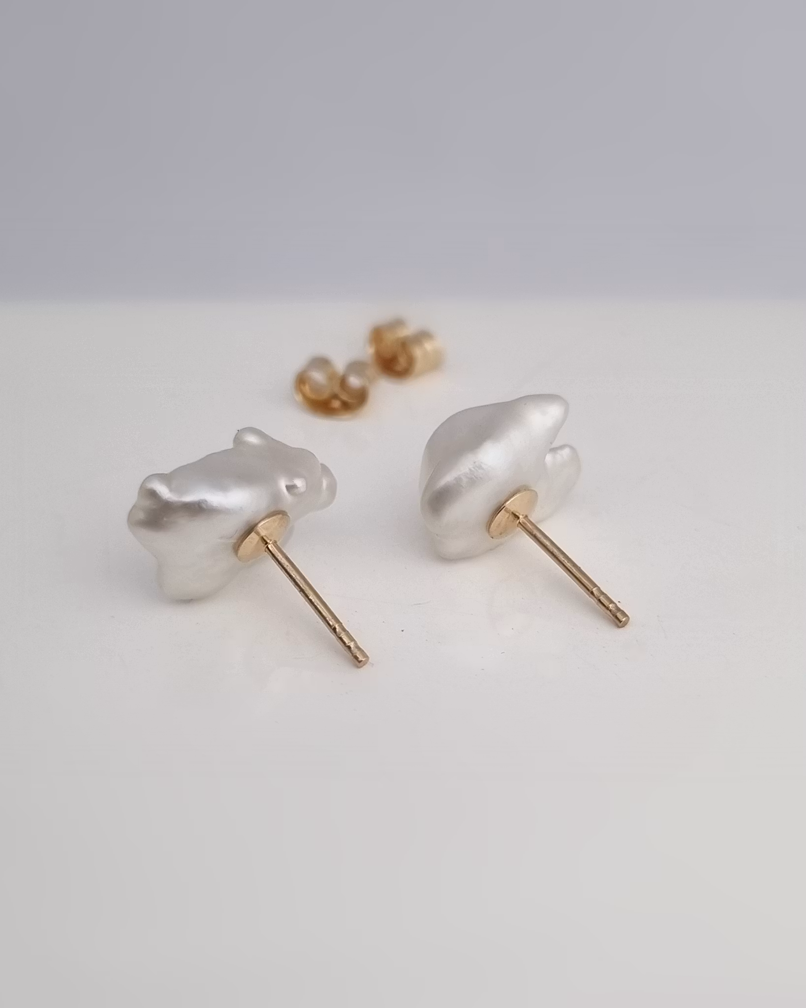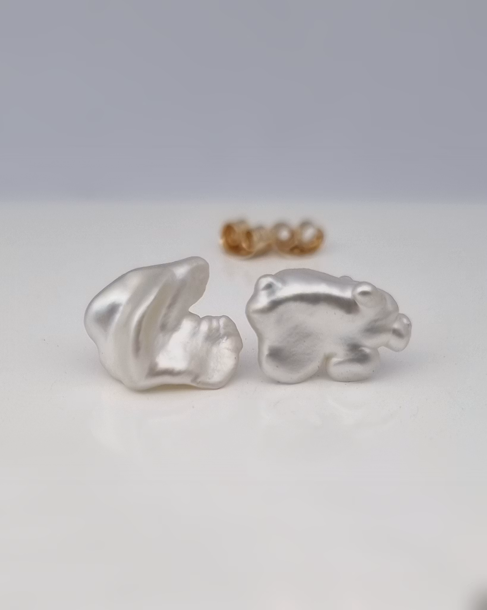 Pärlorna är unika och har en hög kvalitet (AB). Formen på Keshi är barock och dom har en mycket hög lyster som glimmar i en vacker silvervit nyans. Dessa är mycket fint matchade i storlek, lyster och nyans och paret är vackert oregelbundna såsom naturen skapat dom.