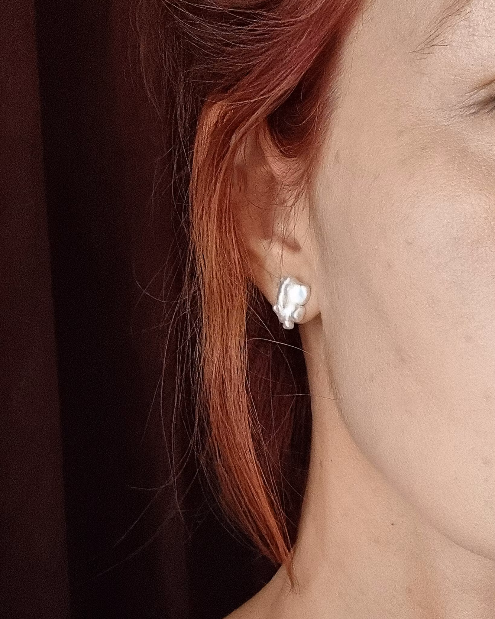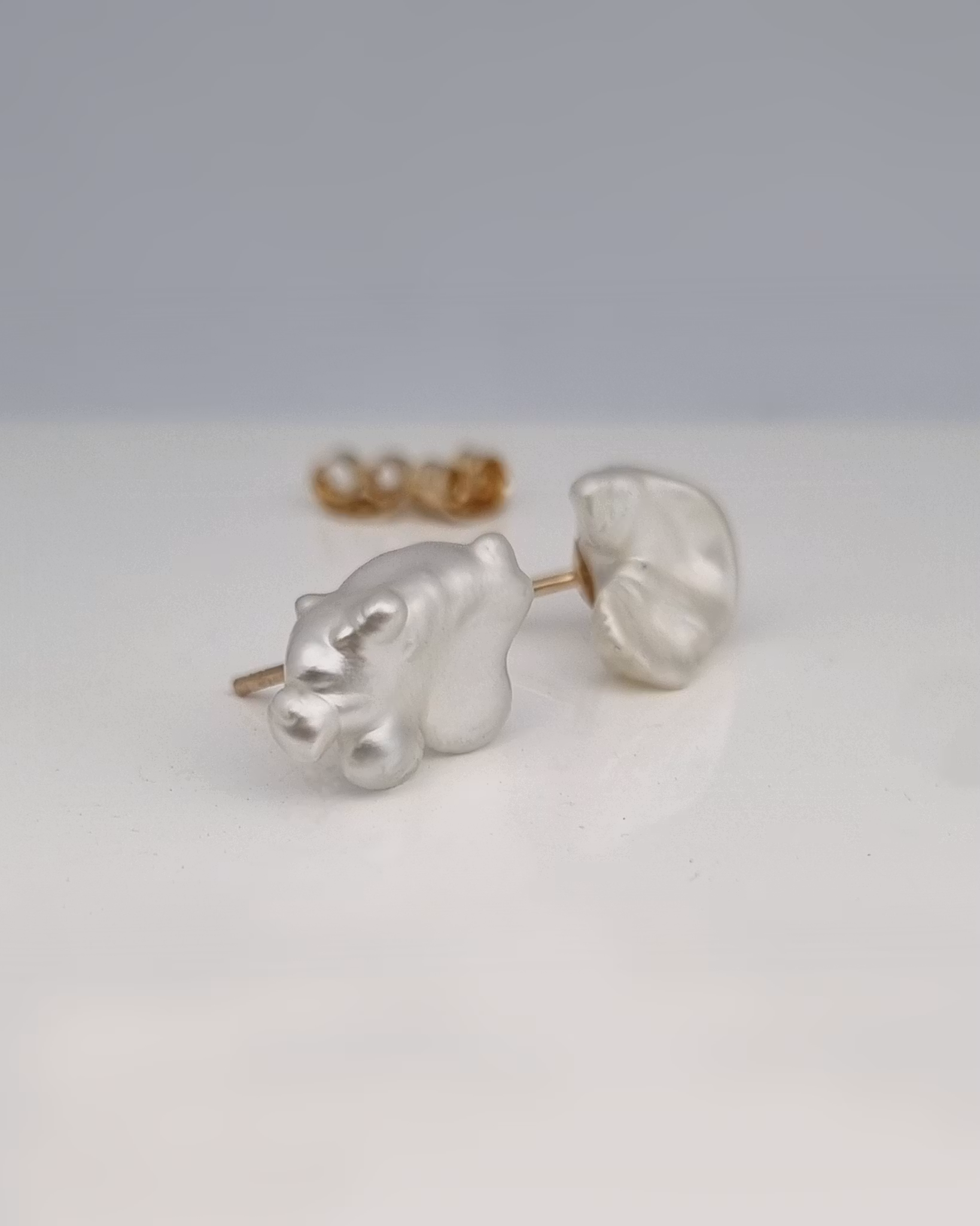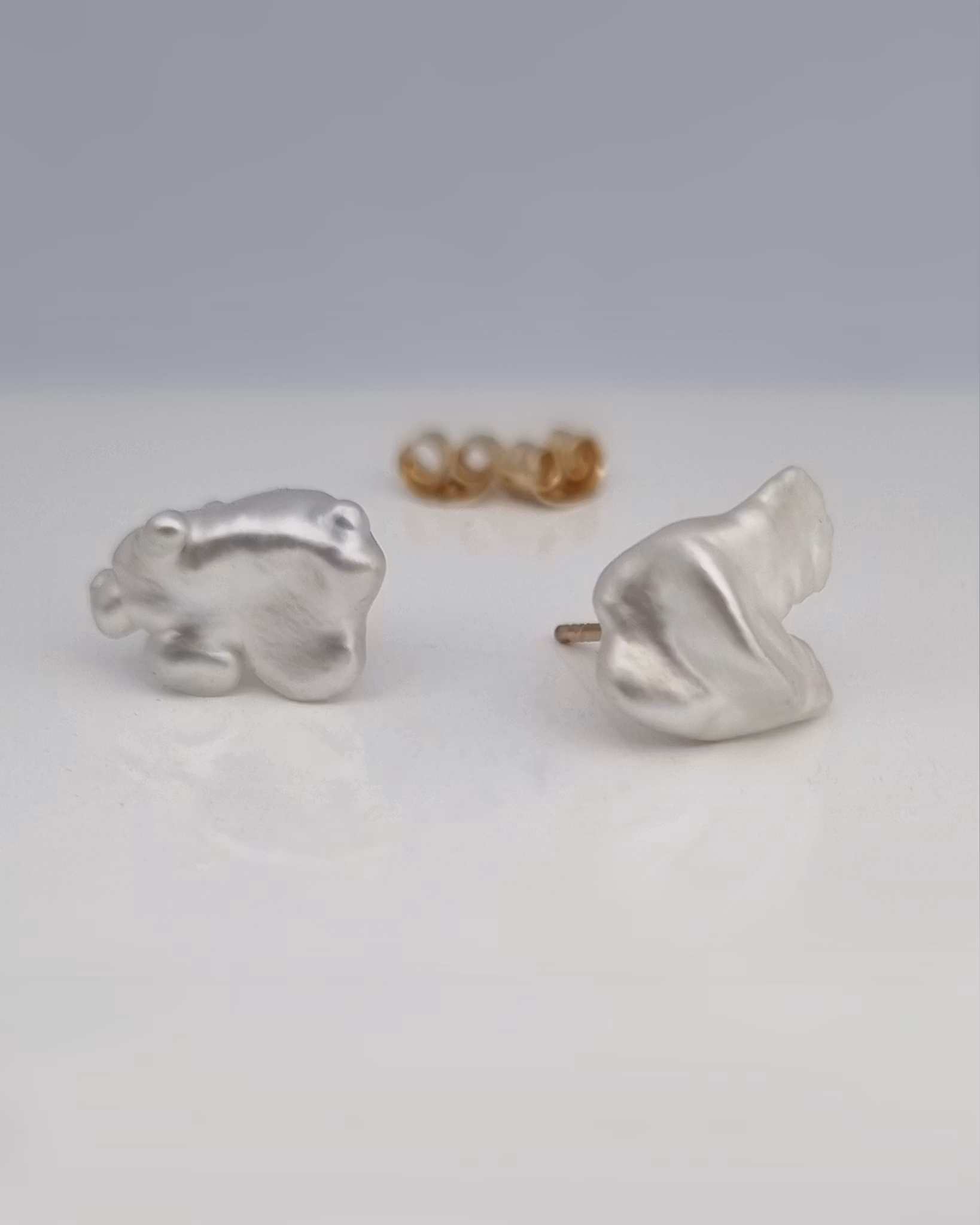 Pärlorna är unika och har en hög kvalitet (AB). Formen på Keshi är barock och dom har en mycket hög lyster som glimmar i en vacker silvervit nyans. Dessa är mycket fint matchade i storlek, lyster och nyans och paret är vackert oregelbundna såsom naturen skapat dom.