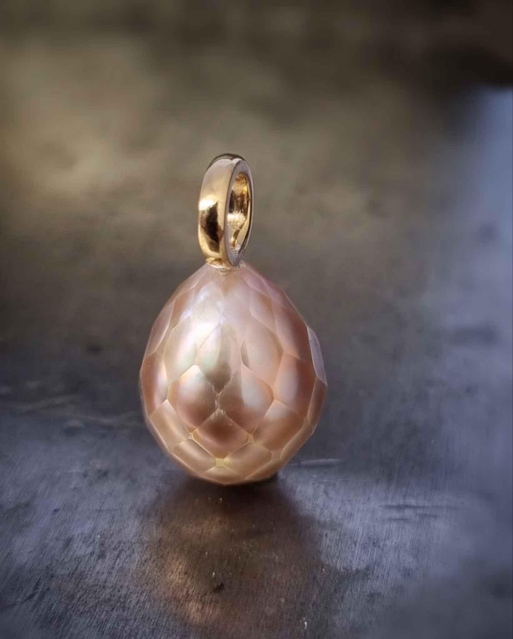 Underbart fin facettslipad sötvattenspärla i rosa nyans, A-kvalitét. Denna pärla är äkta odlad och har bearbetats genom en japansk teknik med handslipade knivskarpa facetter vilket ger den ett speciellt och unikt intryck. Den glittrar vackert och facetterna framhäver pärlans olika skikt på ett mycket tilltalande sätt! Perfekt att bära till vardags eller till fint.