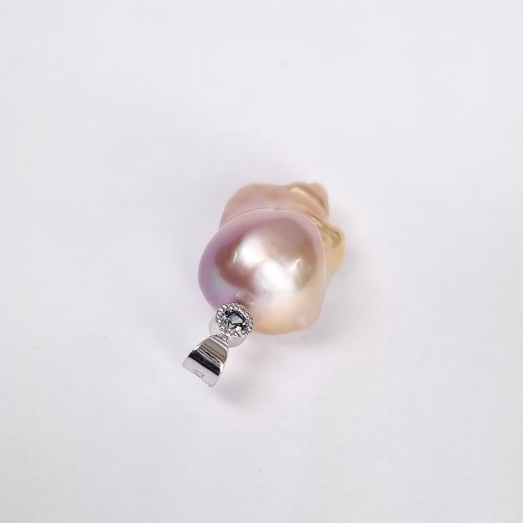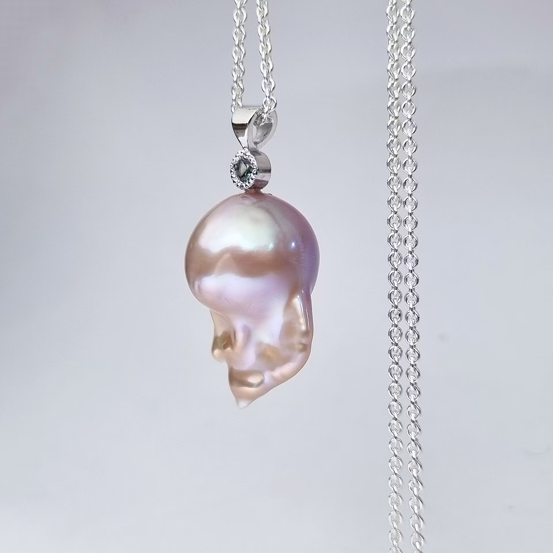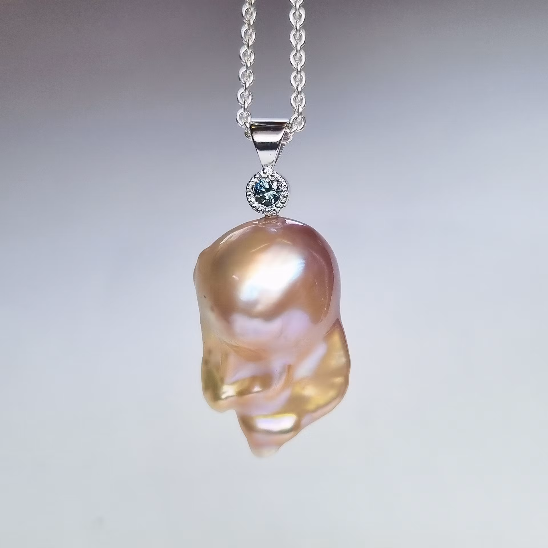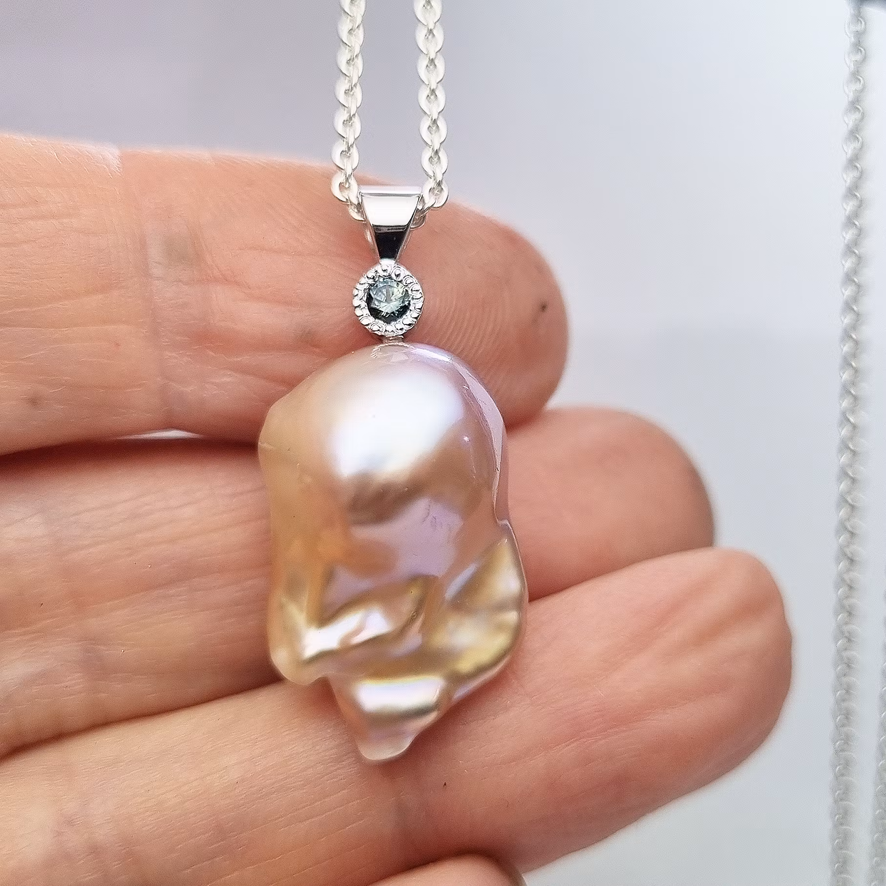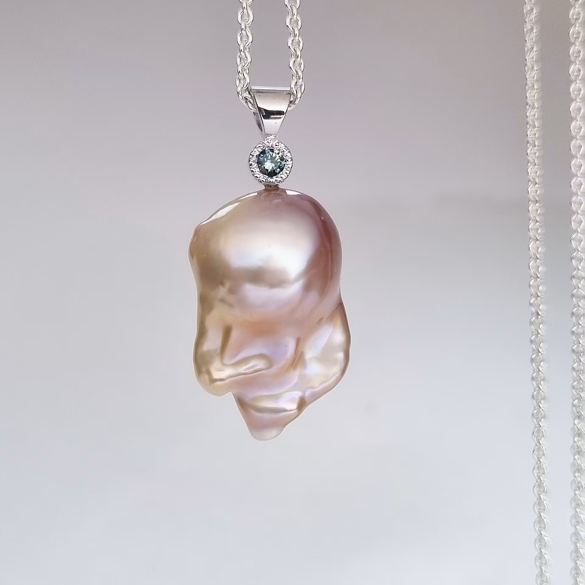 Helt underbar persikofärgad sötvattenspärla med en unik barock form. Den skimrar i ljust rosa och persikofärgade nyanser. Pärlan har en grönblå safir fattad i 18 K vitguld som accentsten. Safiren har en slät fattning med miligrif. Detta är en naturlig och obehandlad madagskarsafir som skiftar färg i olika ljus från grön till grönblå.