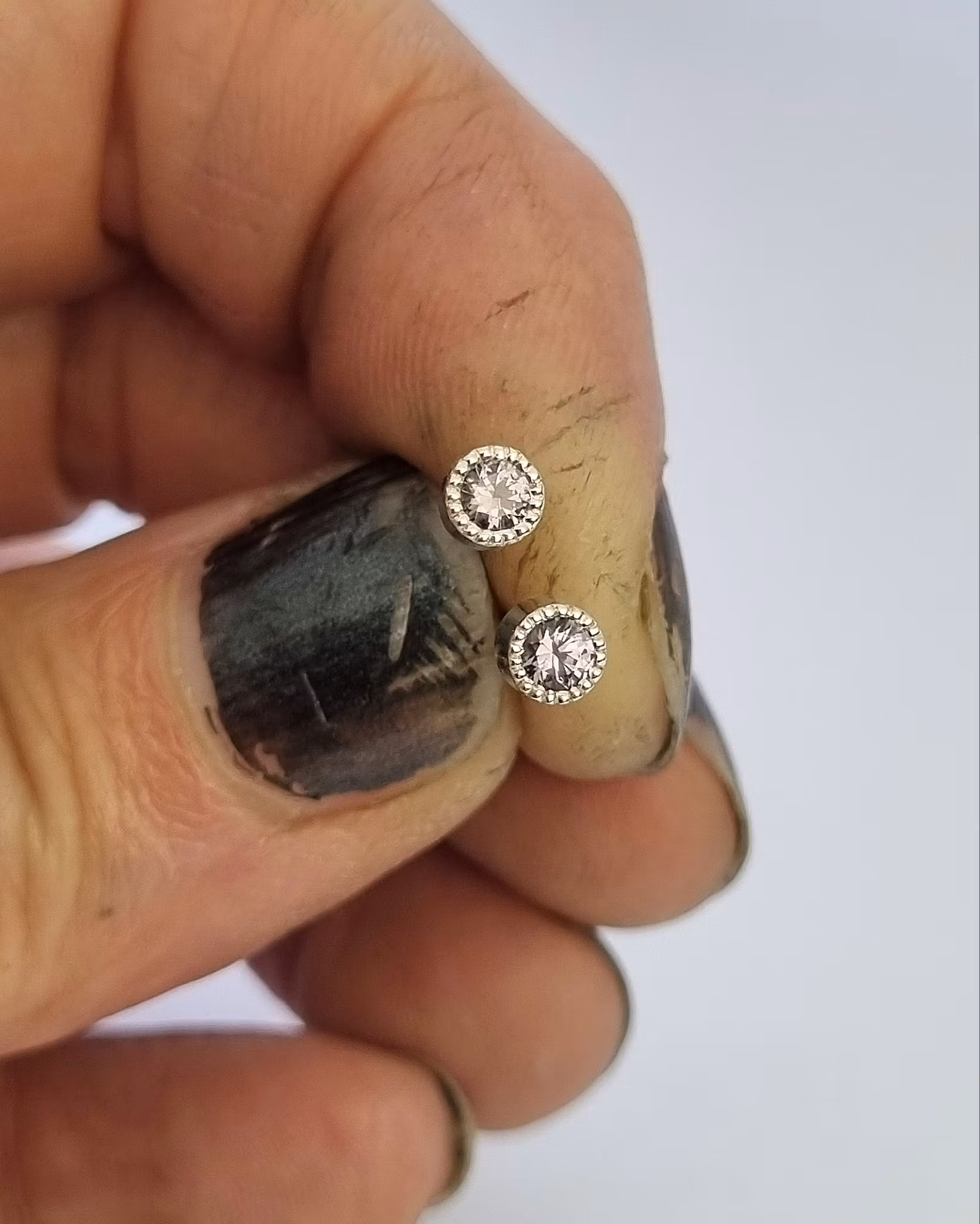 Spinellerna är Fairtrade och utvunna i Tanzania. Stenarna är briljantslipade och mäter 3 mm i diameter. Yttermåttet på fattningen är 4 mm.