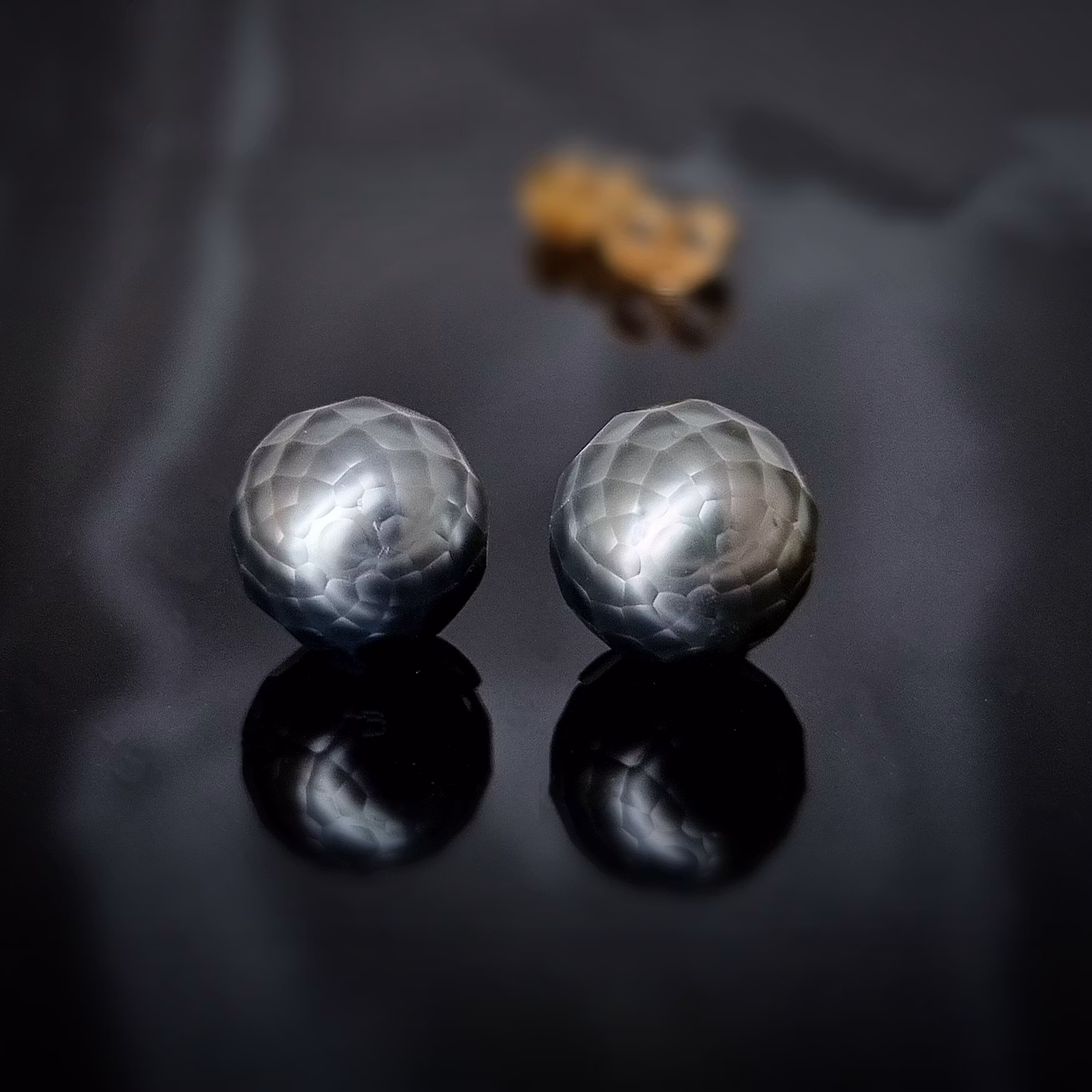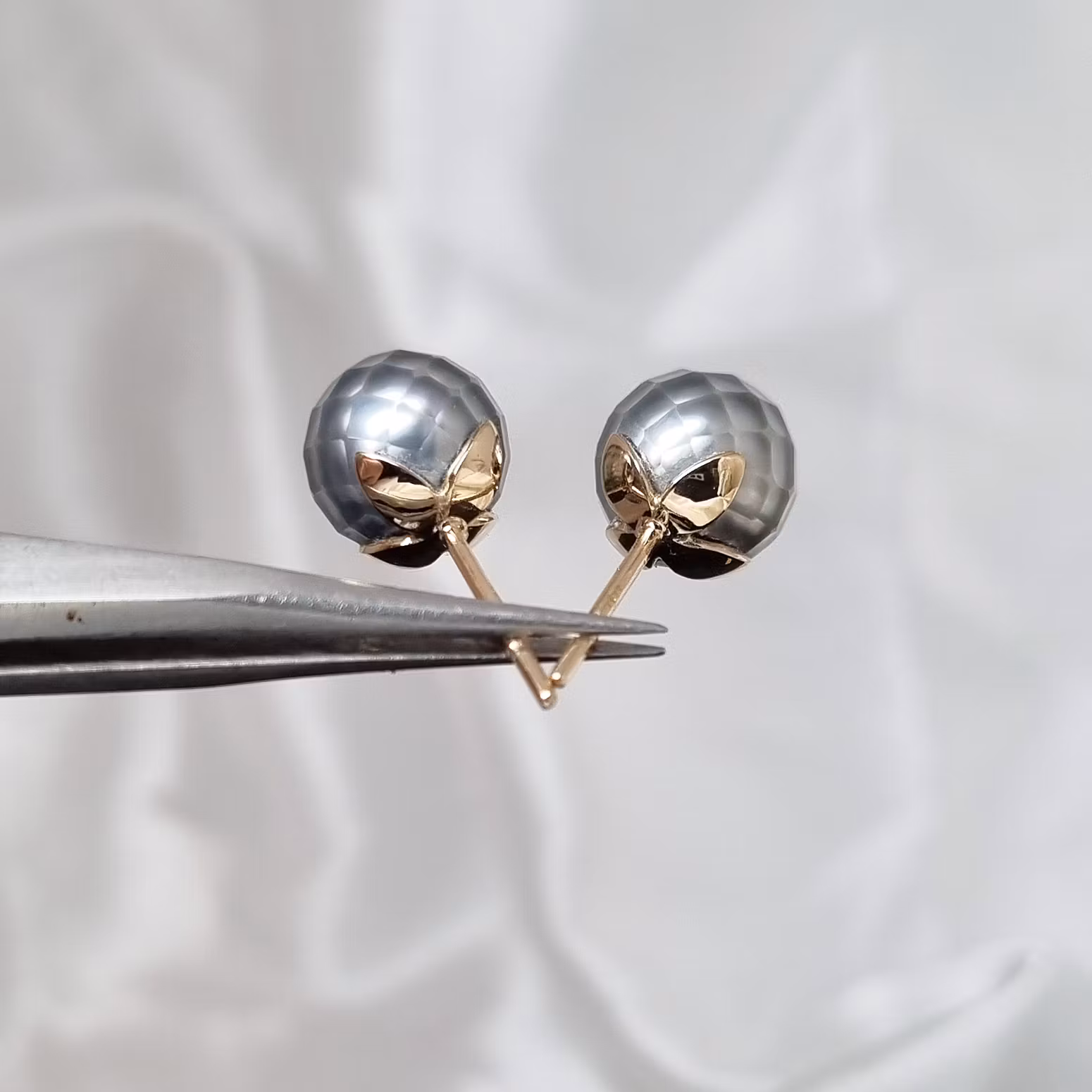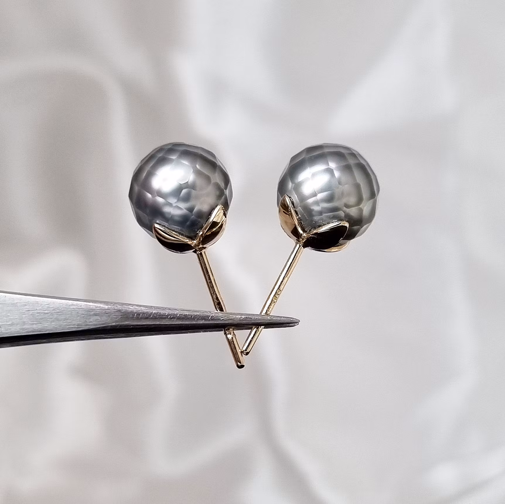 Supertrevliga ljust silvergrå Tahitipärlor med handslipade facetter som ger dom ett intressant och unikt intryck. Pärlorna sitter i lövformade skålar, helt handgjorda och i 18 K återvunnet guld. Dessa pärlor är monterade på stift med snurrebuss och mäter i diameter ca 10 mm. Facetterna gör att pärlomorskikten kommer fram på ett unikt sätt vilket ger ett slags djup i pärlan som är ovanligt att se. Det är ett fantastiskt hantverk att slipa dessa pärlor och det är en japansk konst som sker med yttersta precision och yrkeskunskap. Imponerande vackert är det!
