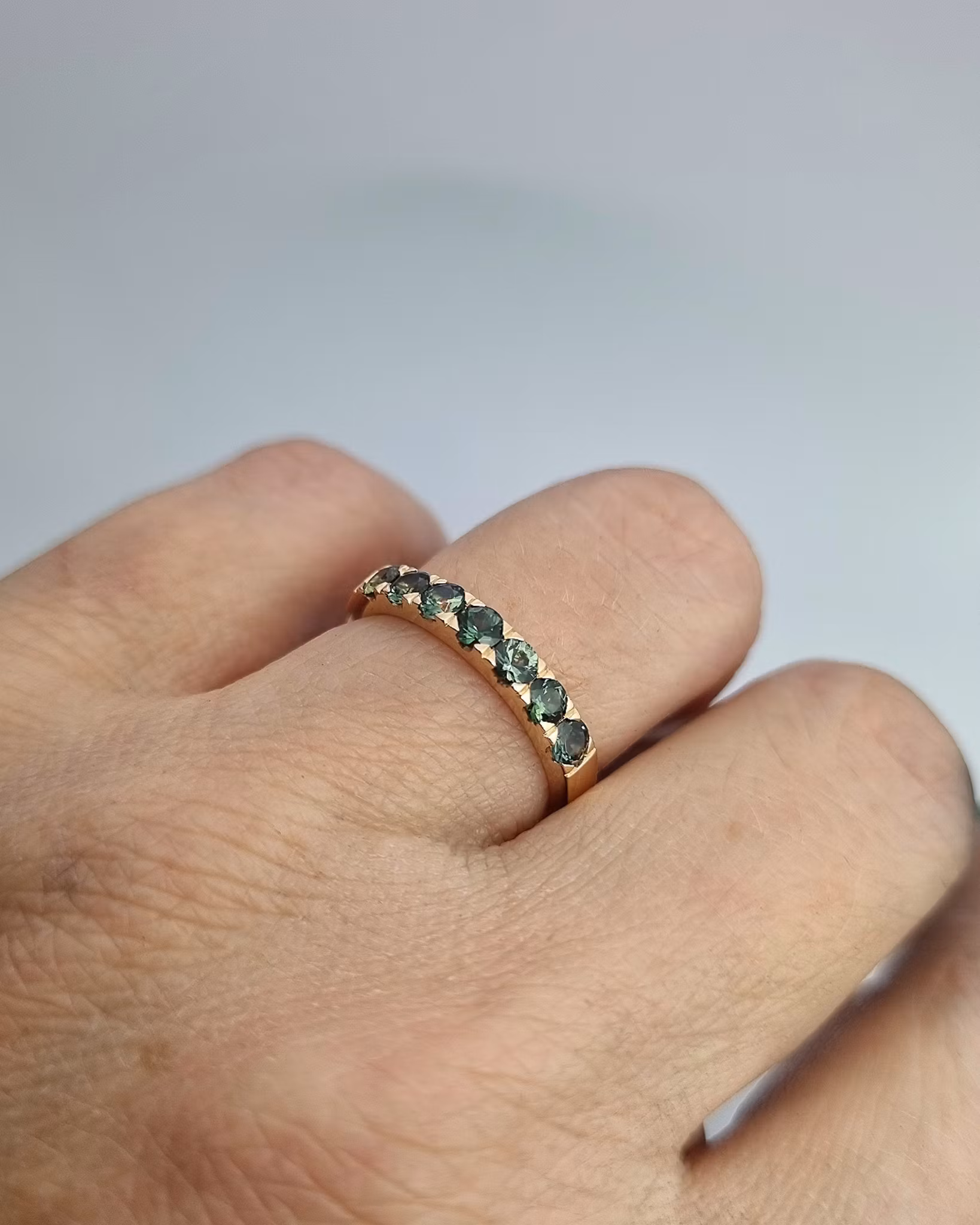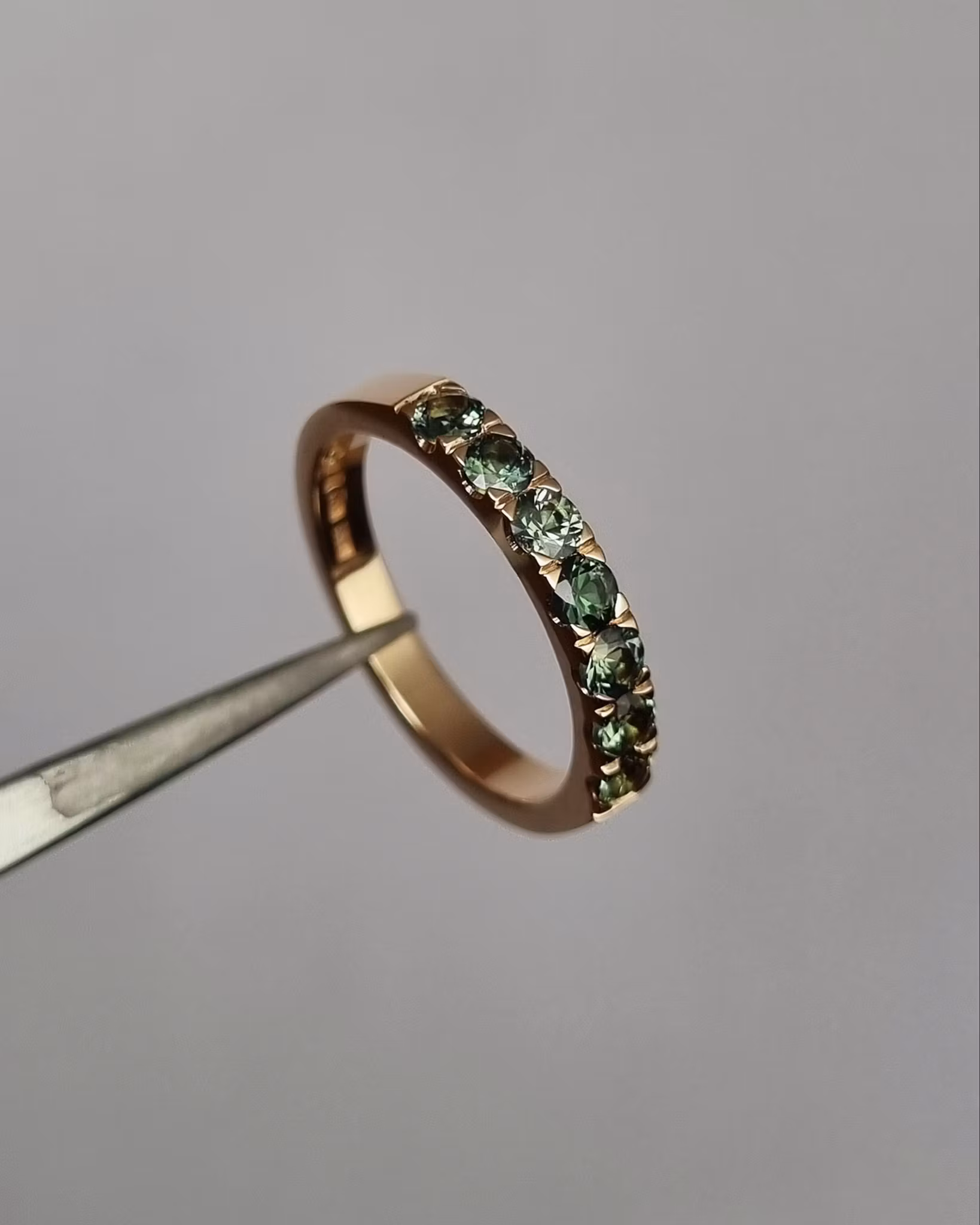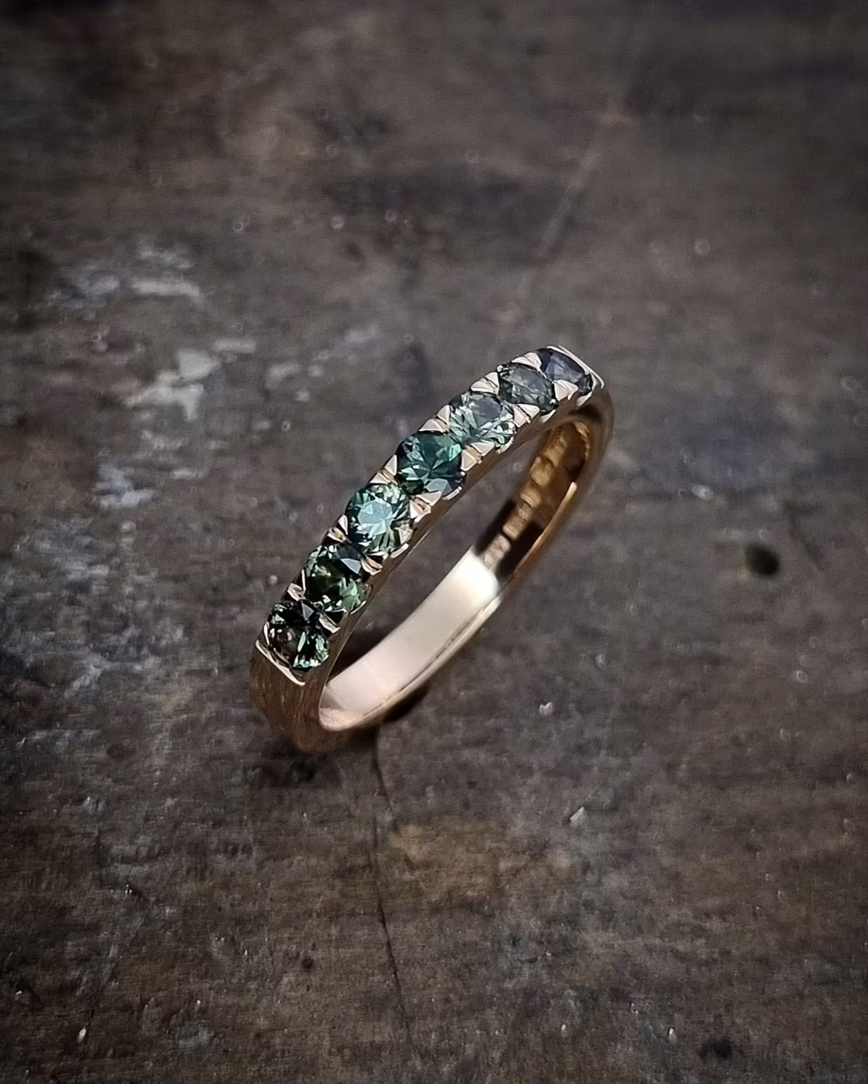 En gröngnistrig sjustensring som glittrar väldigt fint i olika skogsgröna nyanser. Ringen är handsmidd i återvunnet 18K guld och har sju st briljantslipade naturligt gröna safirer på 3 mm styck, totalt 0,87 carat. Safirerna är obehandlade och kommer från Australien. Ovanligt skarpa i färgen för att vara naturliga! En ring som är effektfull på handen såväl ensam som i kombination med andra ringar. ♡