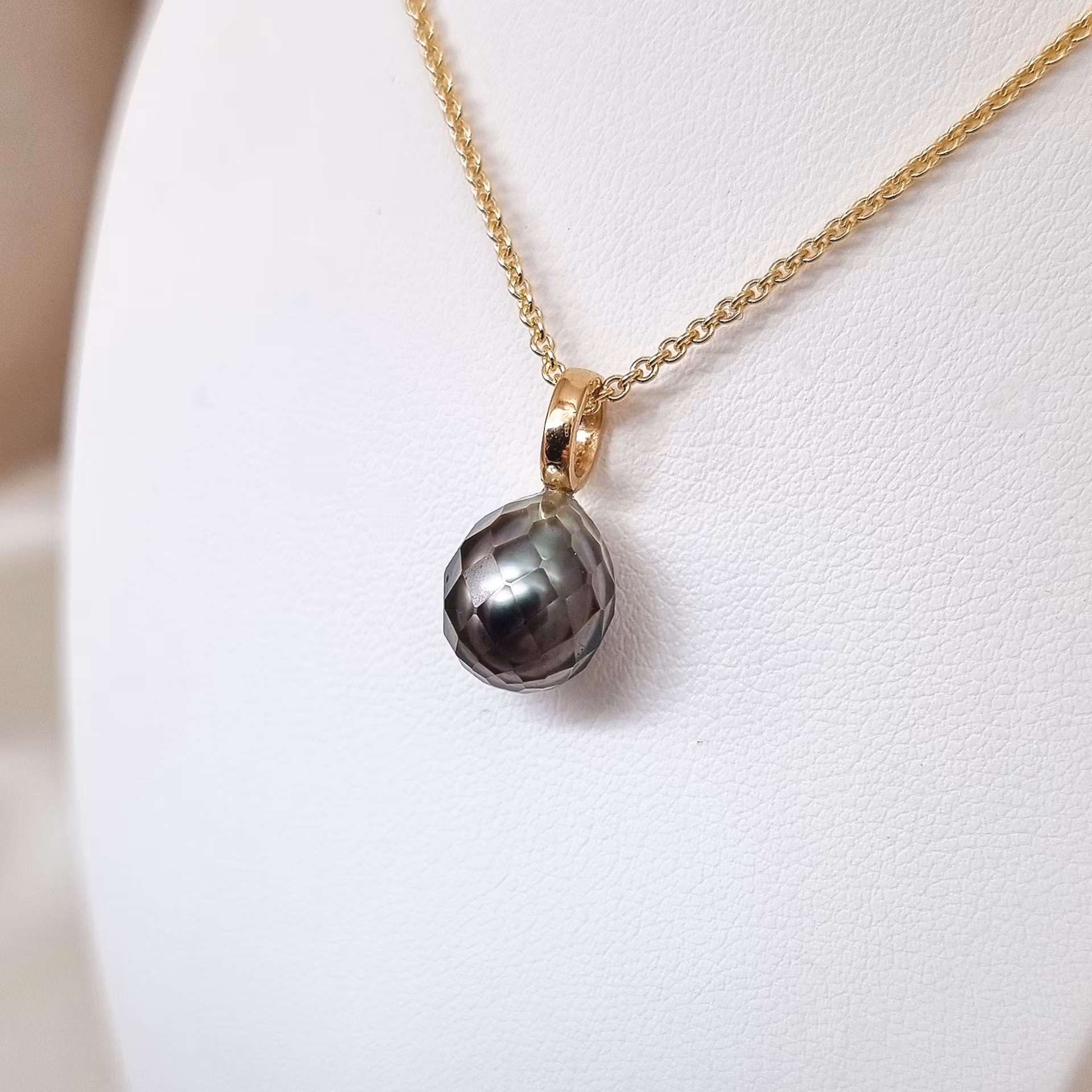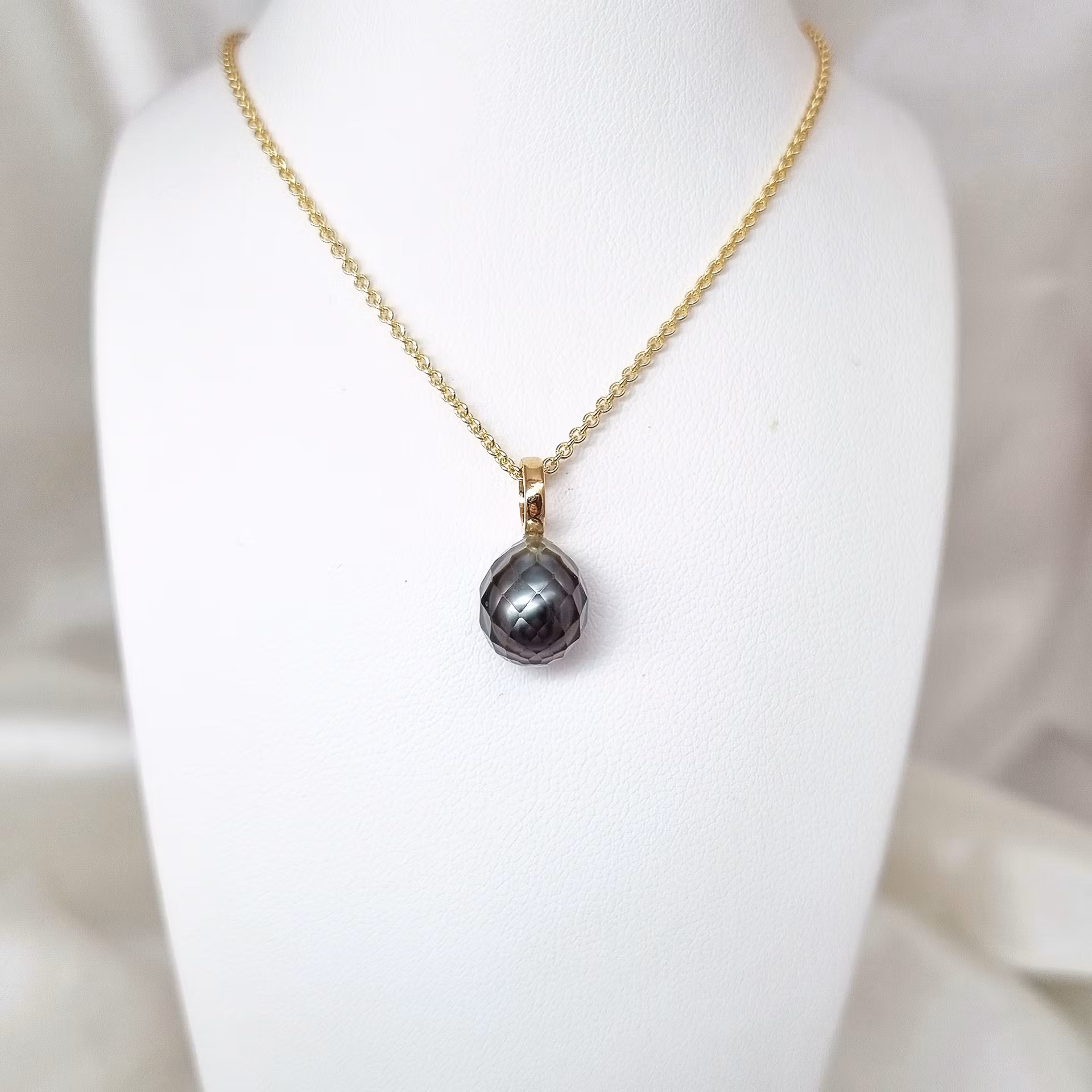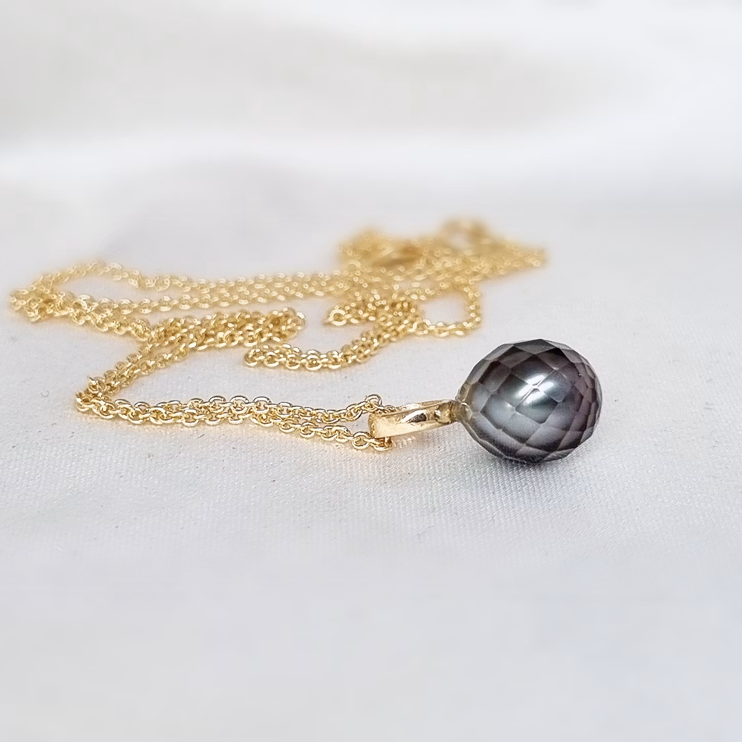 Tonad Tahitipärla med facetter, perfekt för halsgropen med sin nätta storlek och underbara lyster. Handslipade facetter på Tahitipärlor är ovanligt och de japanska slipare som arbetat fram just denna skönhet är i världsklass med sin knivskarpa teknik.