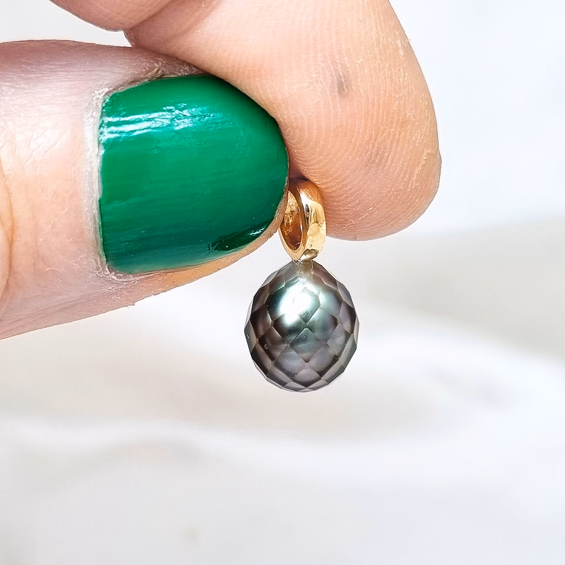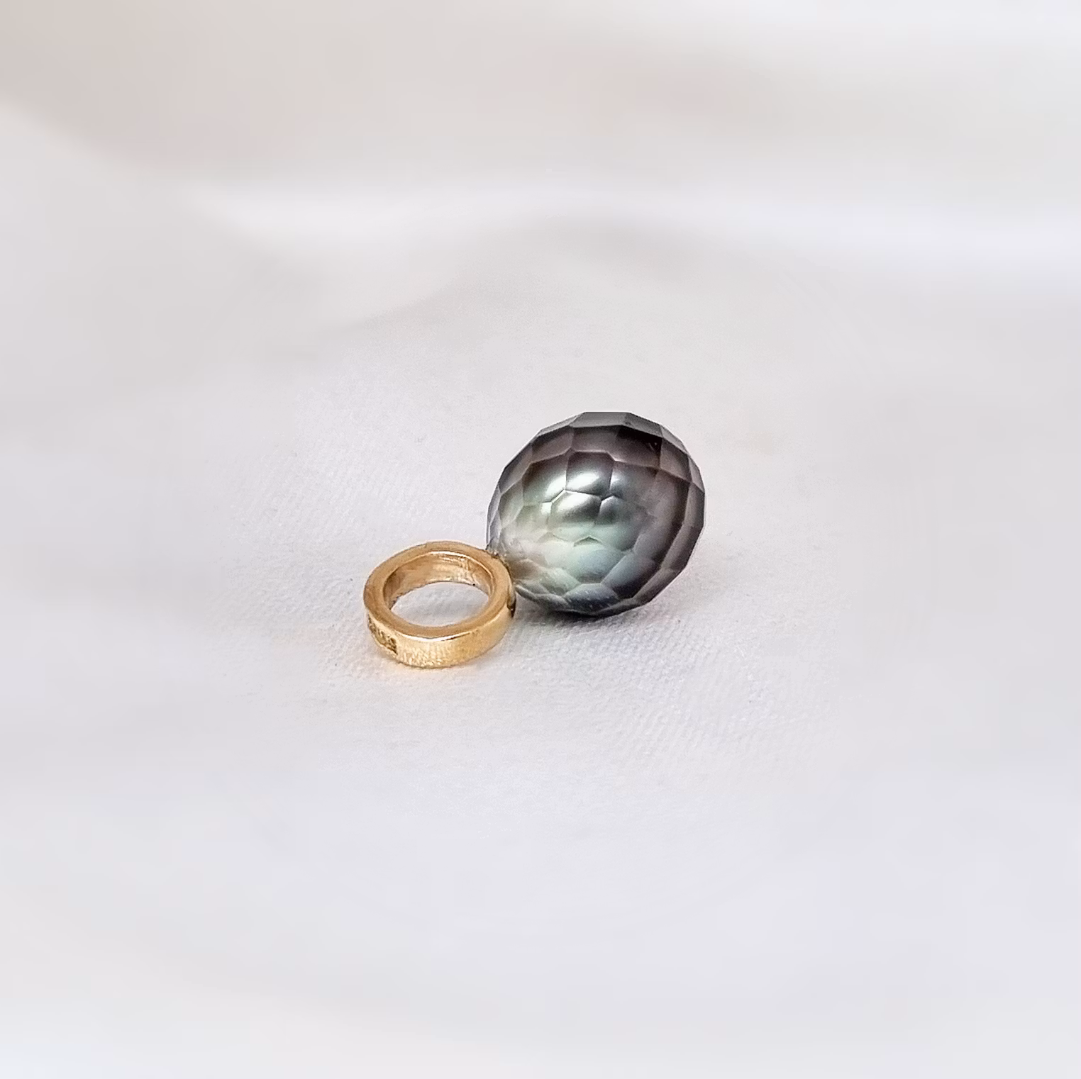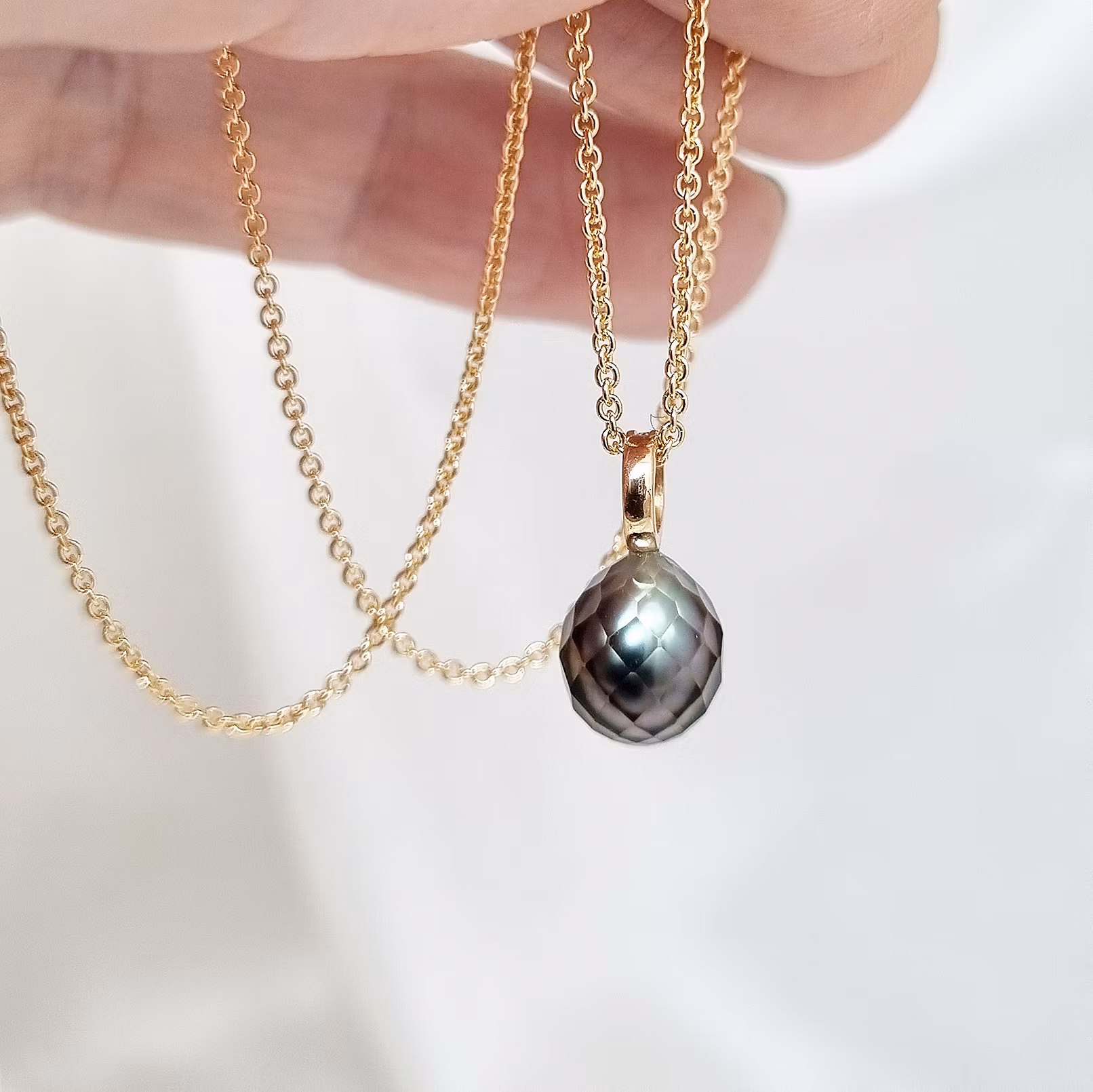 Tonad Tahitipärla med facetter, perfekt för halsgropen med sin nätta storlek och underbara lyster. Handslipade facetter på Tahitipärlor är ovanligt och de japanska slipare som arbetat fram just denna skönhet är i världsklass med sin knivskarpa teknik.
