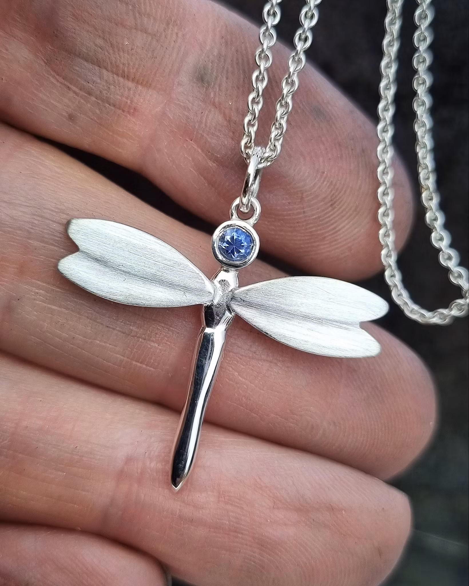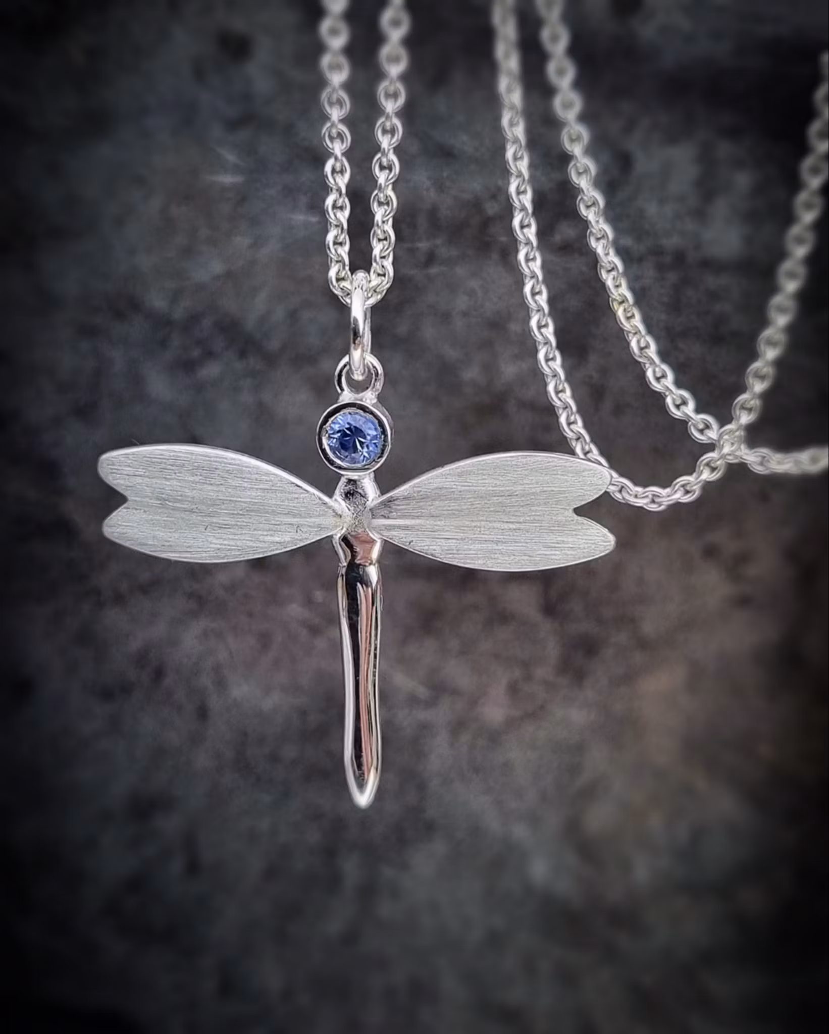 Slända i återvunnet sterling silver med en äkta blå safir, briljantslipad och 3 mm i diameter. Mått på hängsmycket är ca 26 x 28 mm.