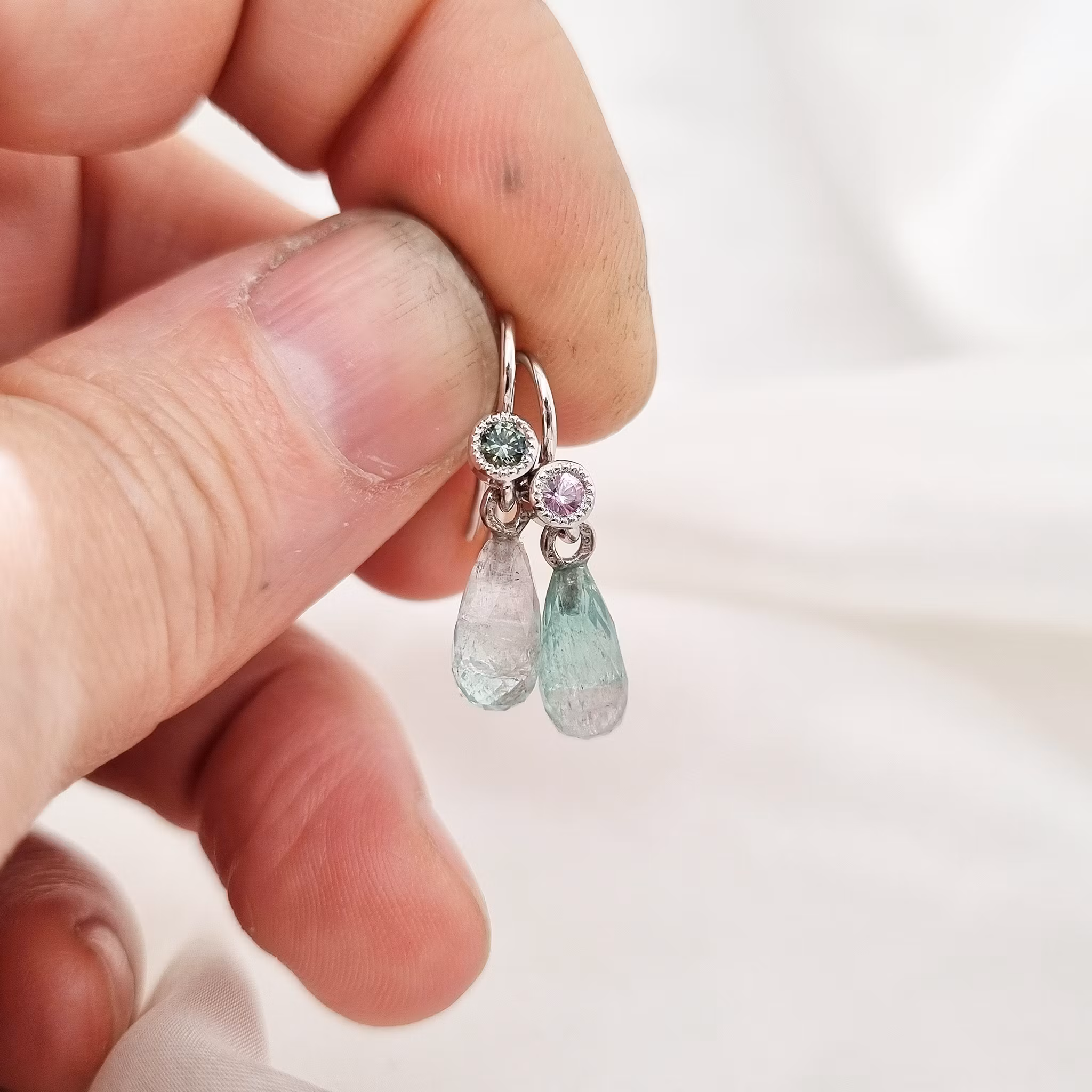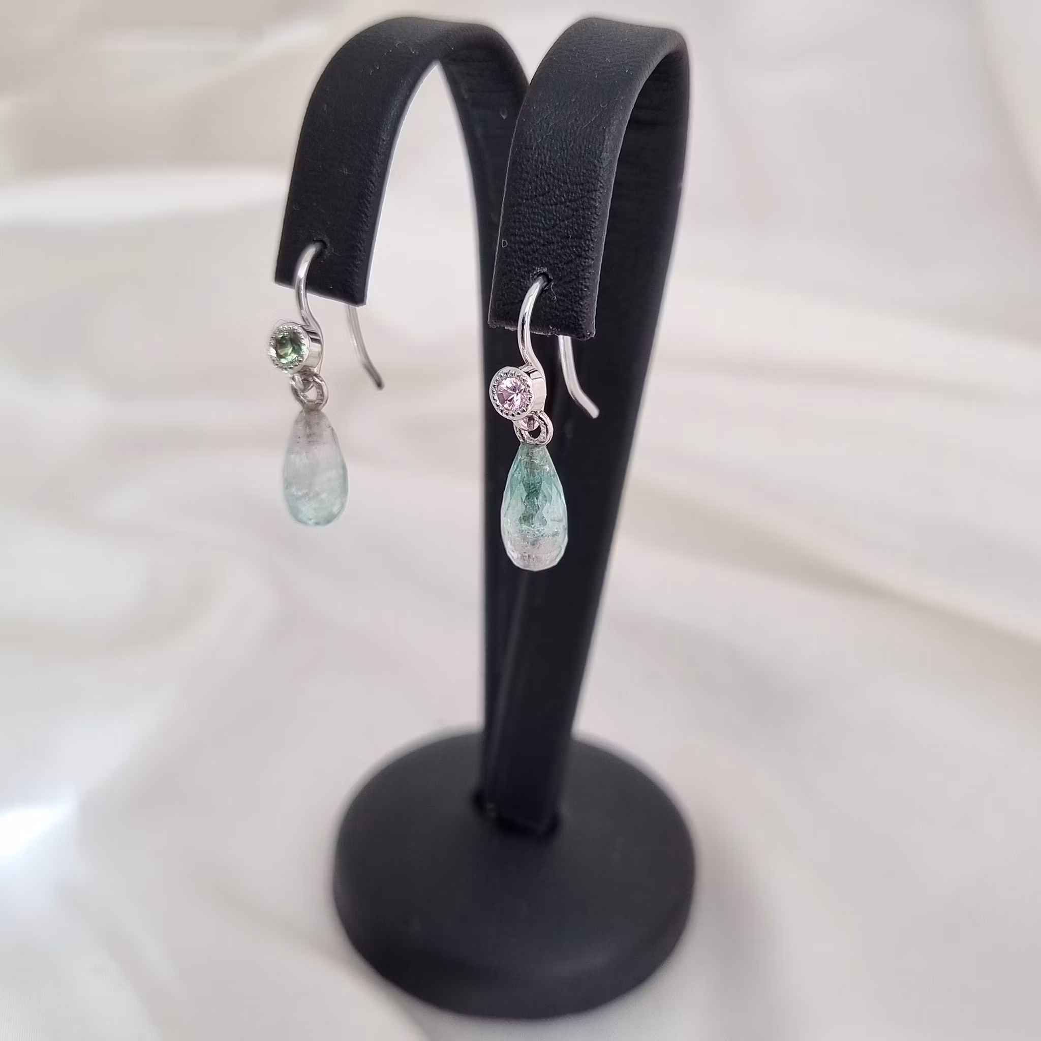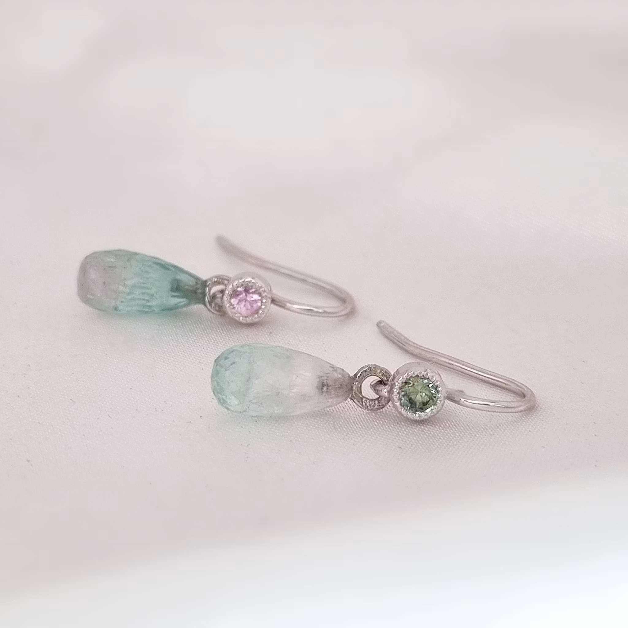 Ett udda par örhängen som ändå matchar. Fairtrade Bicolour vattenmelonturmalin ackompanjerade med en rosa och en grön safir, naturliga och obehandlade från Madagaskar. Underbar kombination! Örhängena är handgjorda i 18 K återvunnet vitguld.