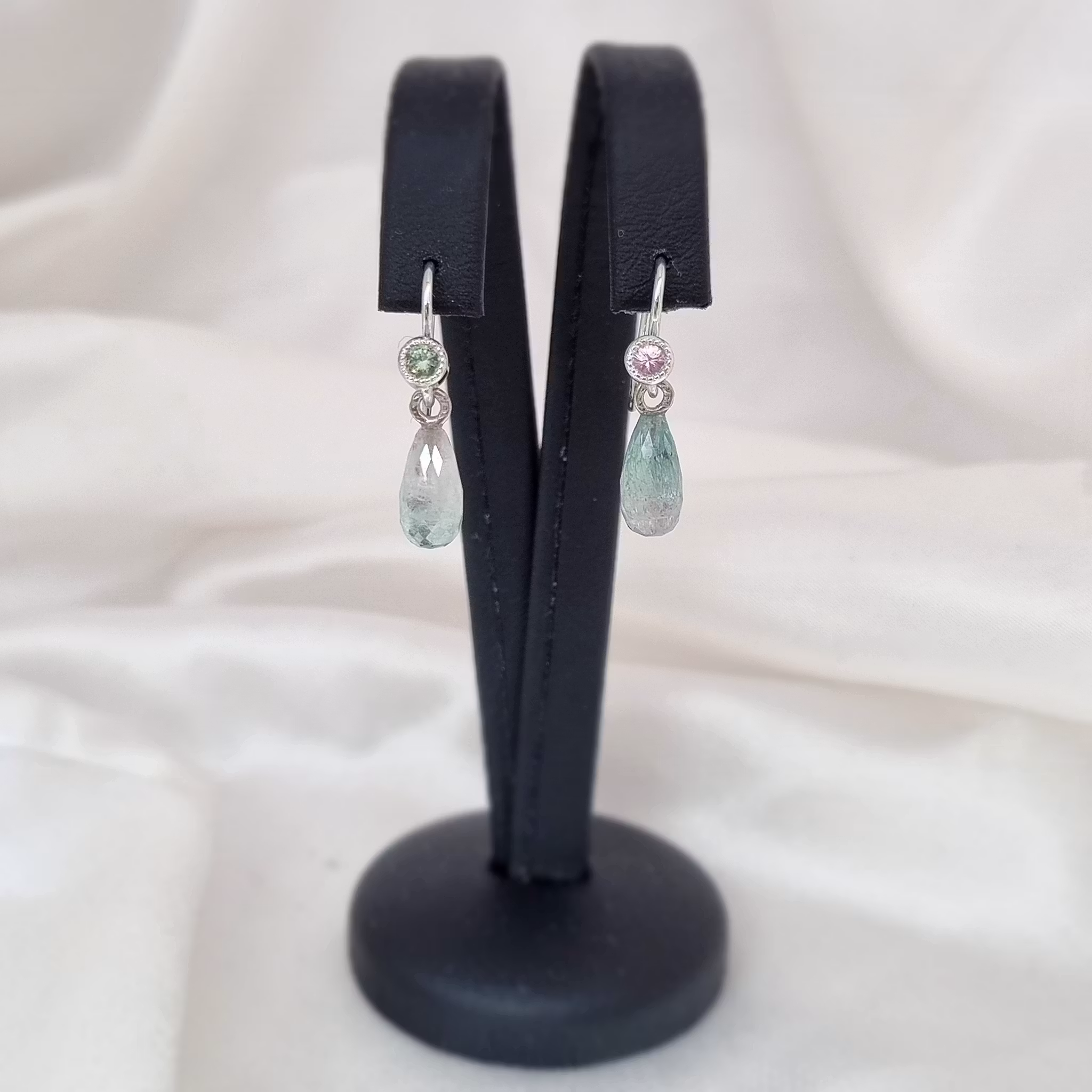Brioletterna mäter 5 x 10 mm och safirerna är 2,9 mm i diameter. Hela örhänget inkl kroken mäter ca 24 mm.