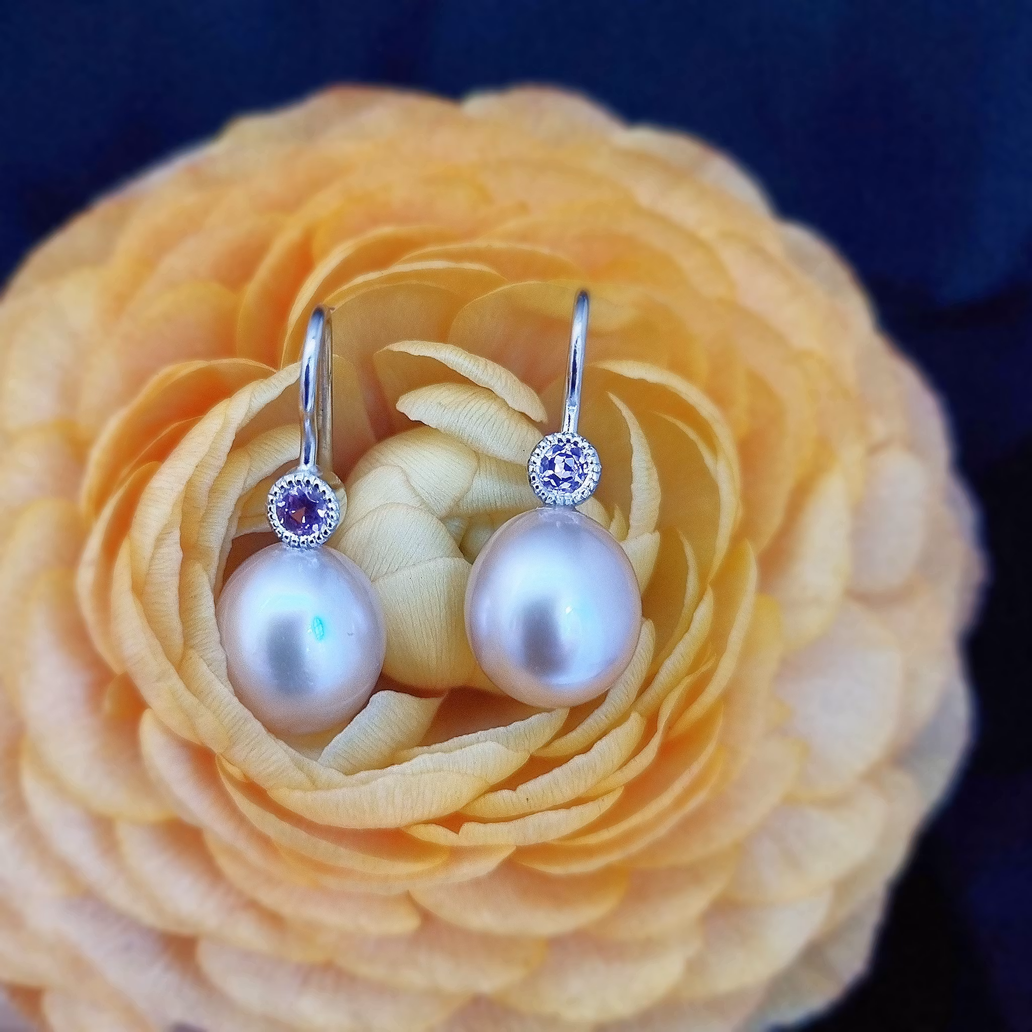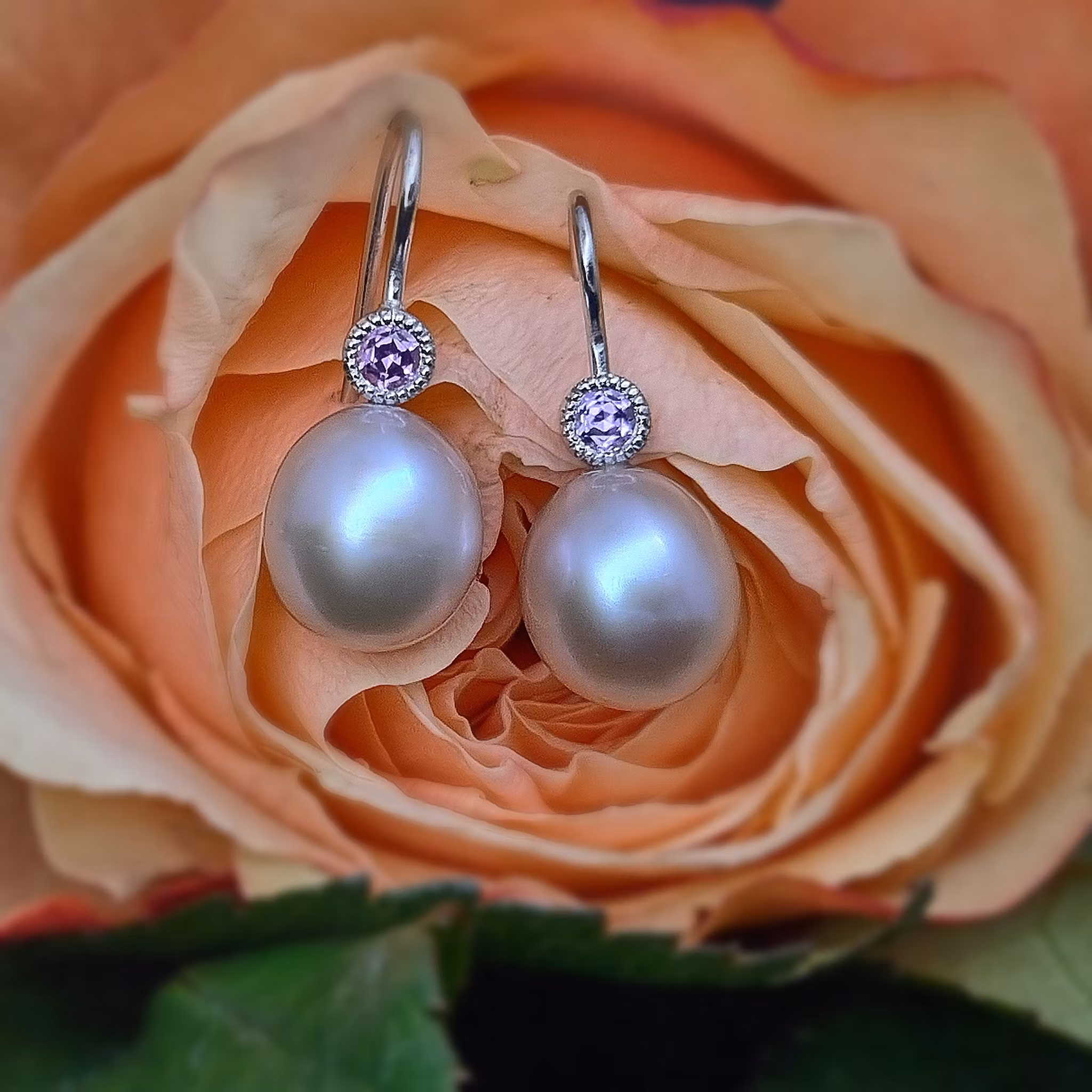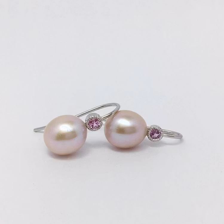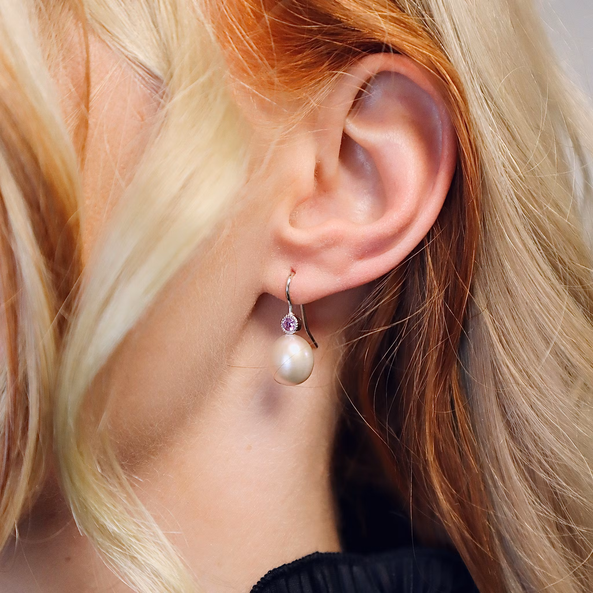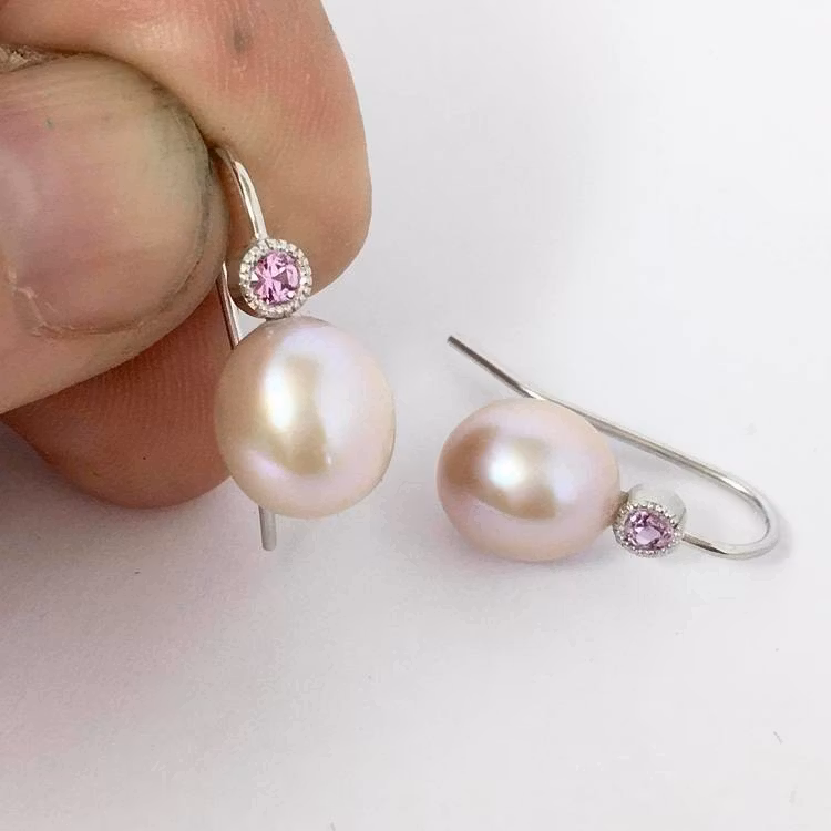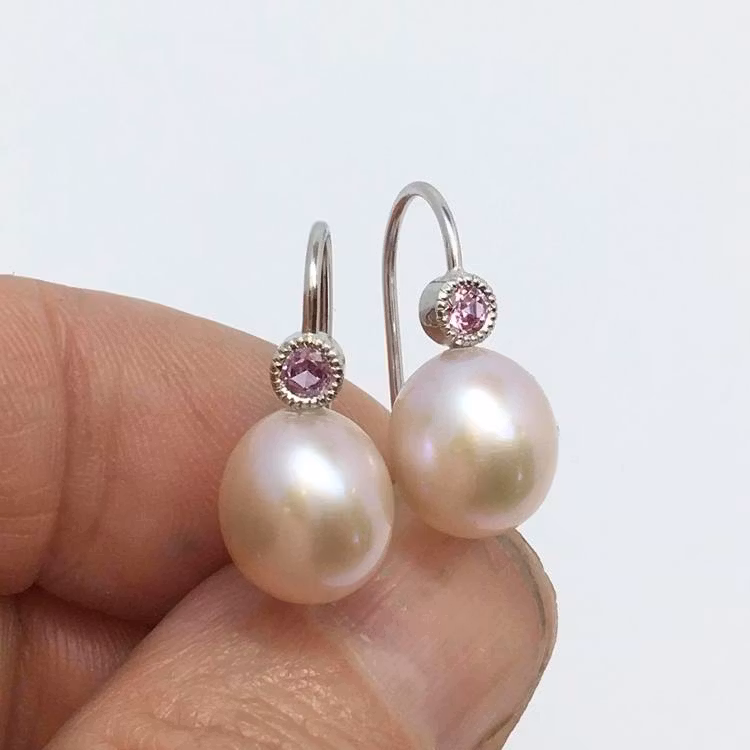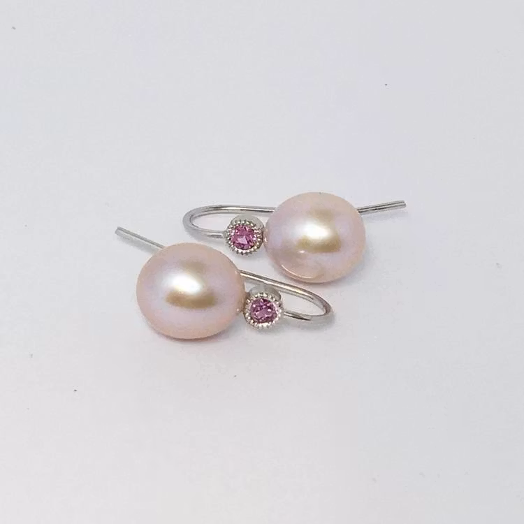 Underbara persikorosa pärlor som håller ett par 2,9 mm rosenslipade rosa madagaskarsafirer sällskap. Den söta kanten på fattningen är inspirerad av Art Nouveau och designen ger en känsla av vintage. Dessa örhängen är handgjorda i 18 K vitguld med sötvattenspärlor som mäter ca 9.5 mm över ’midjan’. Passar perfekt både till vardags och till fint. Rosa safirer och pärlor är verkligen en sockersöt kombination i vitguld. ♡