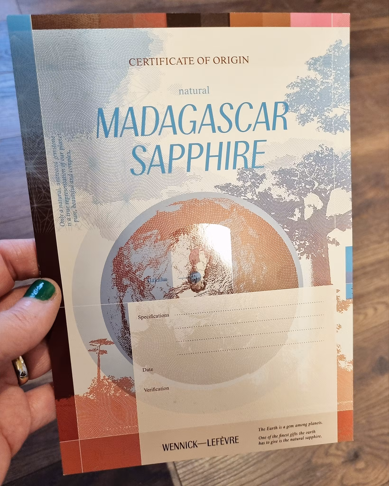 Safiren är droppformad och facettslipad och etiskt utvunnen från Madagaskar. Vid köp medföljer ett certifikat. Smyckesentusiaster och "ädelstensnördar" känner till att just naturligt violetta Safirer är sällsynta och mer exklusiva än andra färger. En ovanlig och superfin ädelsten!