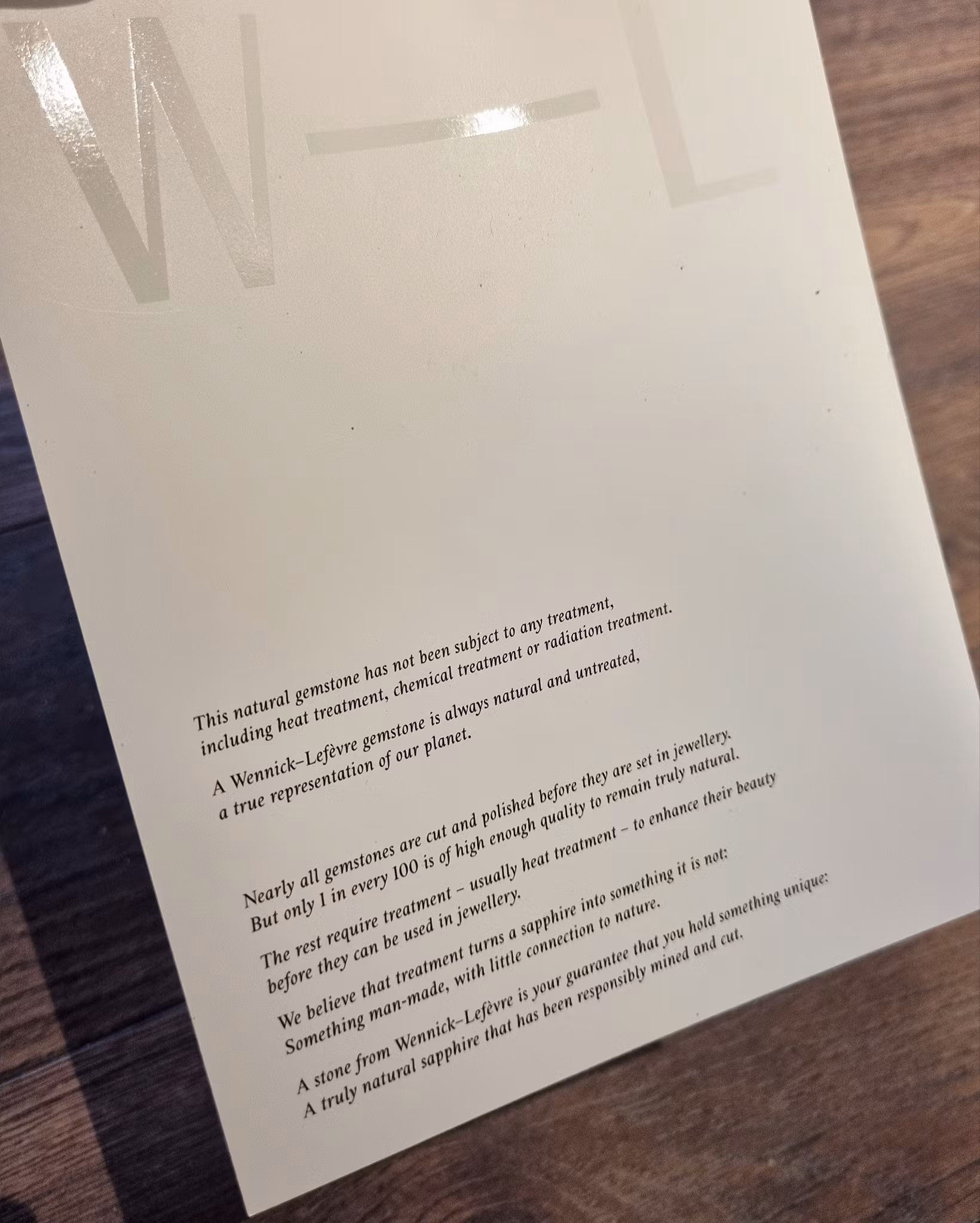 Den är helt naturlig och obehandlad vilket gör att den kan byta färg i olika ljus. Den är framförallt starkt violett och drar mot kall blålila nyans. Safiren bjuder på en fantastisk lyster och gnistrar vackert irl!
