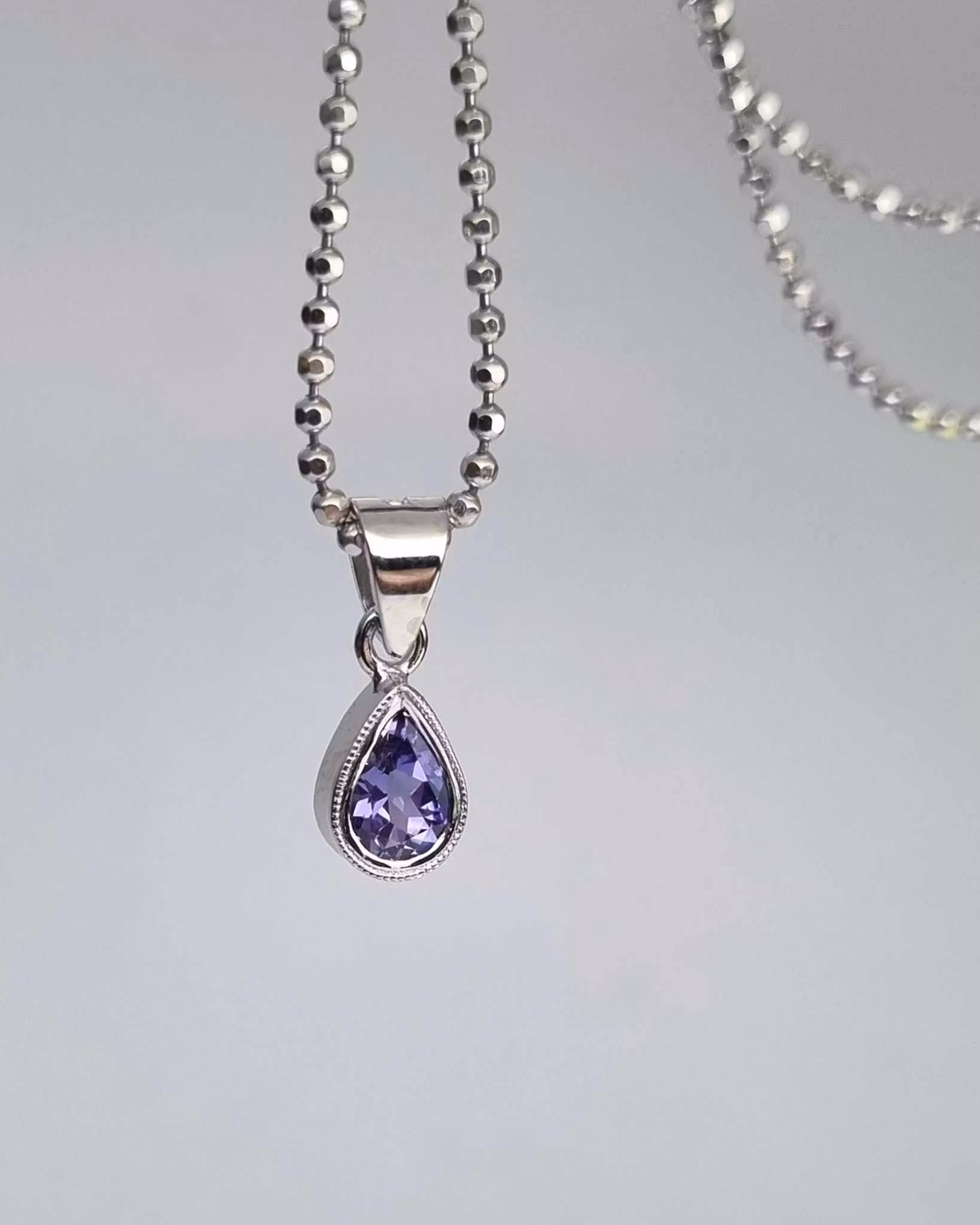 Handgjort hängsmycke i 18K återvunnet vitguld med en unik naturlig Safir i dov antikviolett. Fattningen är slät med en snygg miligrifkant. Det perfekta vardagssmycket att ha i halsgropen, ensam eller i kombination med flera andra halsband.