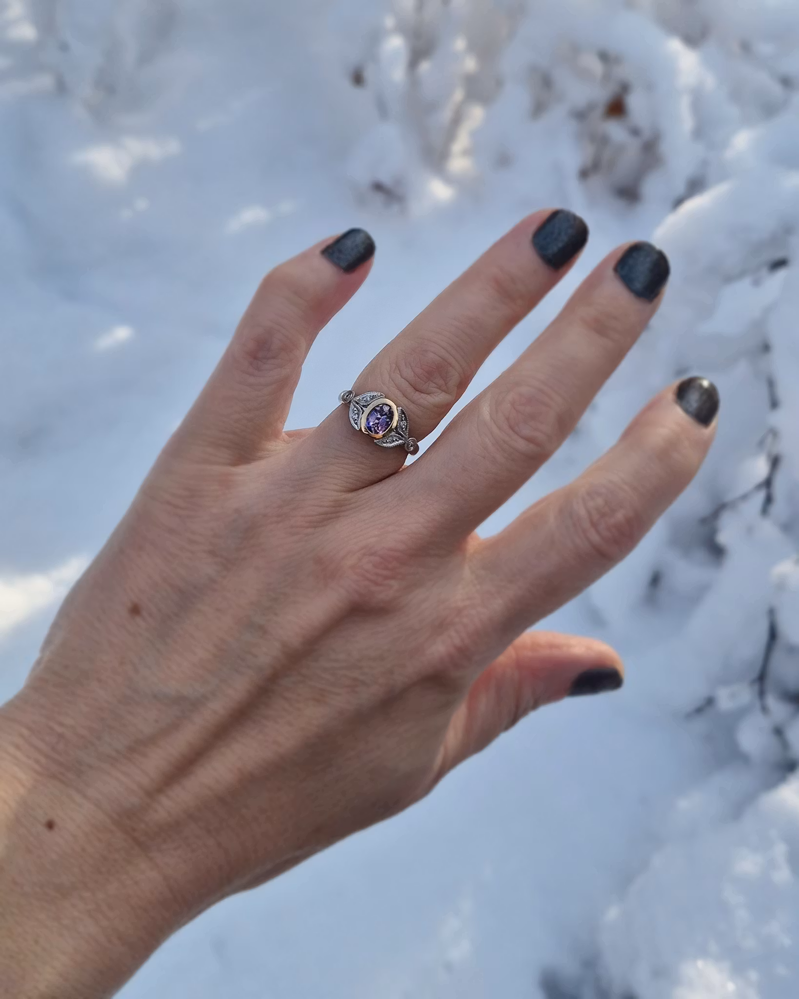 En fantastisk tvåfärgad Safir från Nivithigala Sri Lanka, fattad i 18K återvunnet rödguld med skena och detaljer i vitguld. På sidorna sitter 6 st återvunna vita briljanter wsi á 0,01 ct, eco natural. Safiren väger 1,09 ct och är etiskt utvunnen. Den har en speciell färg som skiftar mellan rosa, lila och blå. Det är vackra rutiler inuti stenen och den har en mycket hög lyster. Bilder gör inte denna safir rättvisa! Ringen är vintageinspirerad i modellen och kantad med miligrif för en trevlig antik känsla.