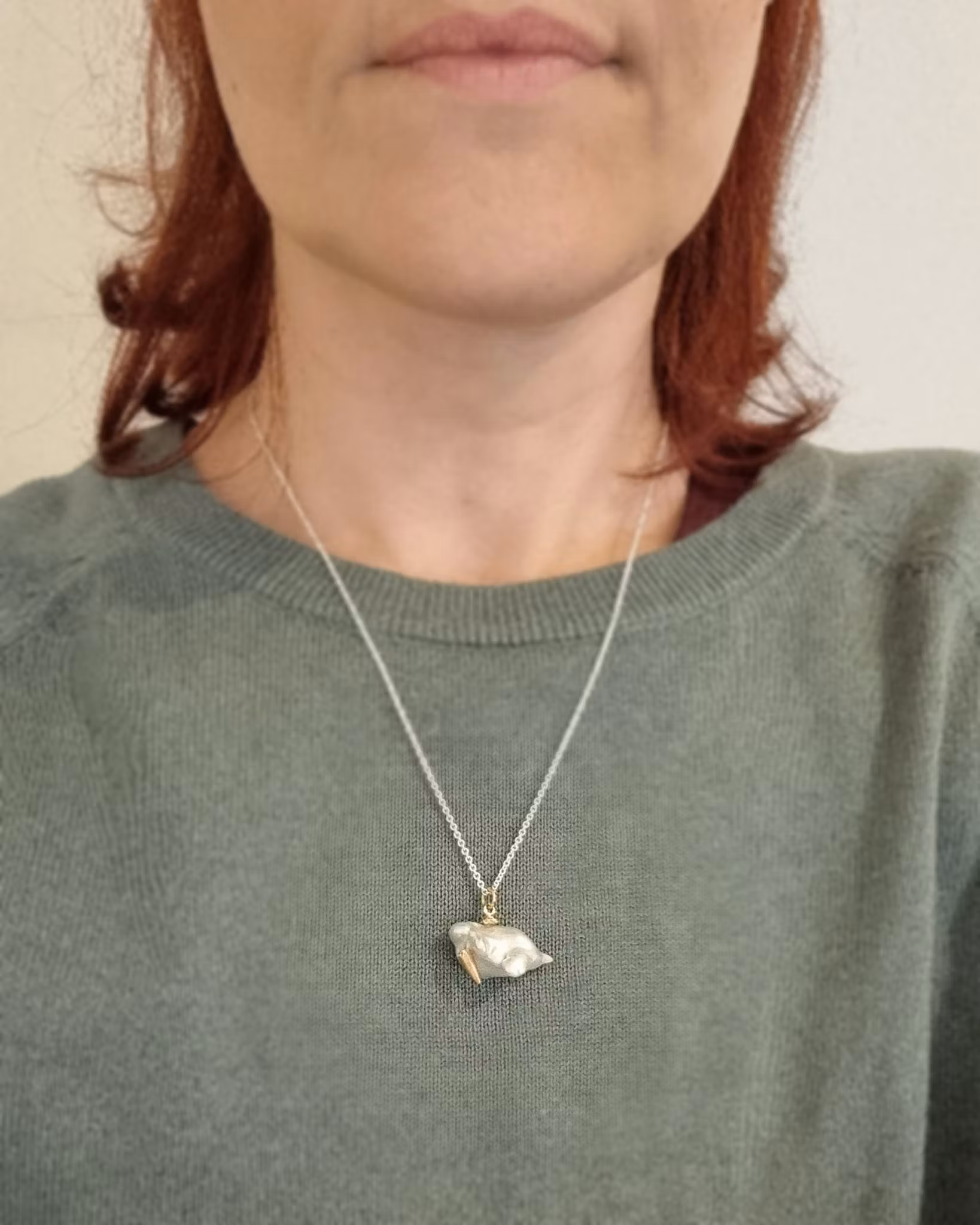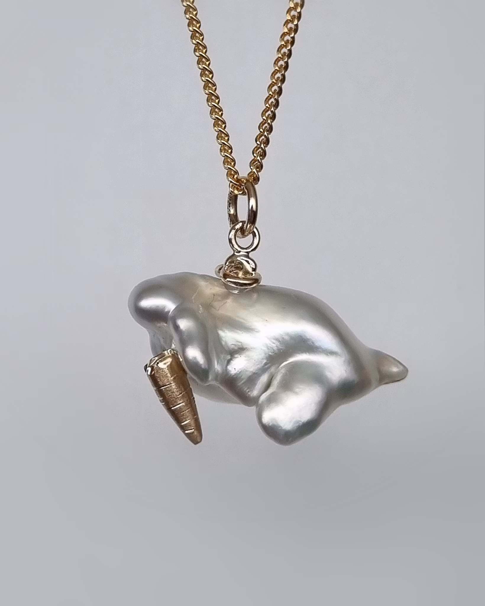 Eftersom den kan anses likna en kanin/vädur fick den en morot i guld att gnaga på. Klart en keshipärla av den här gedigna kalibern måste ha något riktigt fint att matcha upp formen med. ♡ Öglan är en rosett som är fäst i nacken.
