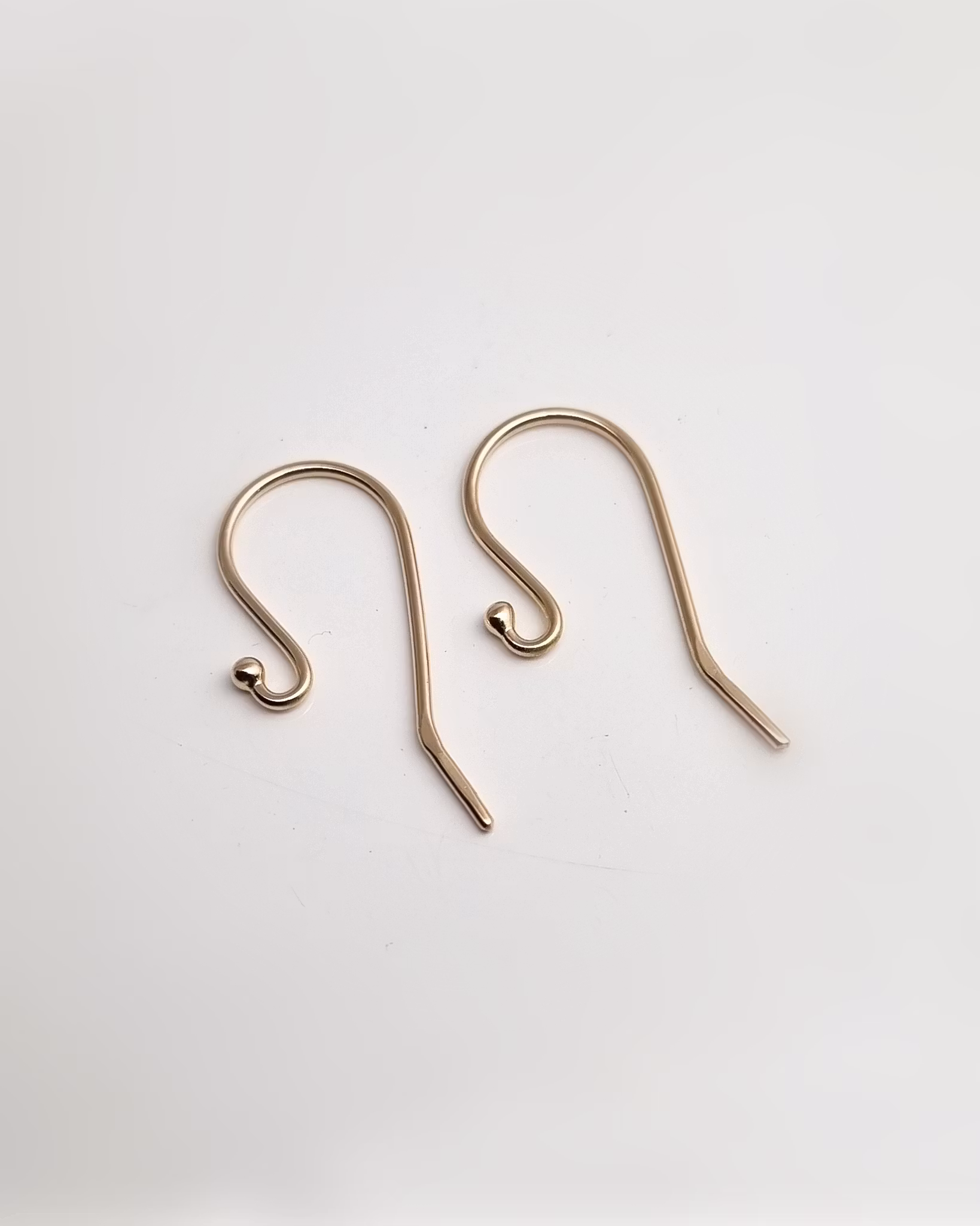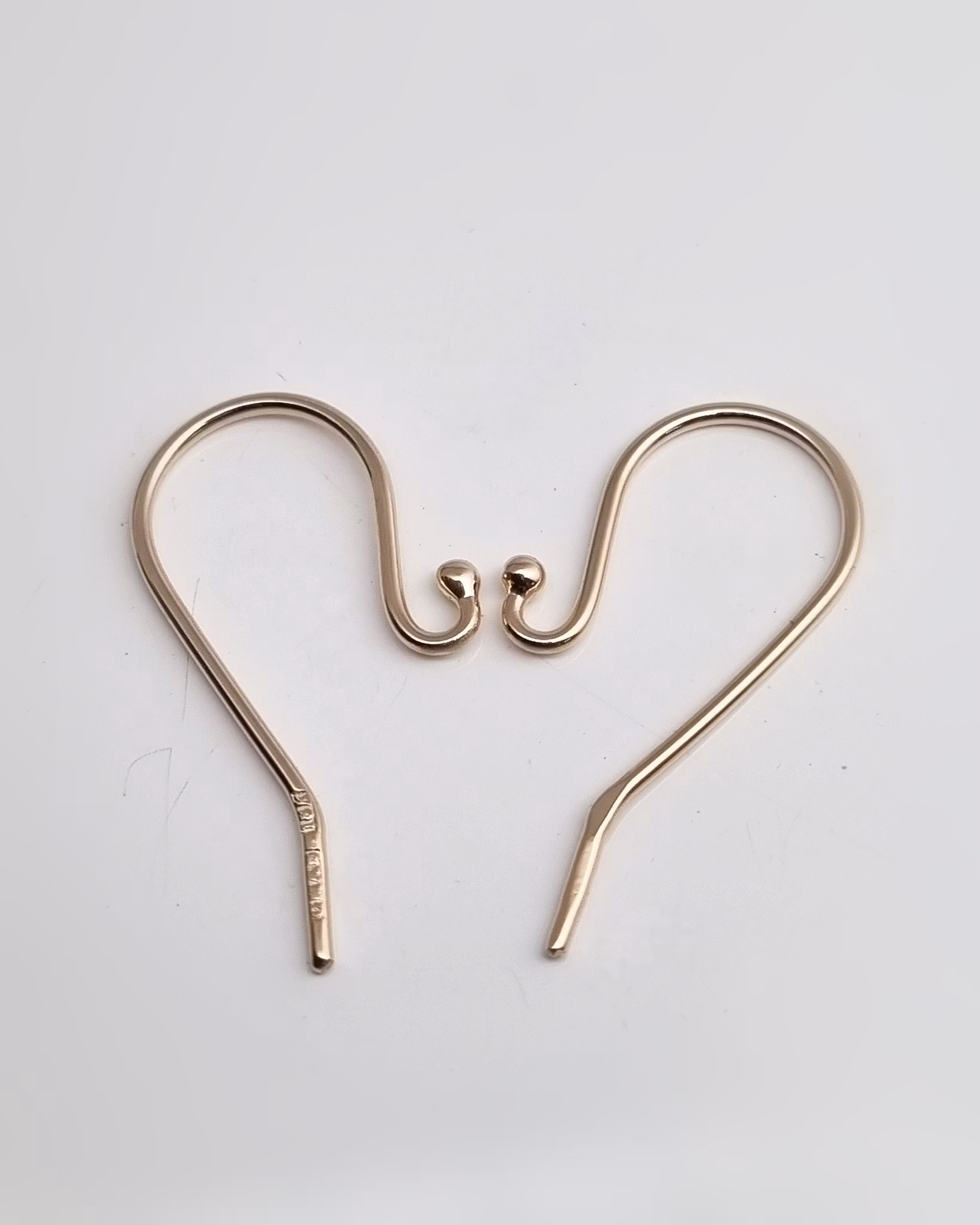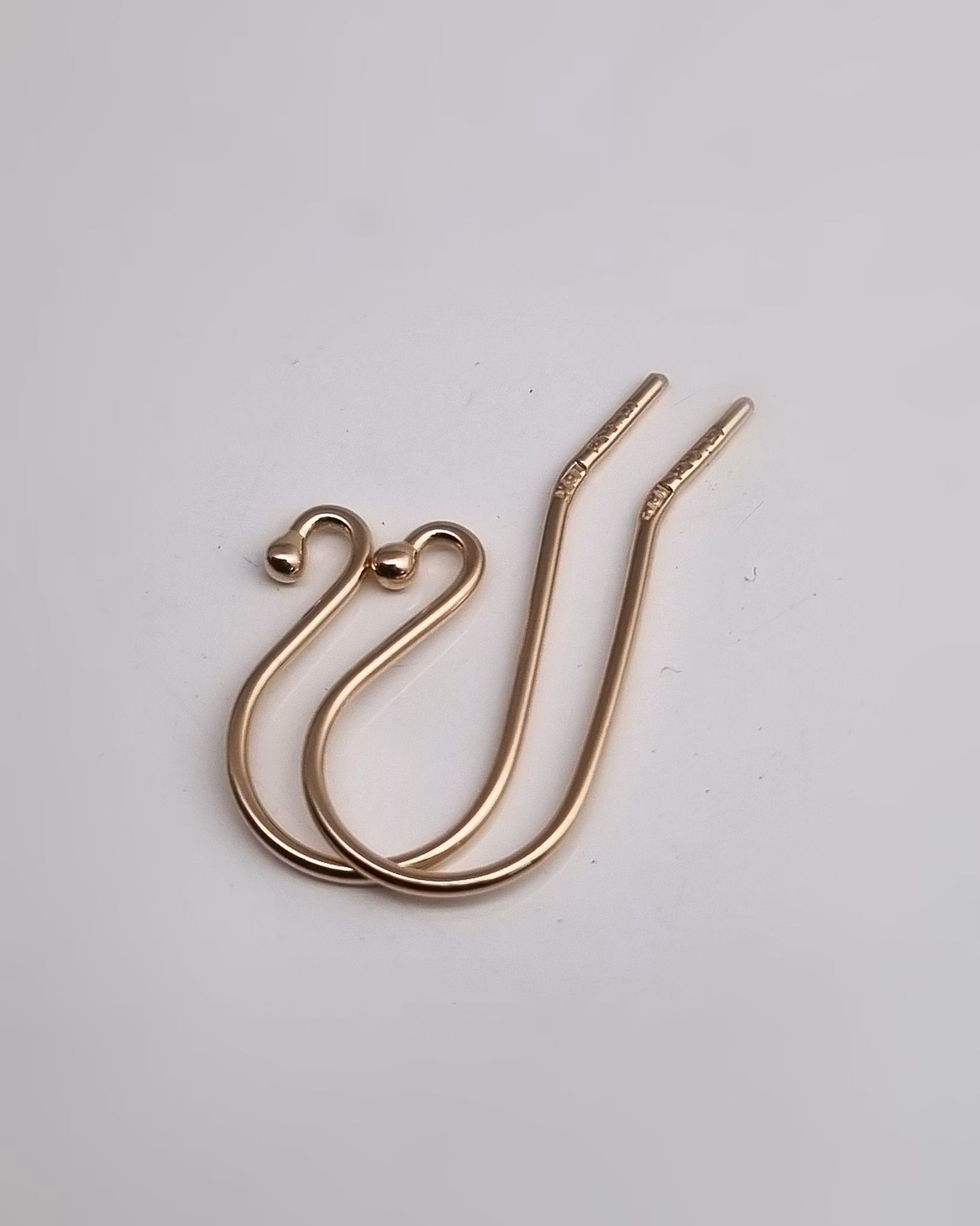 Krokarna tillverkas för hand i 18K återvunnet guld. Detta är en standardmodell med tråd ca 0,90 mm. Längden är ca 24 mm totalt och övre delen mäter ca 15 mm från topp till kul-ögla/krok.