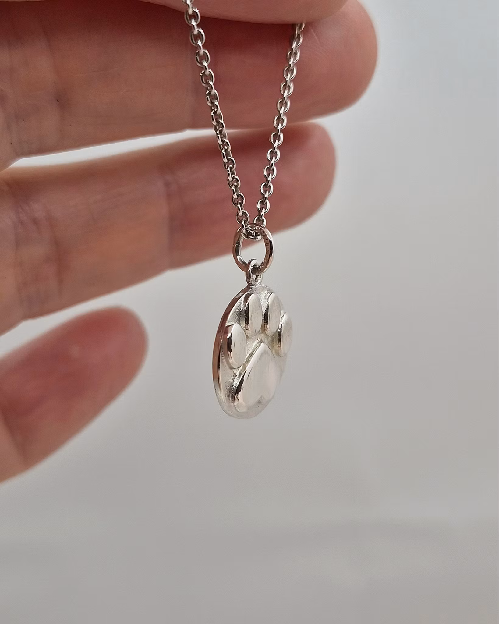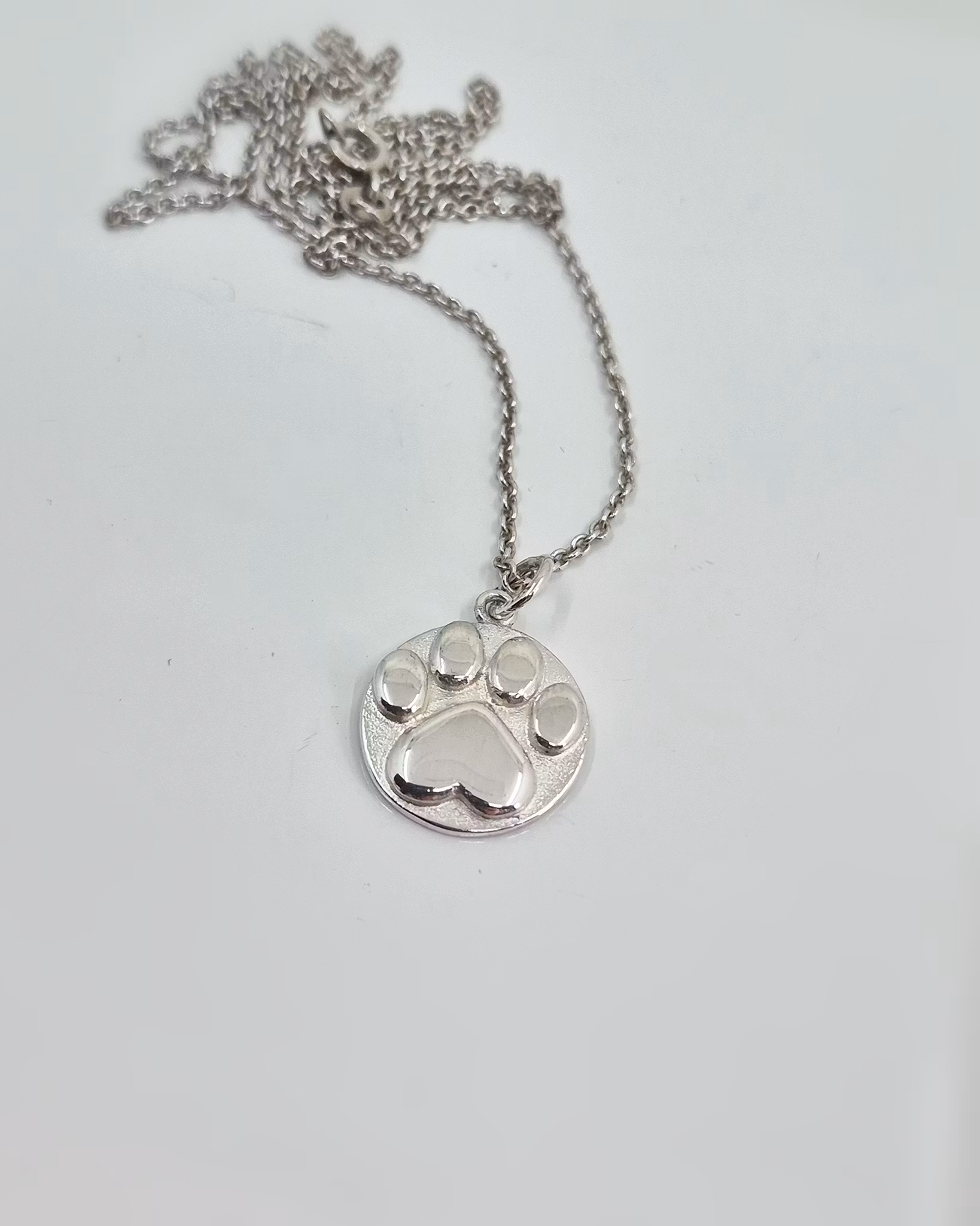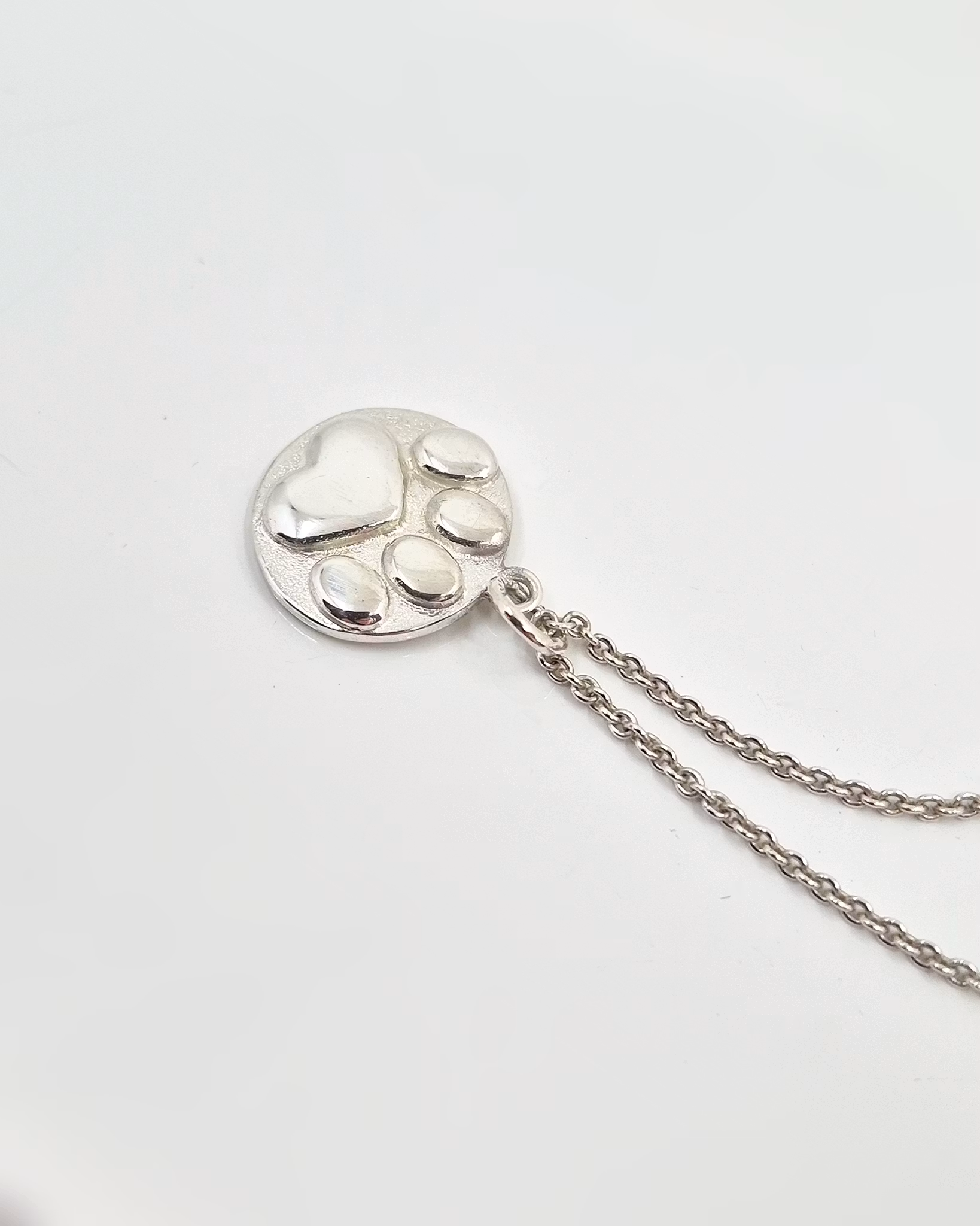 Hängsmycke i 925 sterlingsilver ca 15 mm i diameter. Det här är den klassiska hjärt-trampdynan i större variant, den som sitter stämplad på alla smycken i denna serie. Hängsmycket är lätt oxiderat alternativt vit. Skriv i rutan vilken du föredrar. Kedja köpes separat.