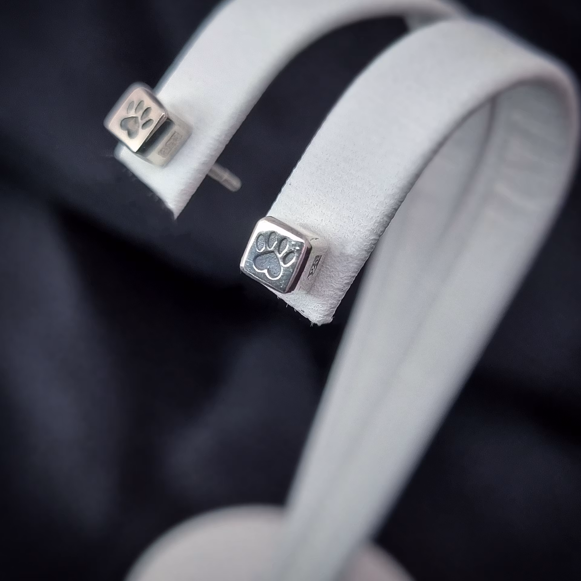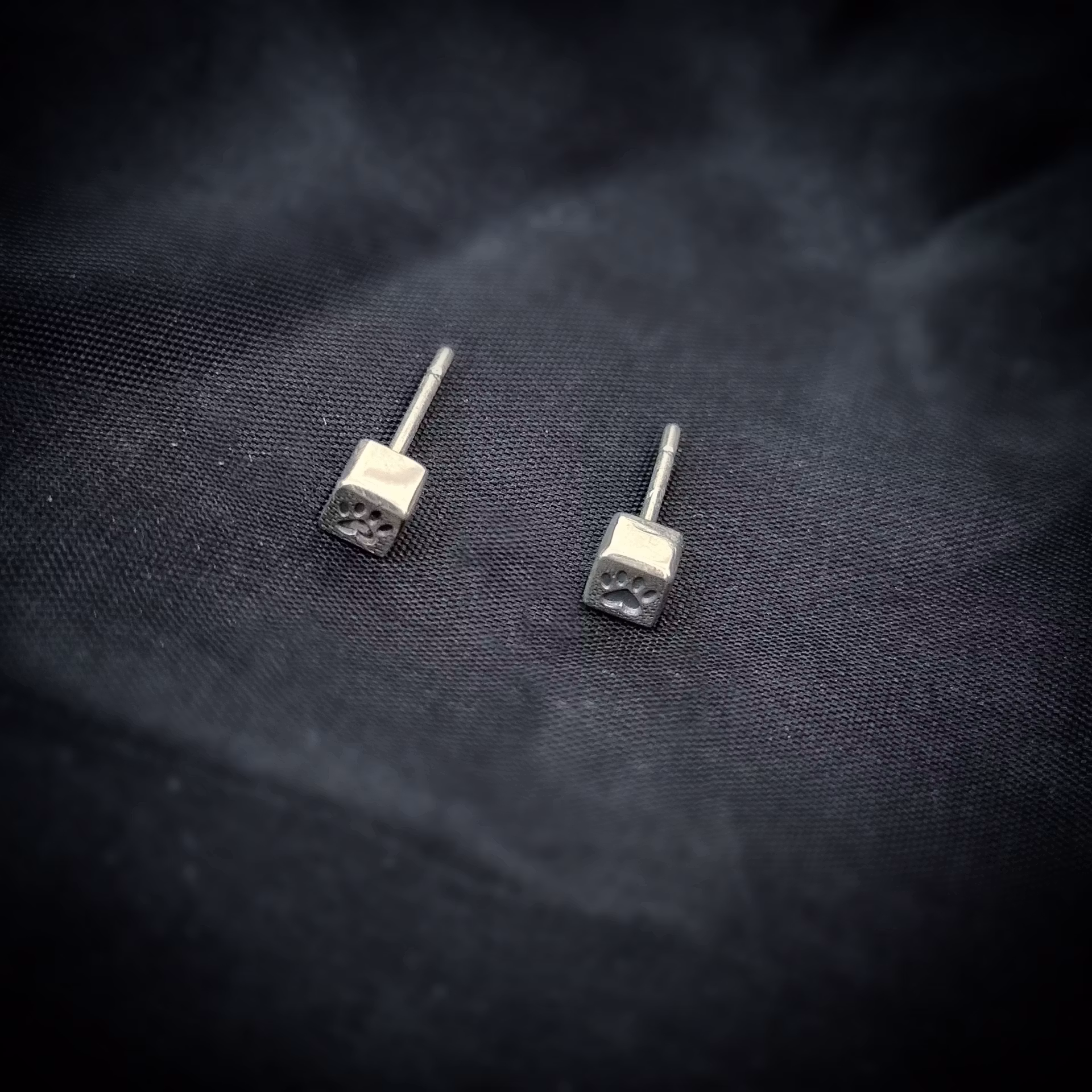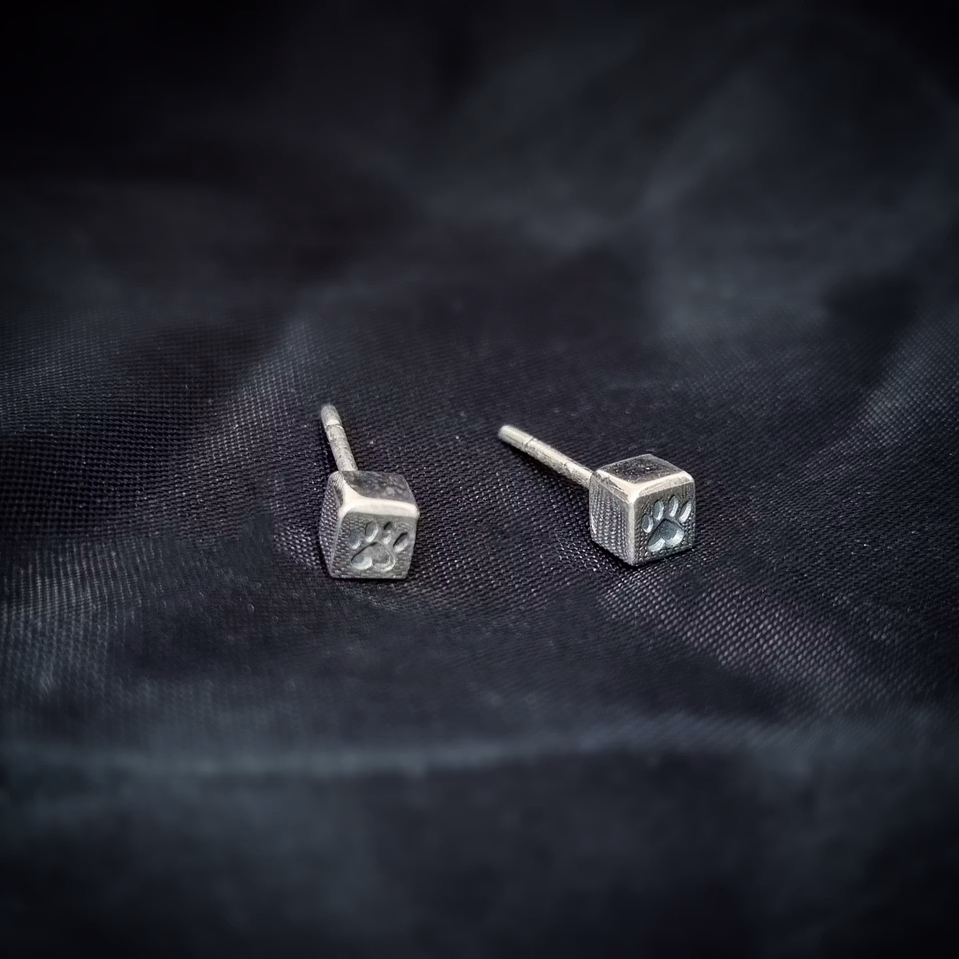Pytteliten kub med ett välbekant tassavtryck. Kuben är massiv och tillverkad i 925 sterlingsilver och mäter ca 4 x 4 mm. Snurrebuss/bakstycken ingår.