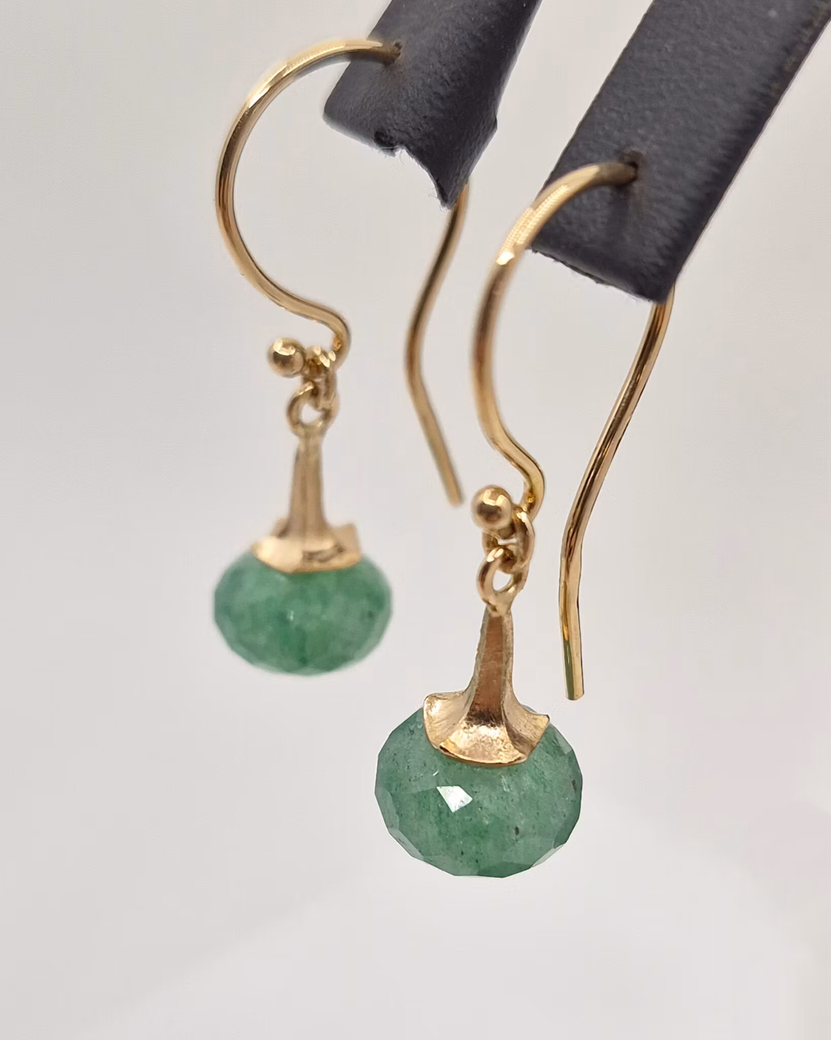 Vackra ljusgröna Aventuriner monterade på Änglatrumpeter i guld. Stenarna är glittriga och har vackra inneslutningar. Slipformen är sk lökbriolett med bullig härlig form och en liten spets nedtill. Fina från alla vinklar!
