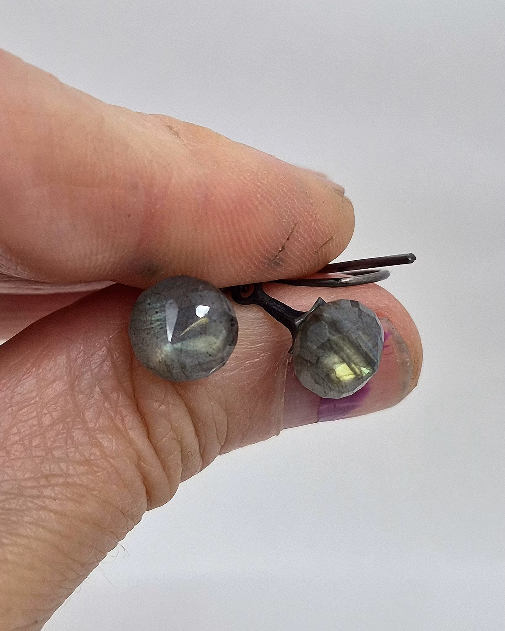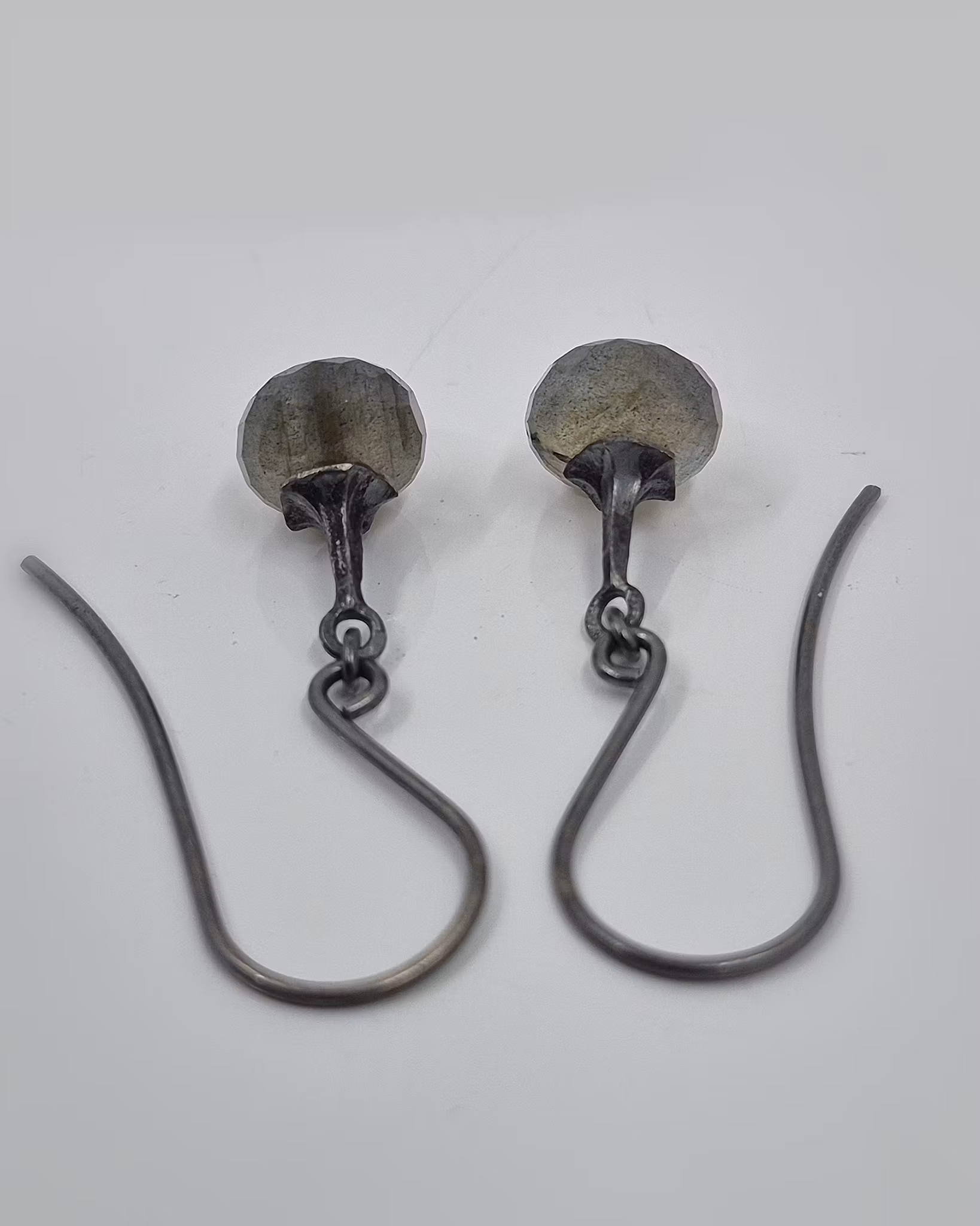 Underbara skimrande Labradoriter monterade med Änglatrumpeter i silver. Örhängena är heloxiderade i ytan, dvs svarta/grå. Slipformen är sk lökbriolett med bullig härlig form och en liten spets nedtill. Labradoriter är kända för sitt unika skimmer som påminner om ett vackert norrsken. Dom överraskar i olika ljus med ett färgspektra i grönt, gult, blått och silver. Otroligt läckra ädelstenar!