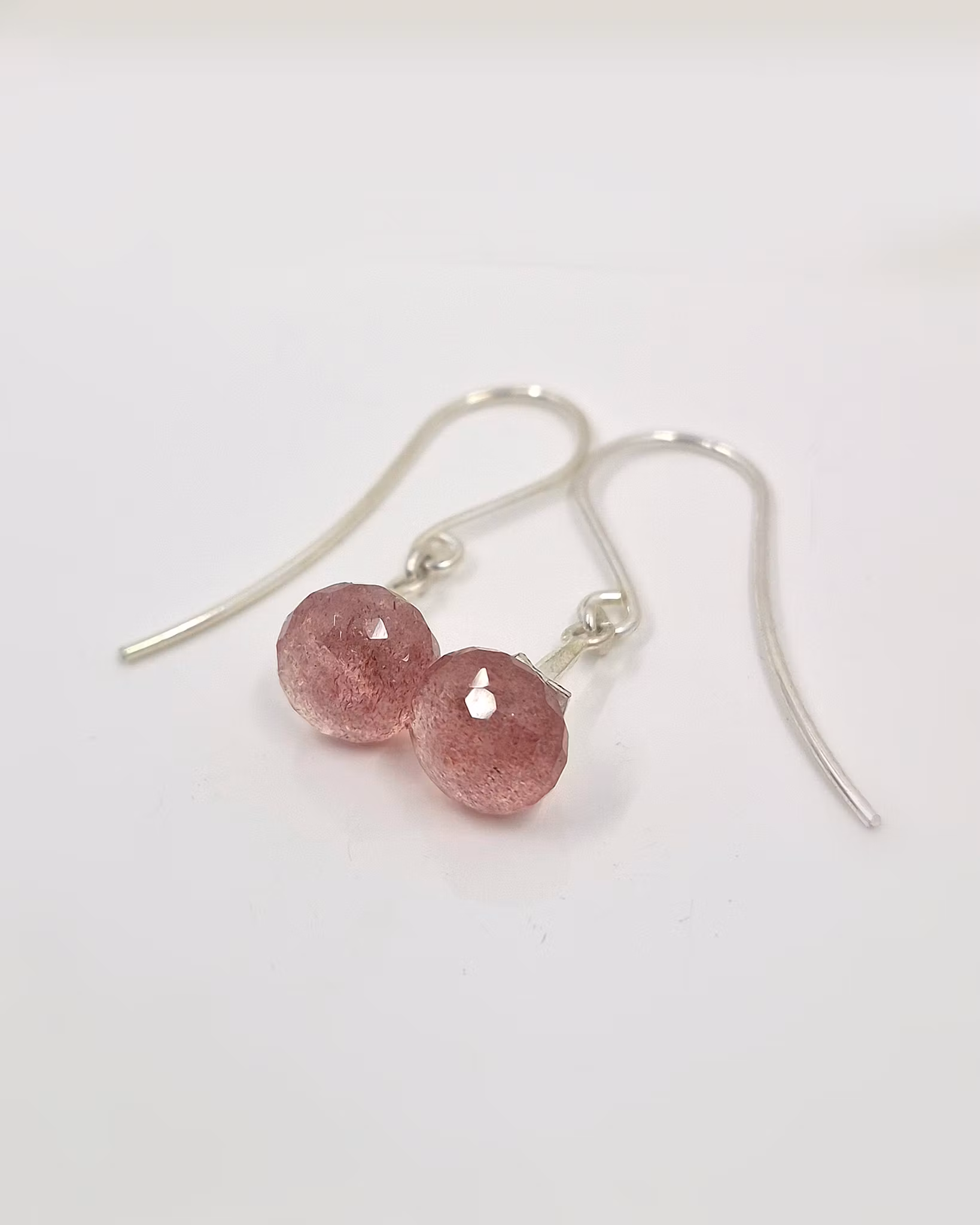 Söta rosa Smultronkvarts monterade på Änglatrumpeter i silver. Stenarna är glittriga och har vackra inneslutningar. Slipformen är sk lökbriolett med bullig härlig form och en liten spets nedtill.