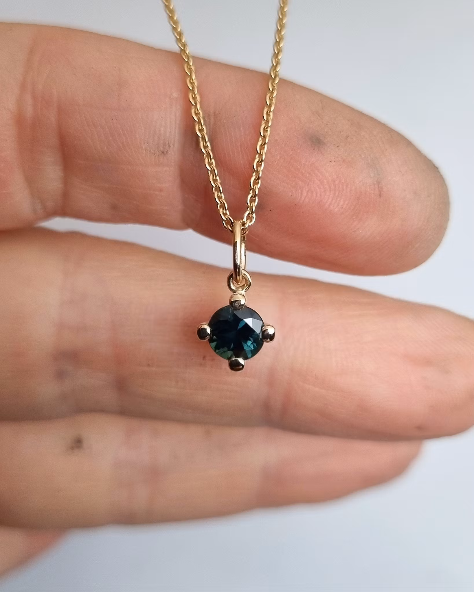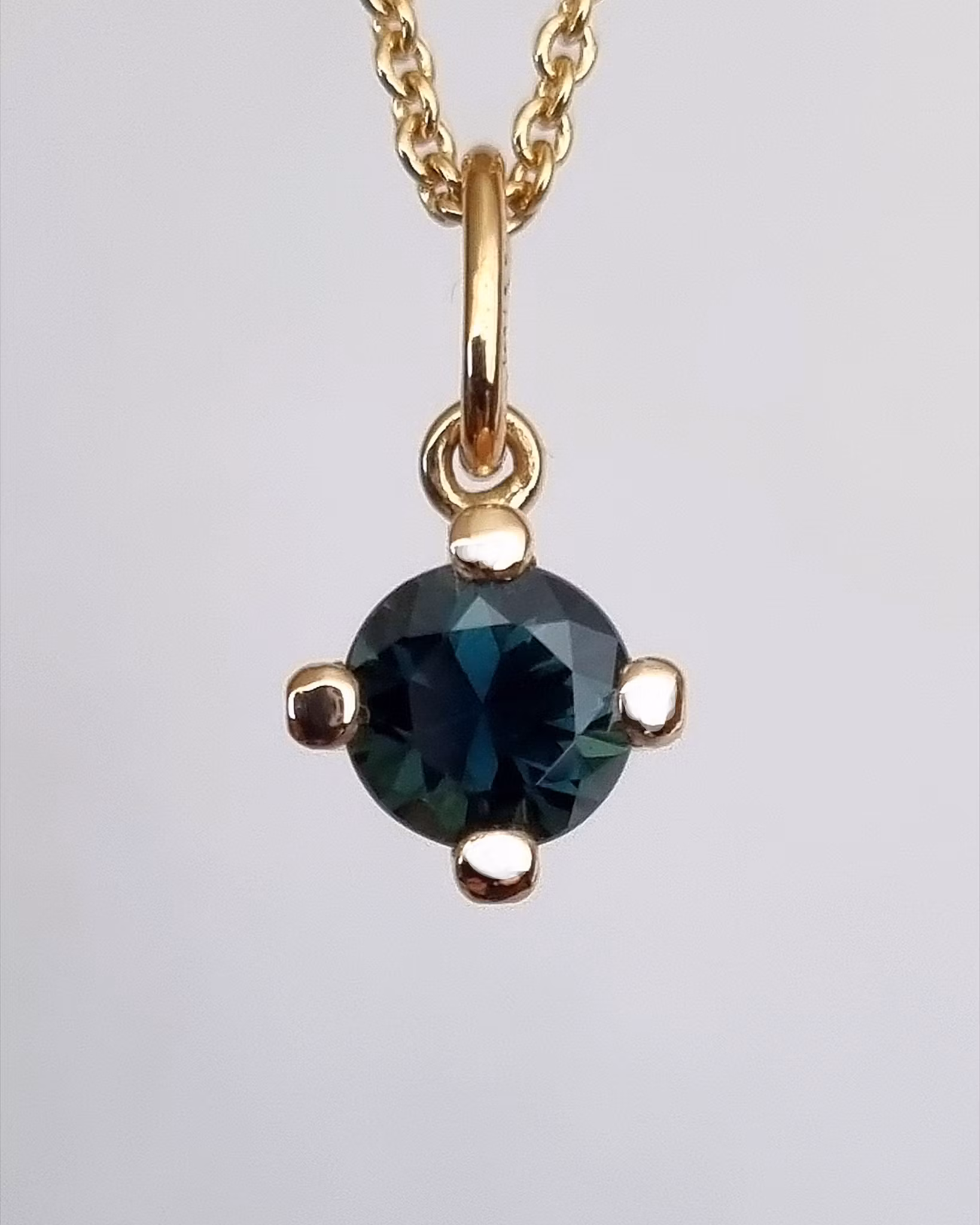 Hängsmycket är handgjort i återvunnet 18K guld. Safiren är djupt tealfärgad, naturlig och utvunnen i Tanzania. Stenen mäter ca 5,5 mm i diameter och hela hänget är nätt samt gnistrar vackert i olika ljus. Noteras bör att dessa färger på Safirer skiftar i olika ljus. Ibland upplevs den blå, ibland grön och ibland svart.