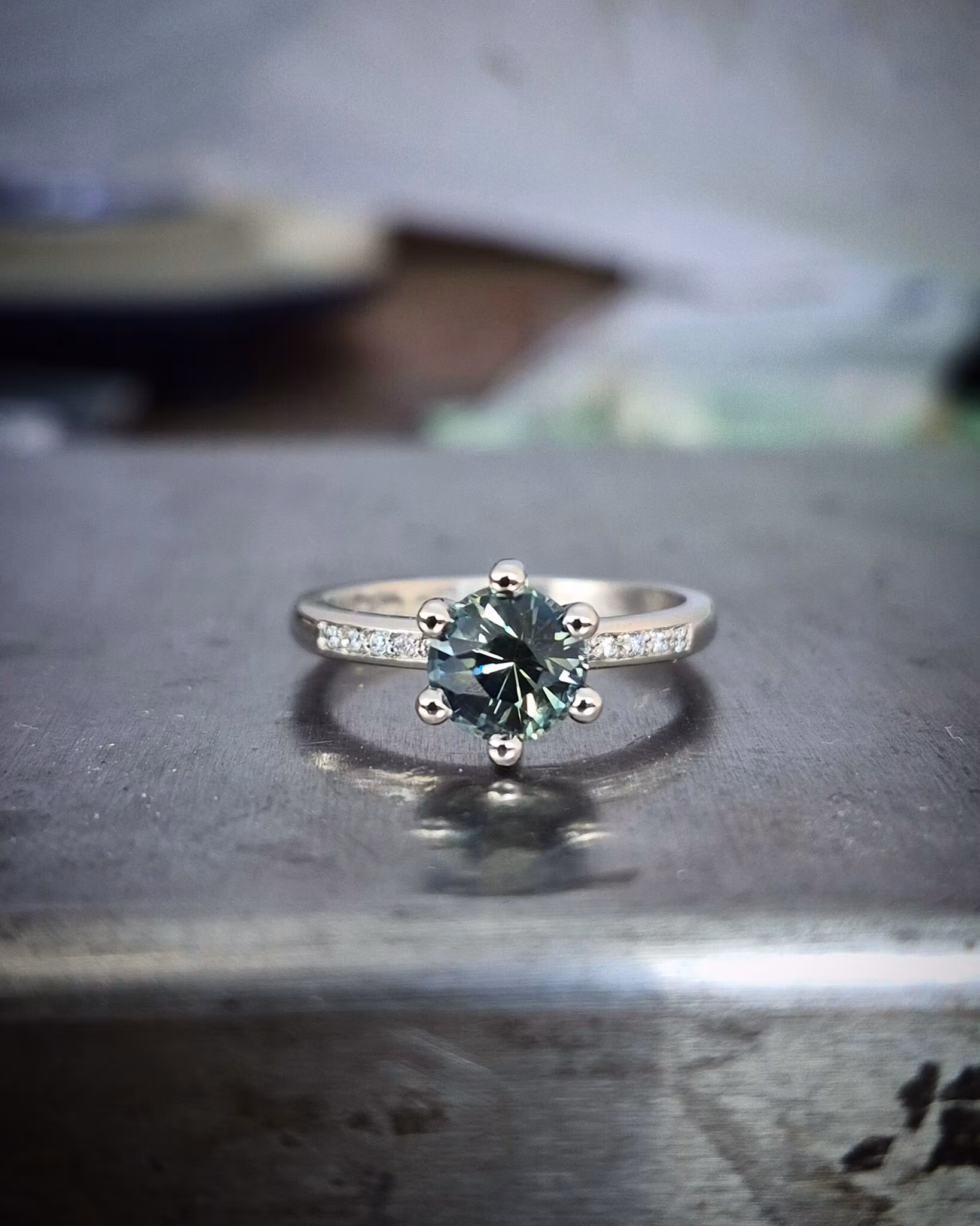 Centrerat sitter en grönblå Safir. Färgen är teal som går mellan grön, blå och grönblå. På var sida om Safiren sitter sammanlagt 10 st vita briljanter, wsi eco natural.