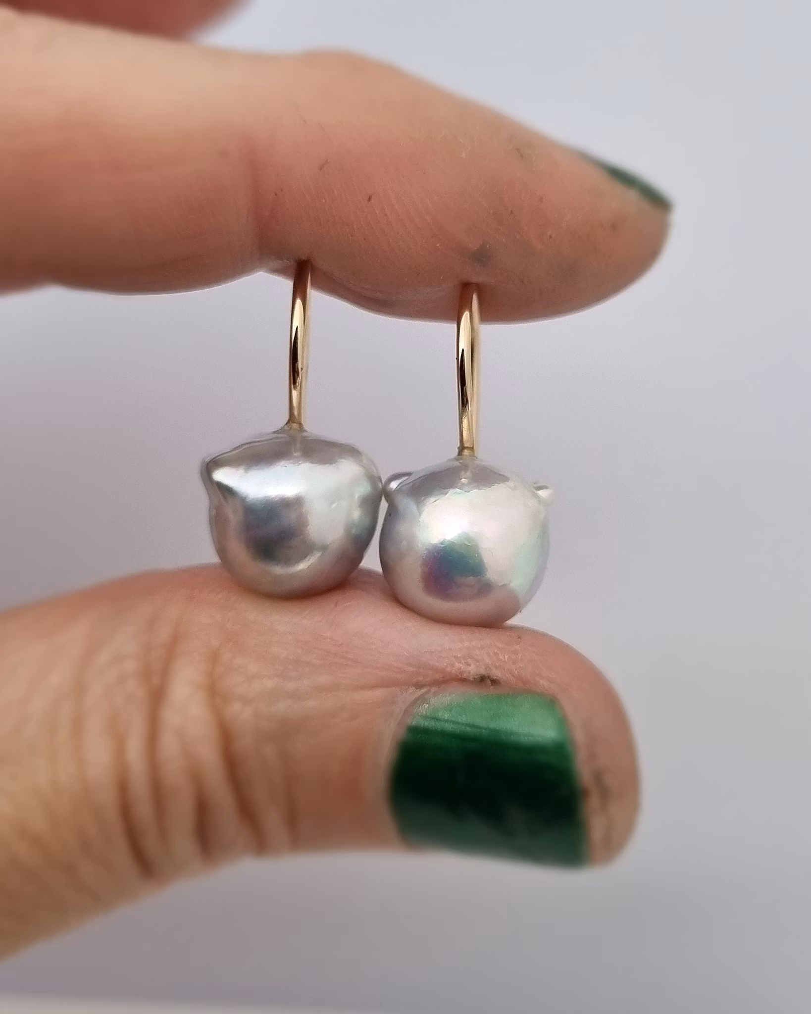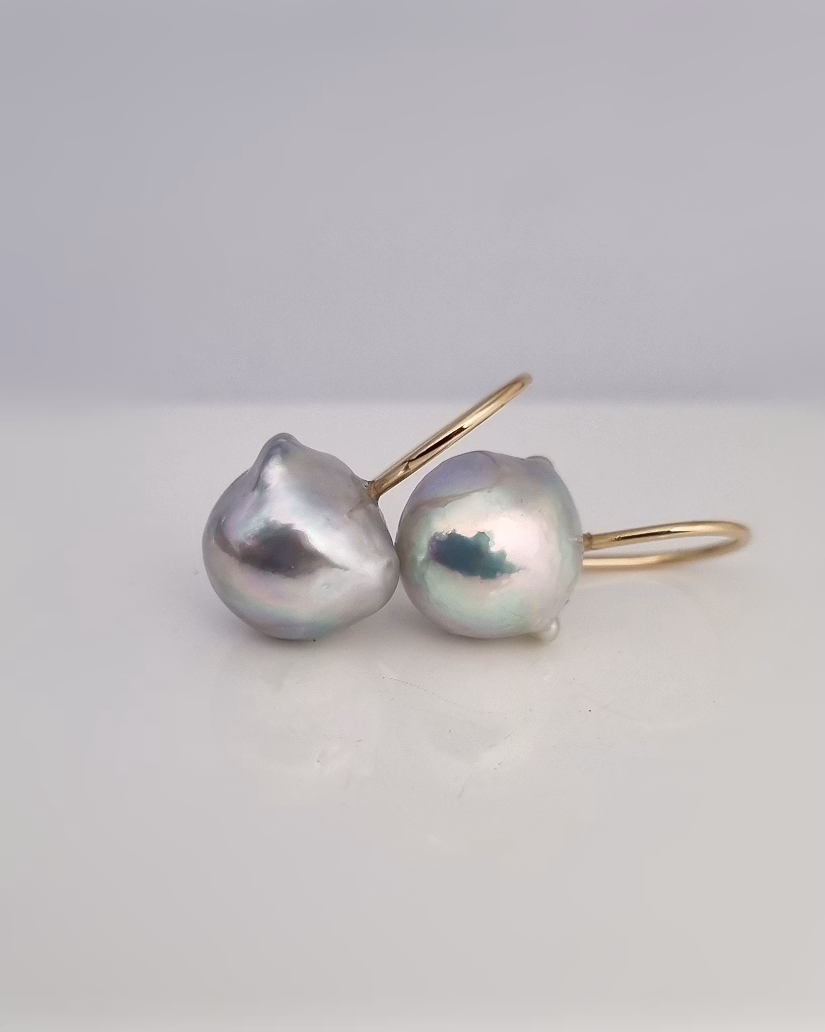 Detta är äkta odlade saltvattenspärlor från Japan som har en ljusblå silvrig färg. Otroligt charmiga med sin något speciella ojämna form. Dom är unika och har en helt fantastisk lyster som nästan går att spegla sig i.