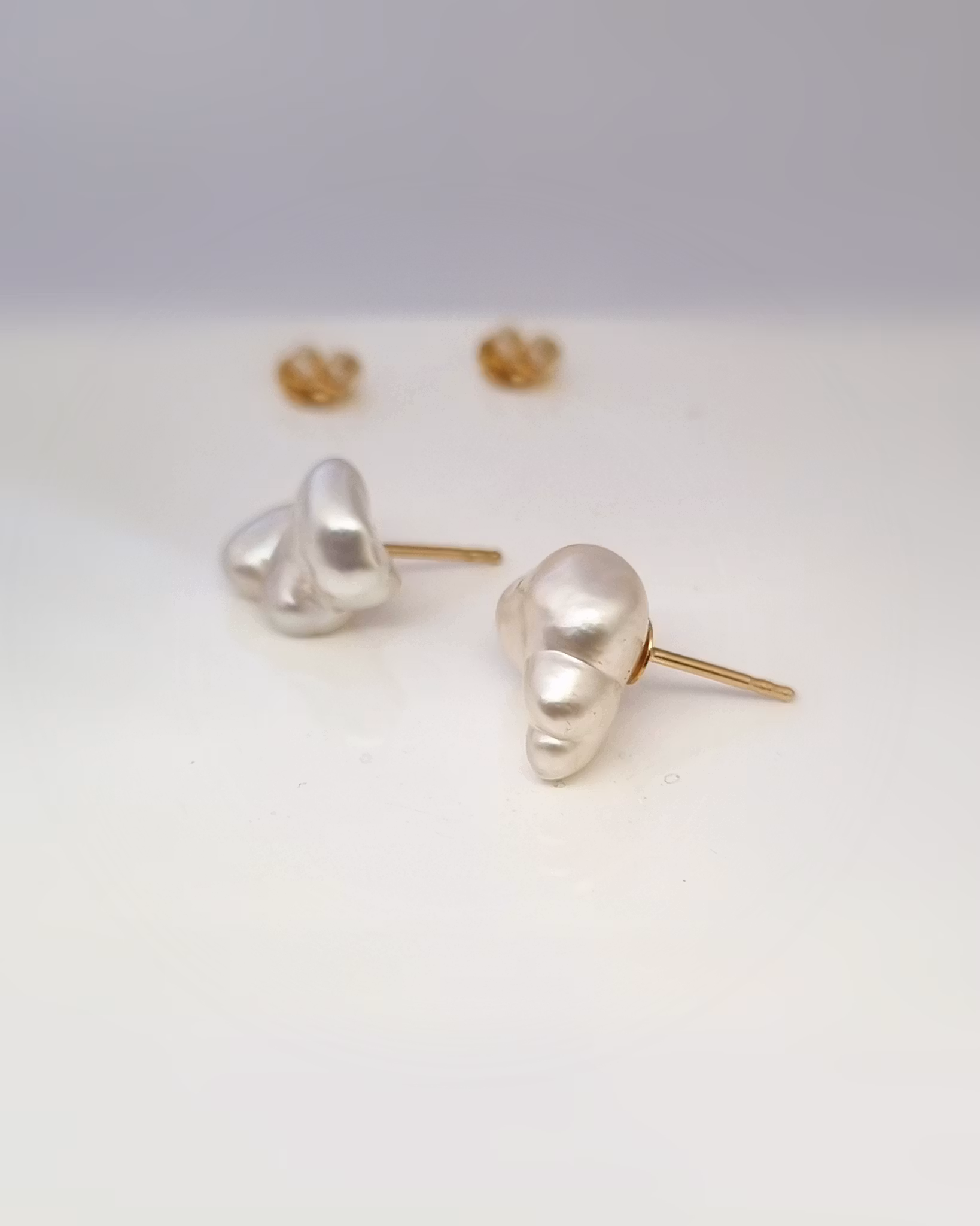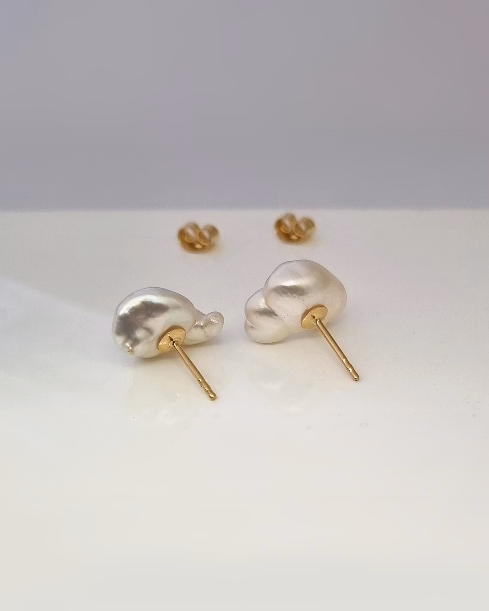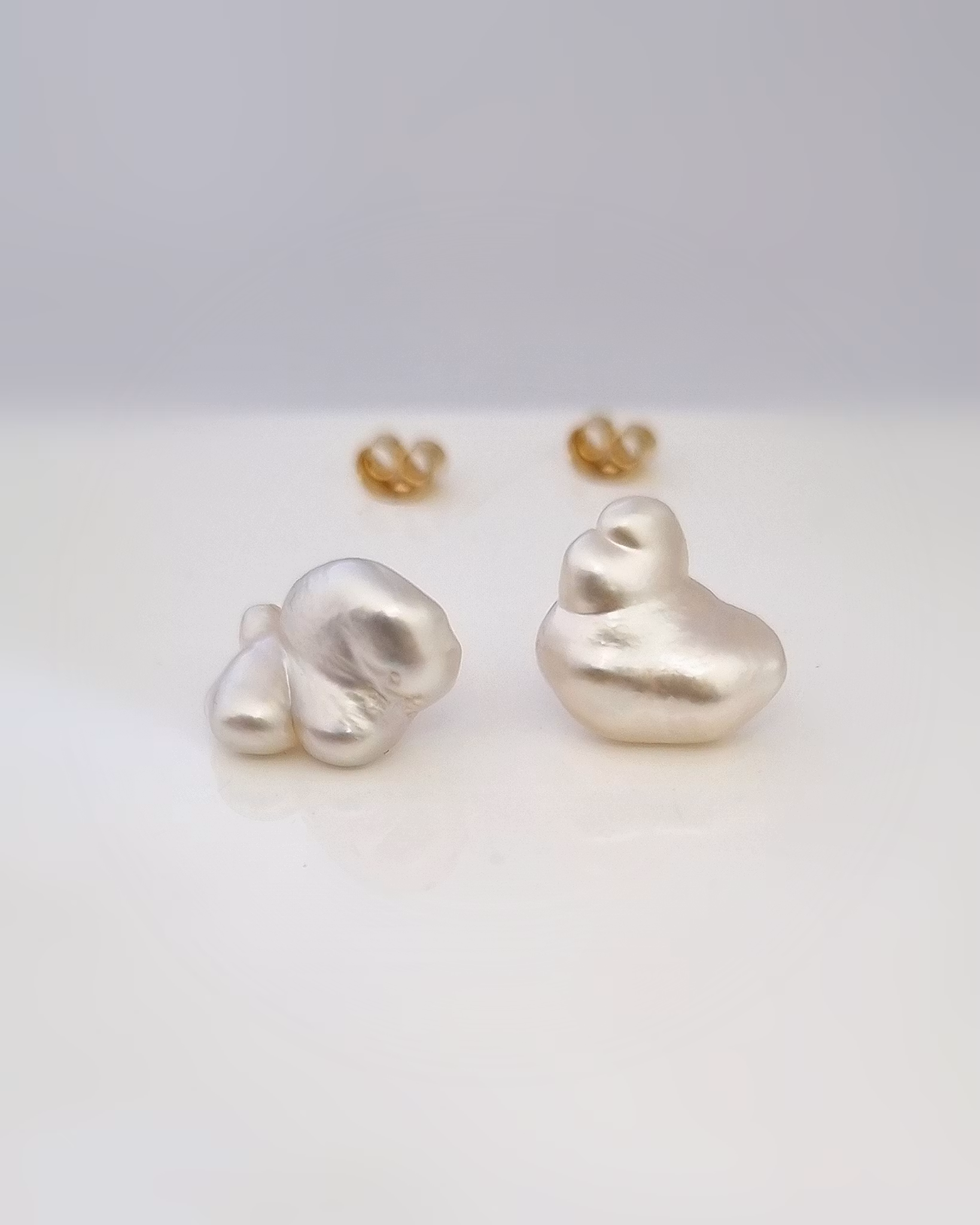 Pärlorna är vita i färgen, unika och har en hög kvalitet (AB). Formen på Keshi är barock och dom har en hög lyster som glimmar i en vacker vit nyans, lite åt det varma hållet. Dessa är fint matchade i storlek, lyster och nyans och paret är vackert oregelbundna såsom naturen skapat dom. Superläckra!