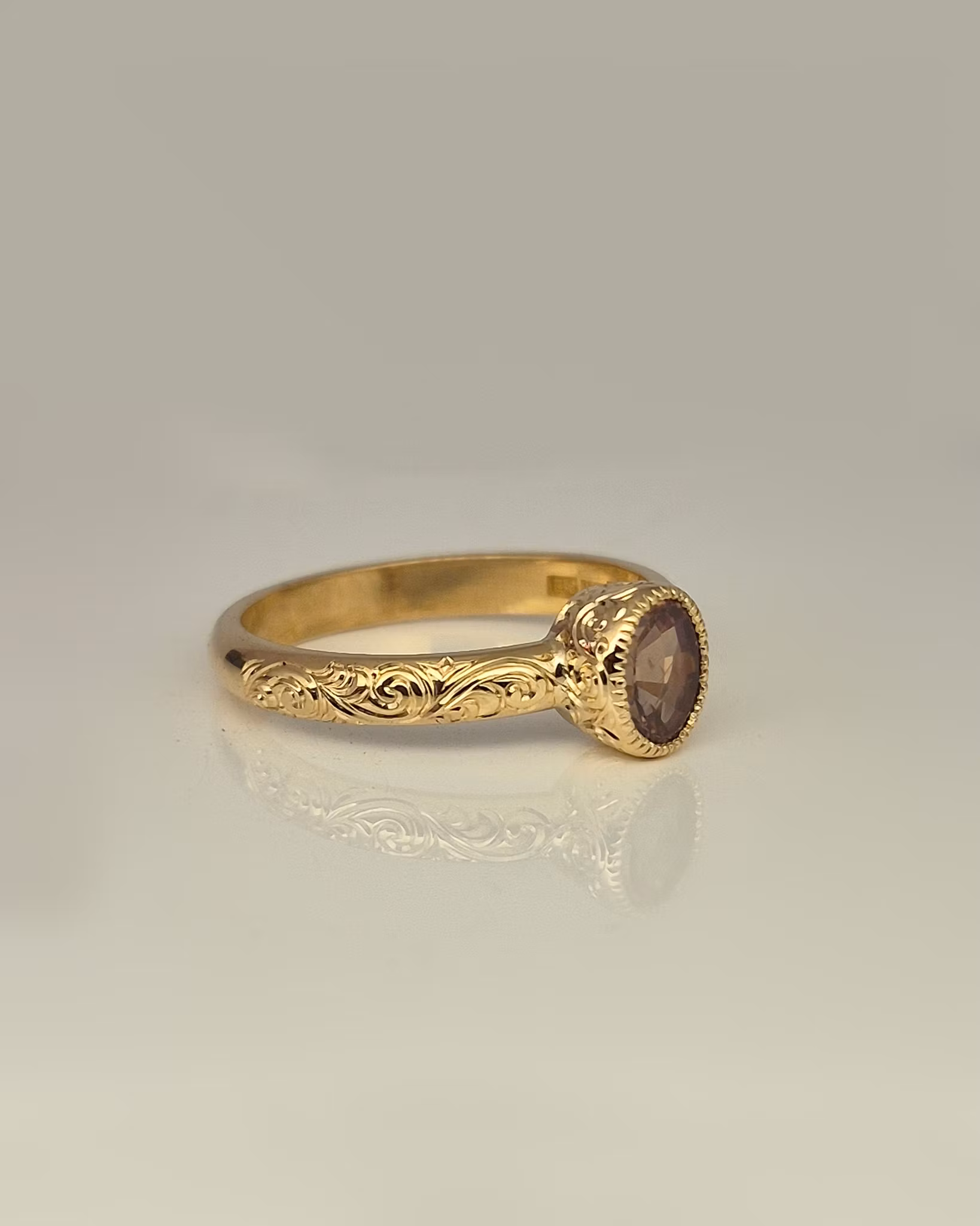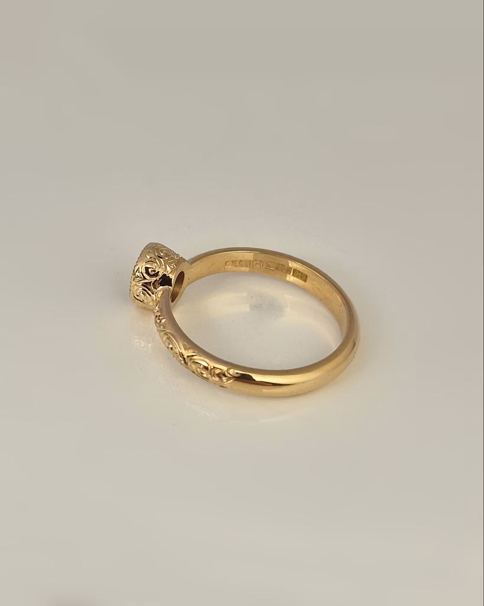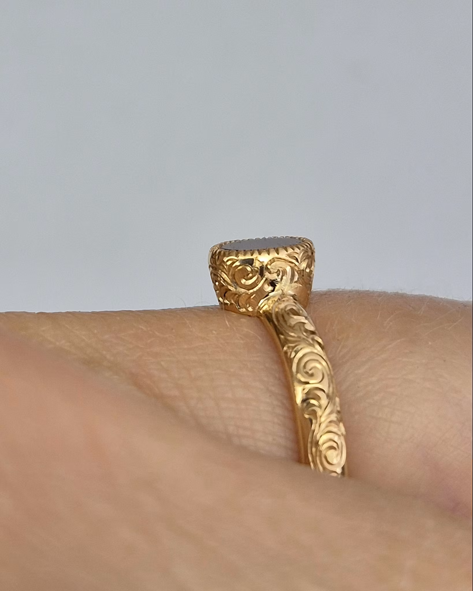 Ringen är dekorerad med en snirklig handgravyr på övre halvan av skenan samt även på själva fattningen. Ringen har en halvrund profil och är varken smal eller bred. Skulle vilja kalla den alldeles lagom. ♡