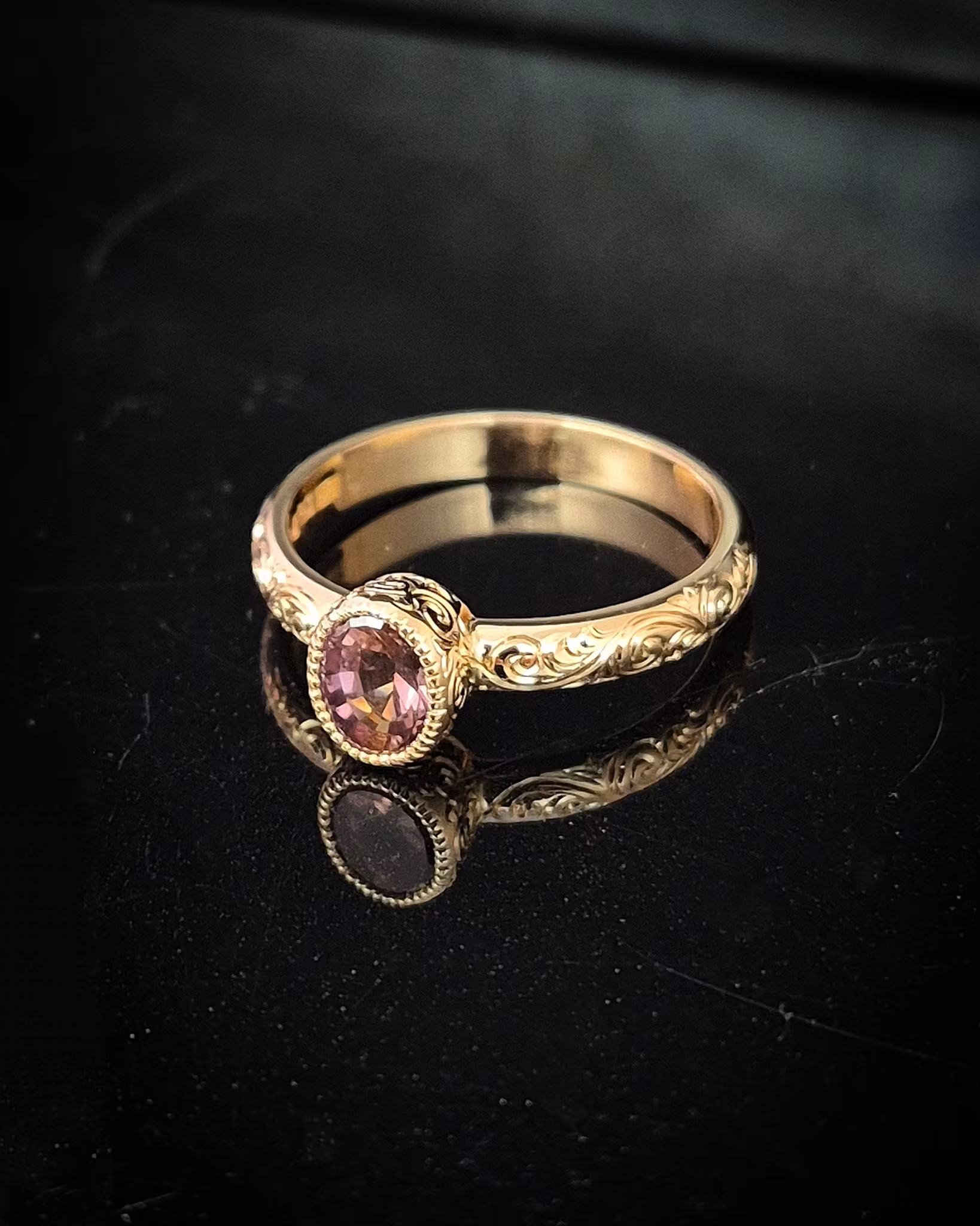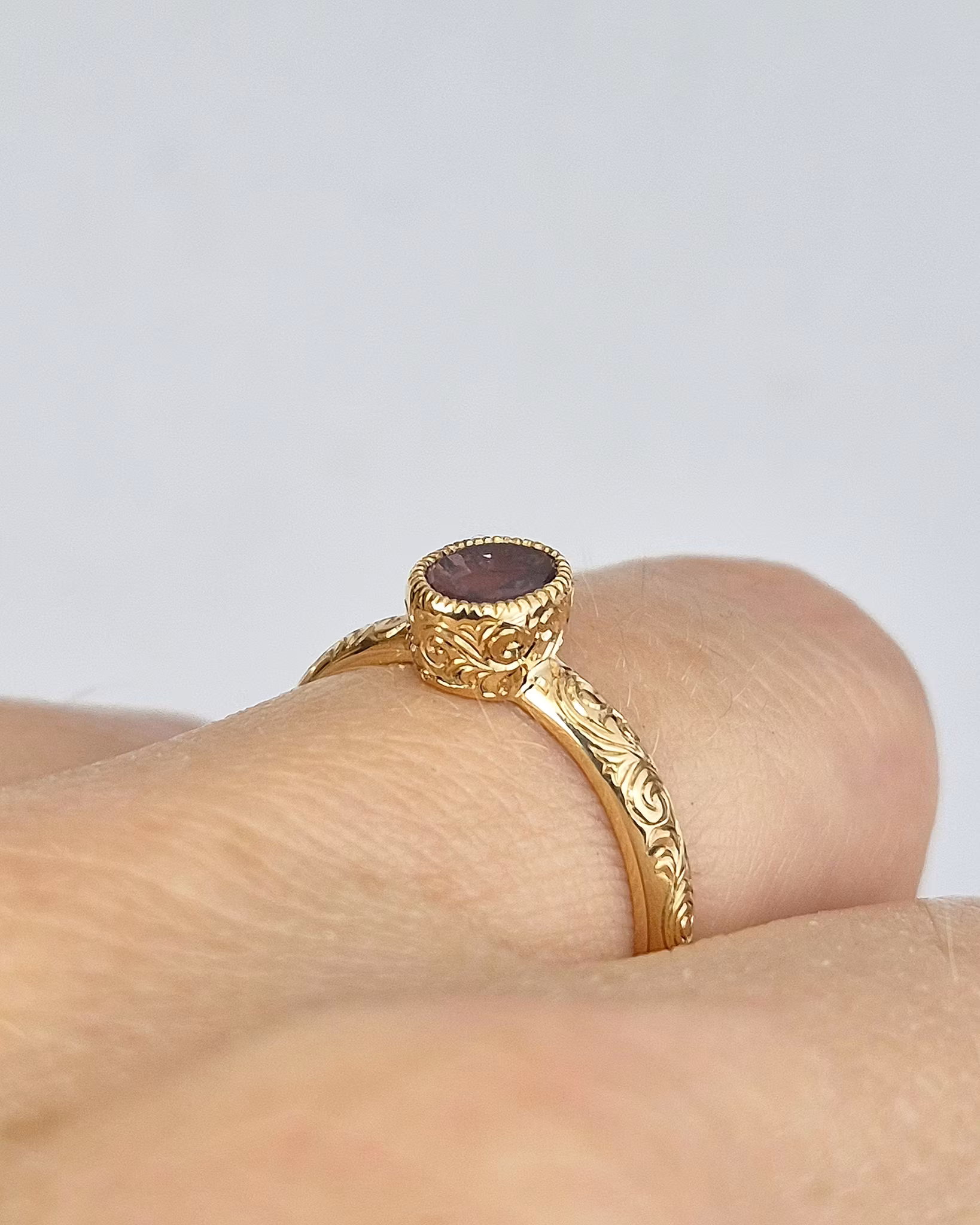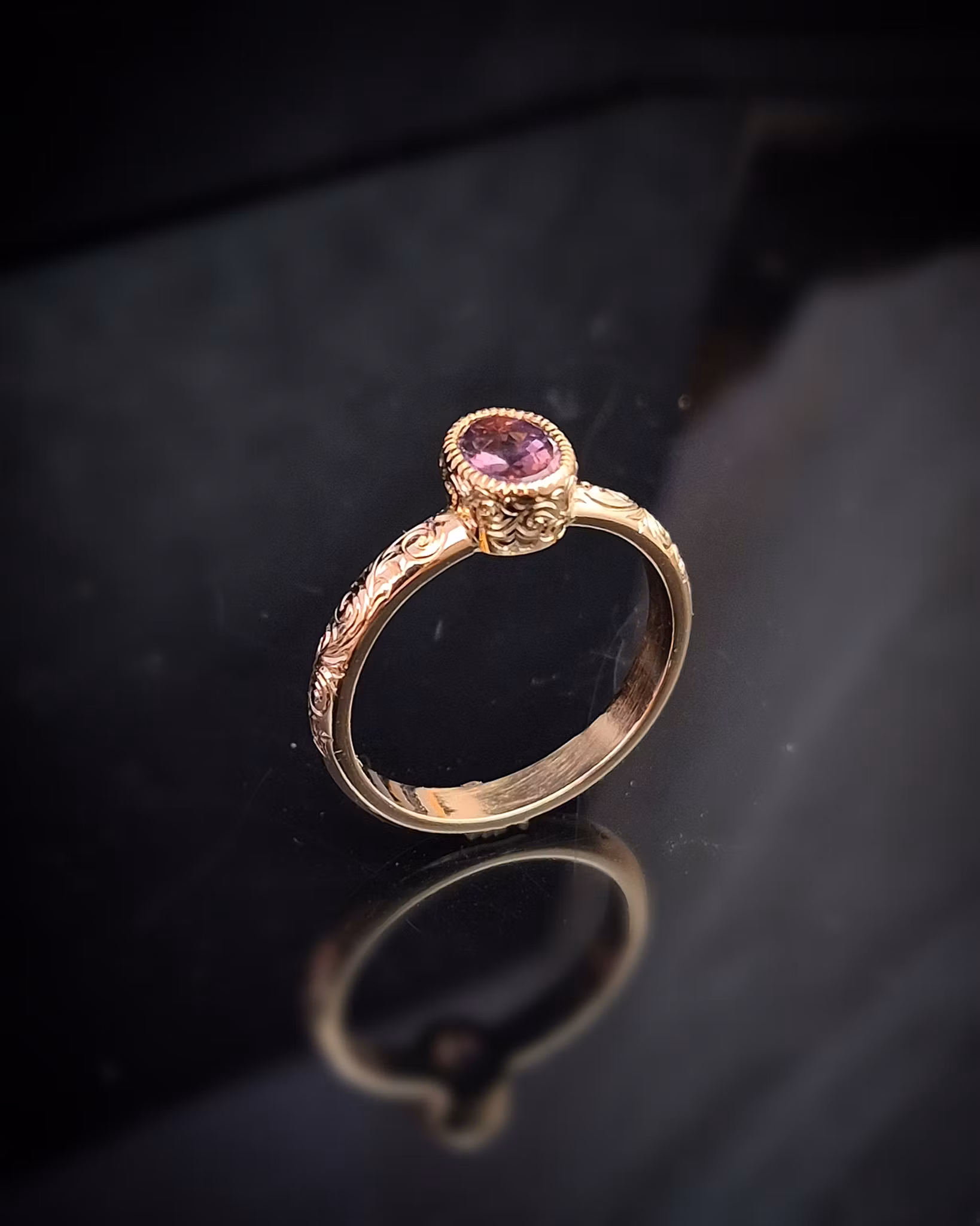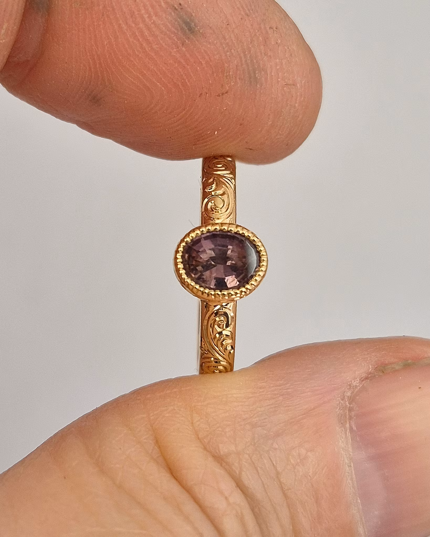 Ringen är dekorerad med en snirklig handgravyr på övre halvan av skenan samt även på själva fattningen. Ringen har en halvrund profil och är varken smal eller bred. Skulle vilja kalla den alldeles lagom. ♡