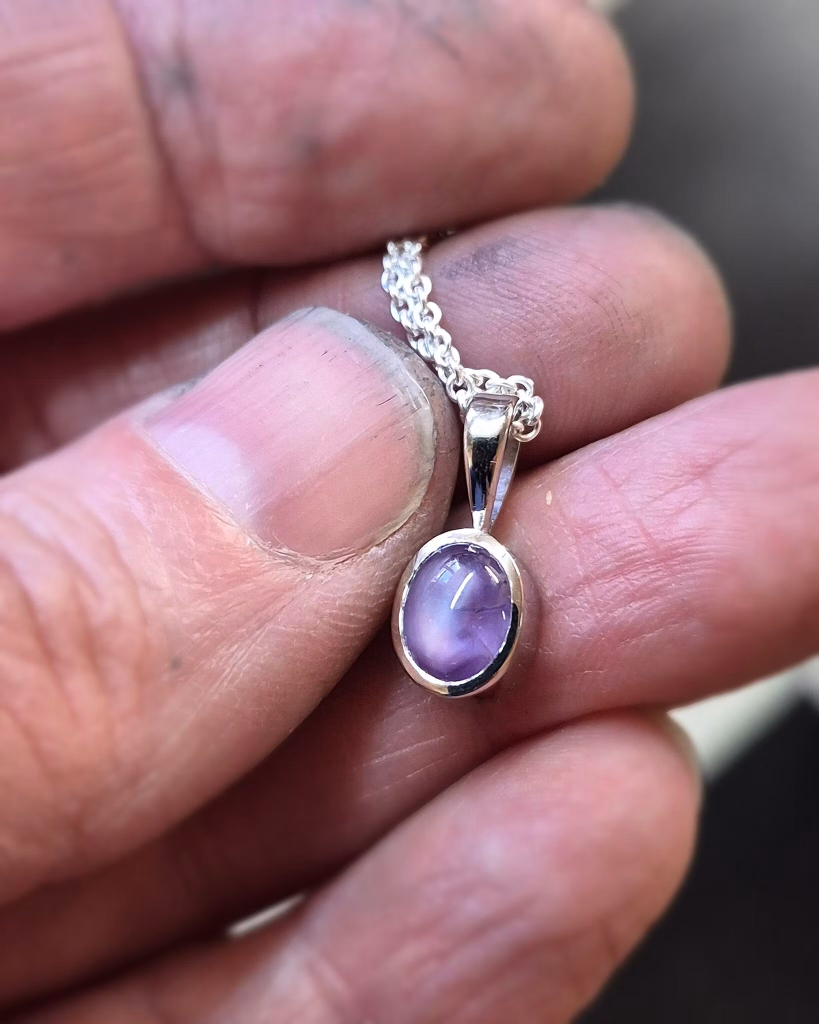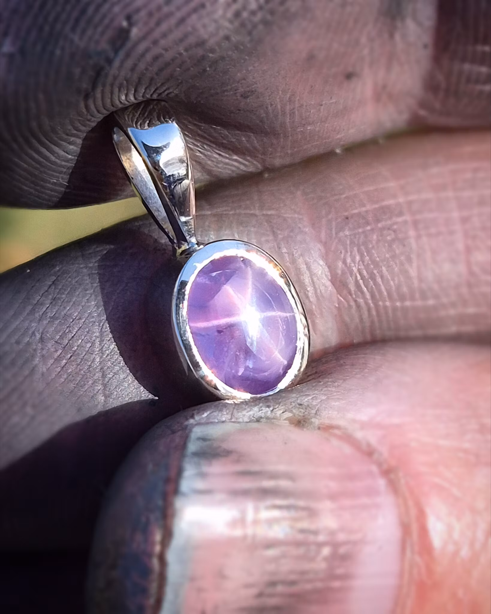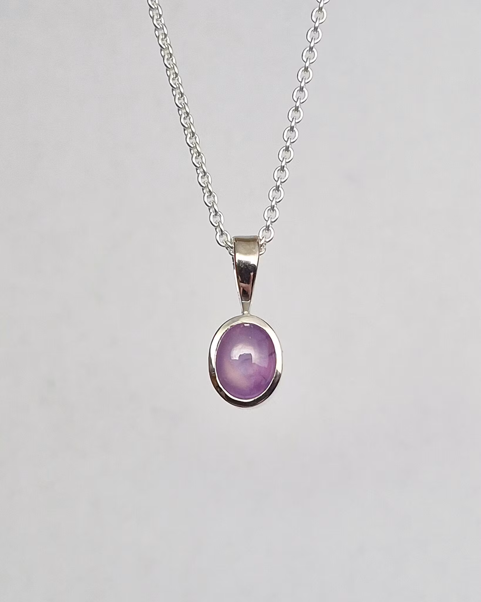Hänget har en stilren design med släta blanka ytor och en klassisk spetsögla. Safiren är mycket speciell i sin färg då den går mellan lila och rosa, vilket är sällsynt! Stjärnan framträder skarpt när solens ljus träffar den, otroligt häftig och tämligen spektakulär effekt. Denna sten skiftar en hel del i sitt utseende i olika ljusförhållanden. Mycket vacker i verkligheten!