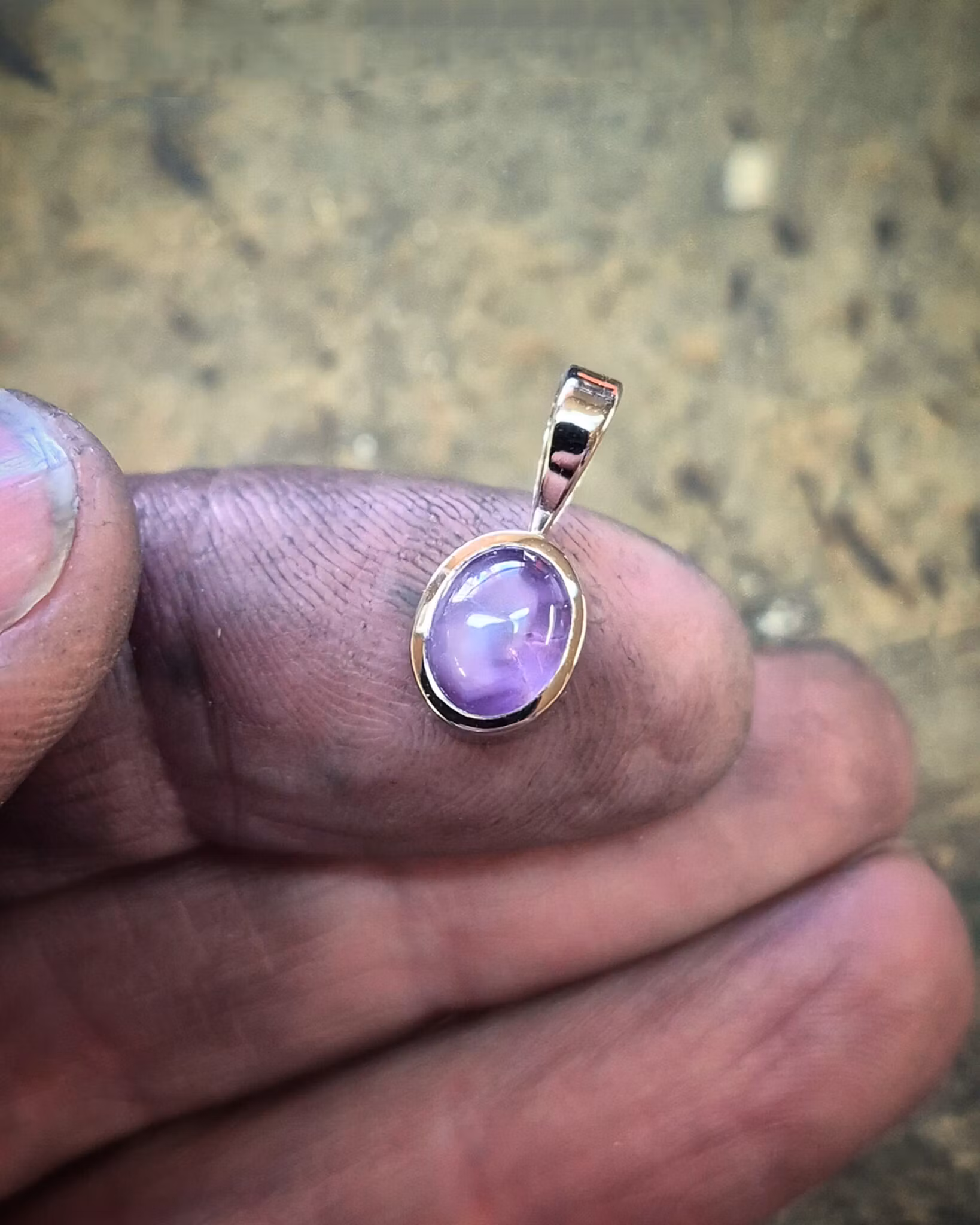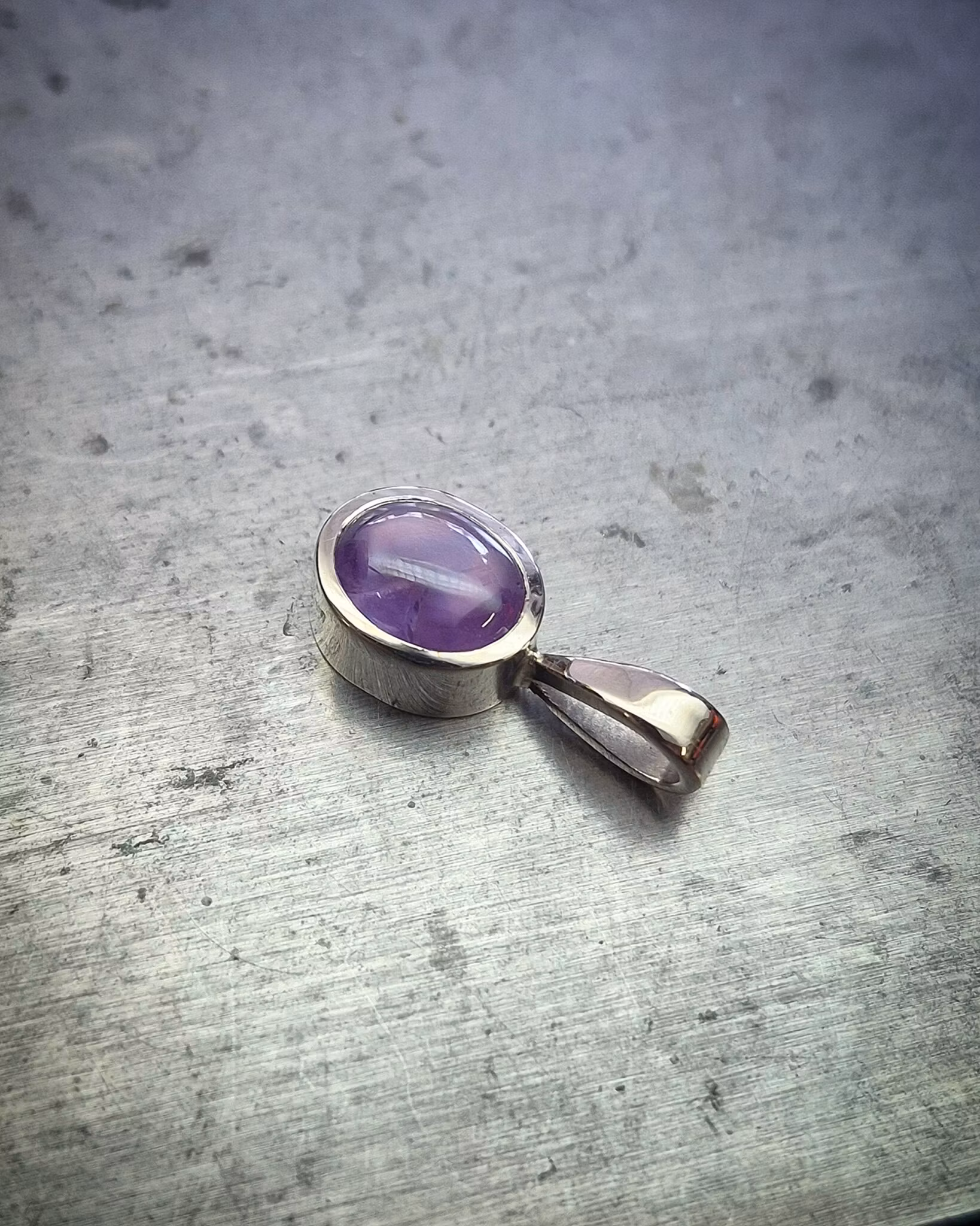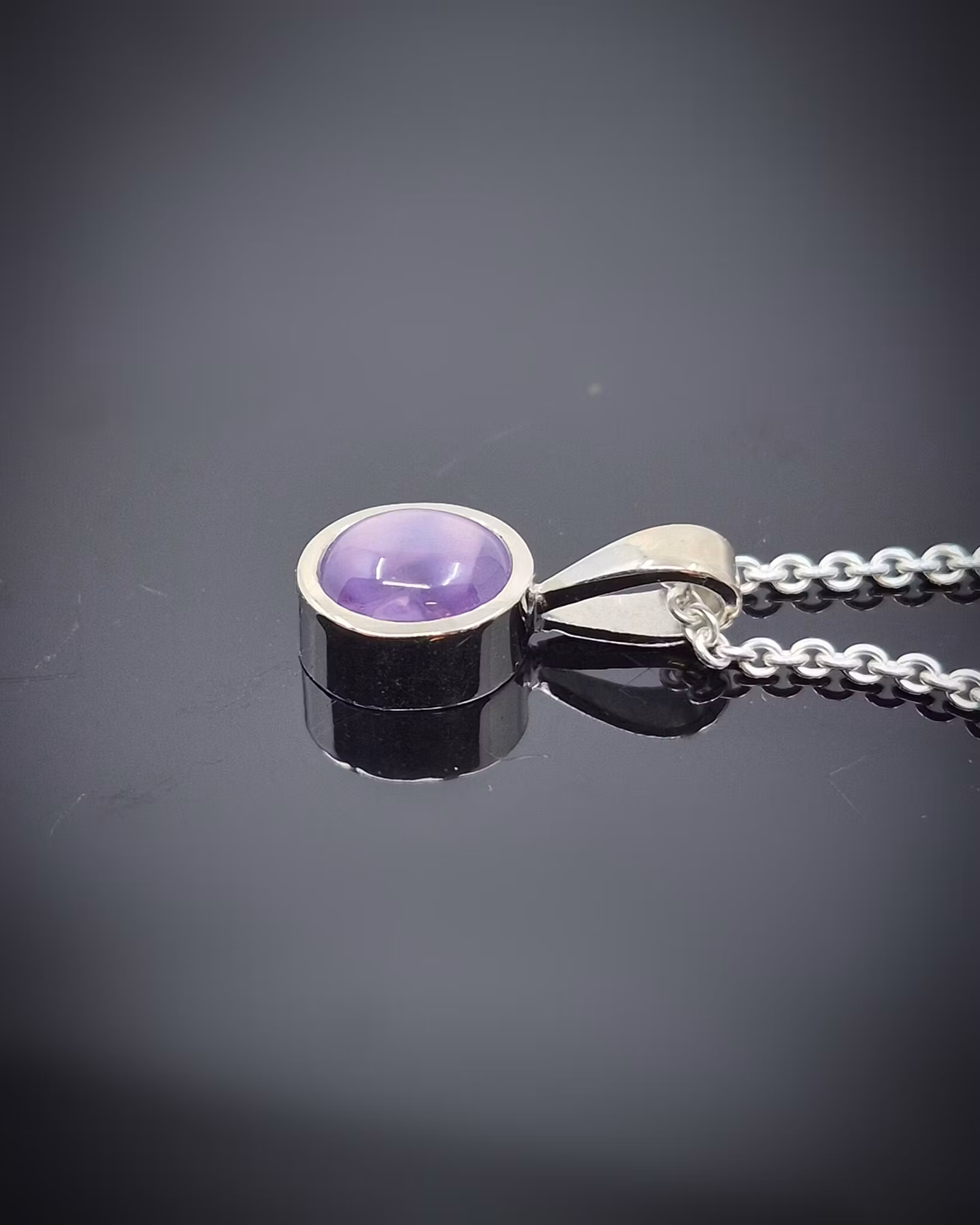 Hänget har en stilren design med släta blanka ytor och en klassisk spetsögla. Safiren är mycket speciell i sin färg då den går mellan lila och rosa, vilket är sällsynt! Stjärnan framträder skarpt när solens ljus träffar den, otroligt häftig och tämligen spektakulär effekt. Denna sten skiftar en hel del i sitt utseende i olika ljusförhållanden. Mycket vacker i verkligheten!