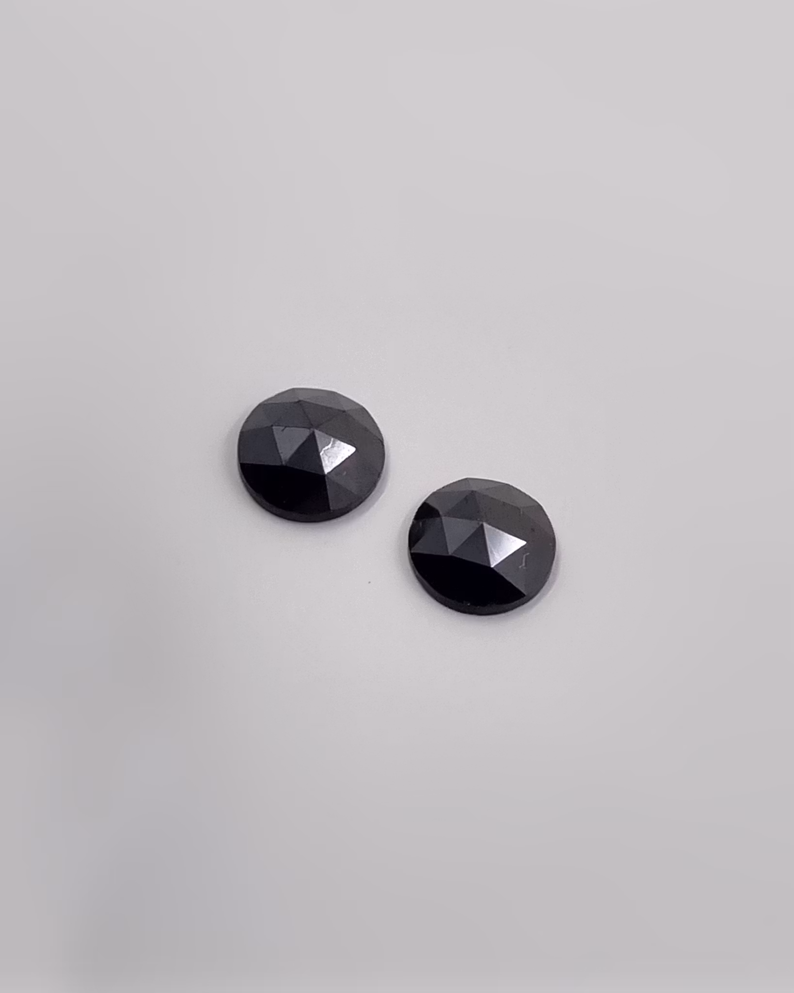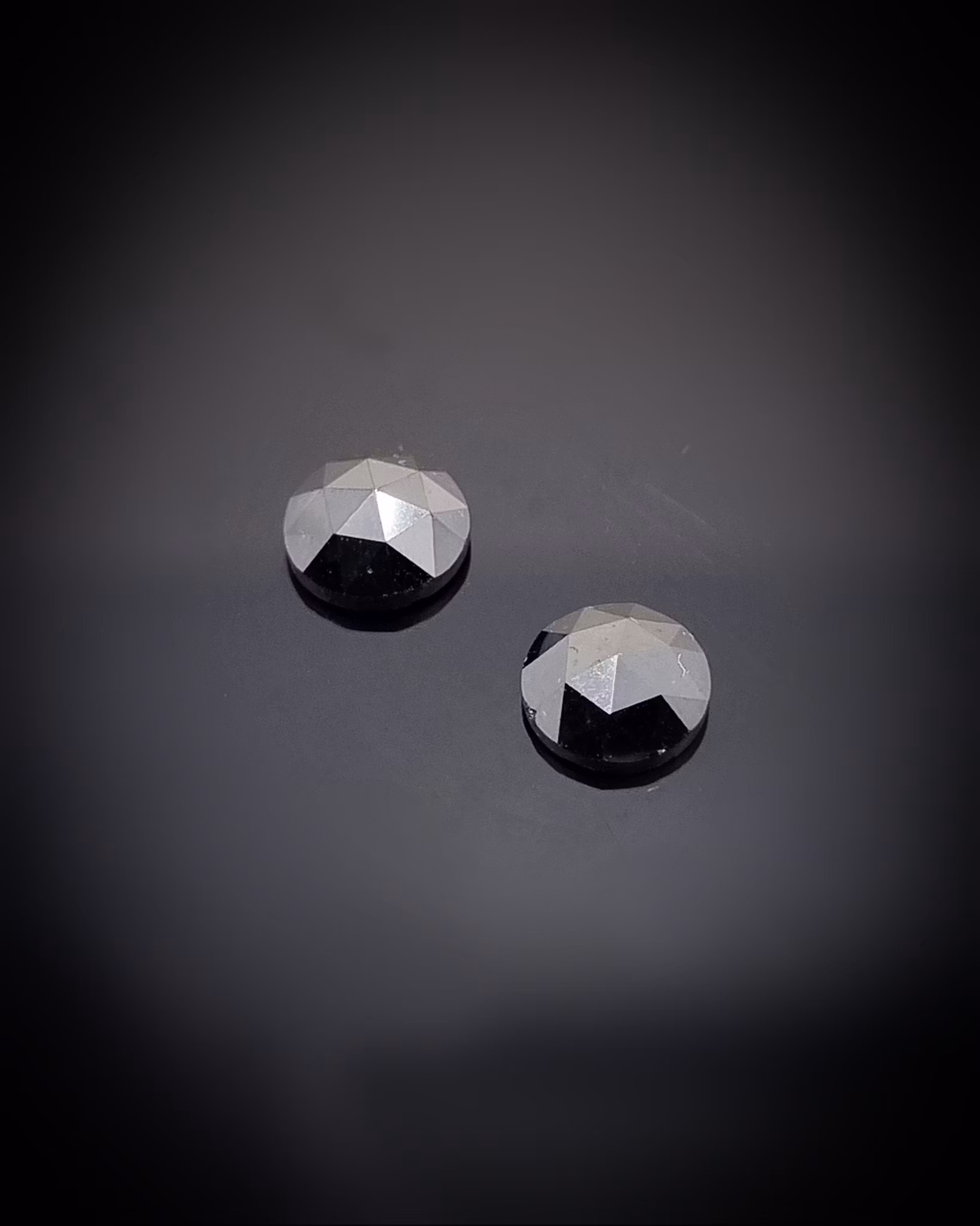 Dessa vackra Diamanter är naturligt svarta och stilrena med sitt eleganta gnister. Dom mäter ca 6,4 mm i diameter och väger totalt 1,87 carat.