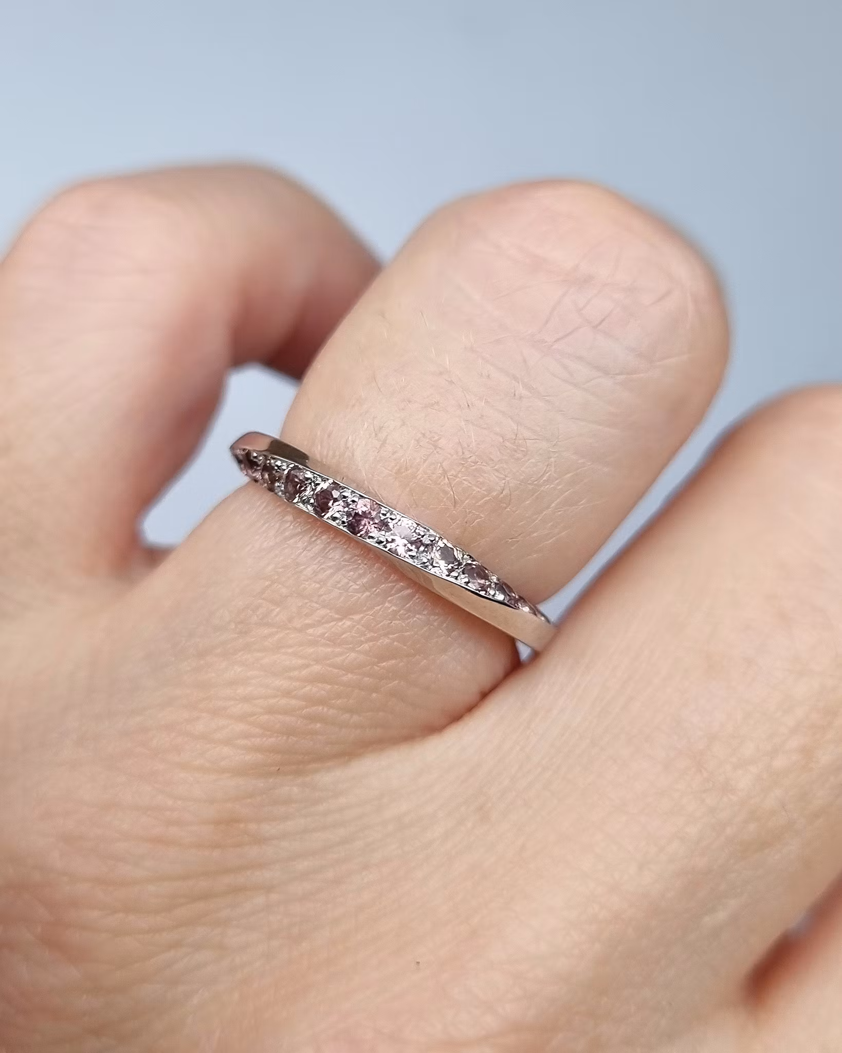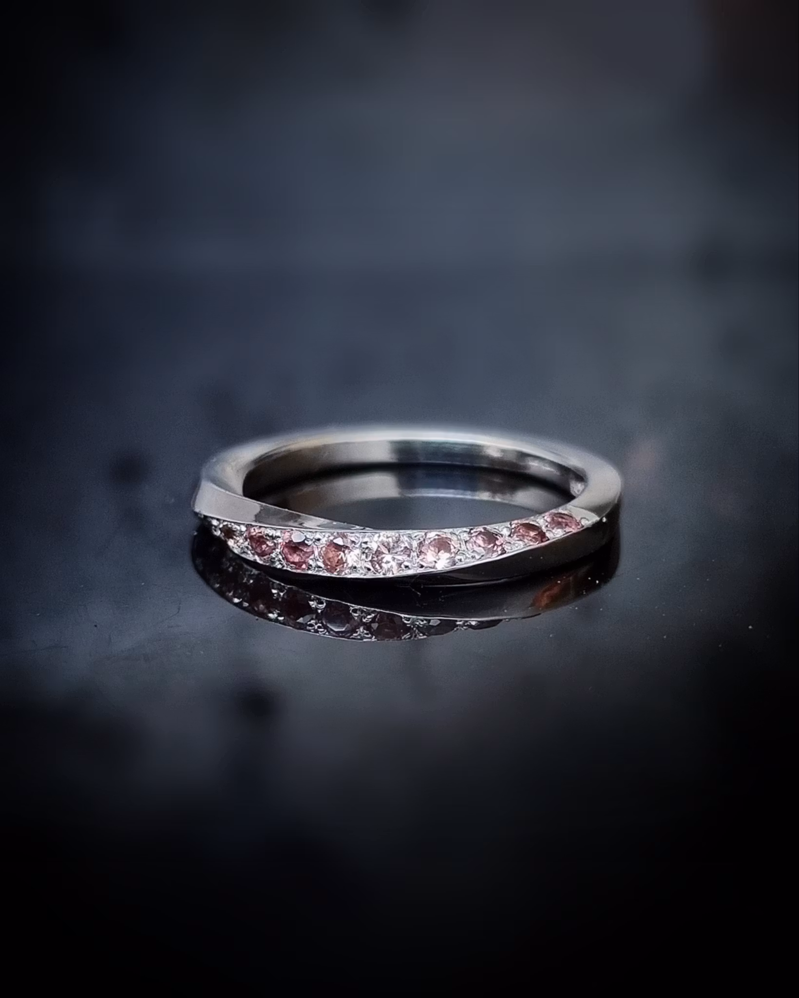 Vriden kantig modell med ett gnistrande rad av ljust askrosa / rosabruna färgskiftande Safirer. Ringen är ca 2 x 1,9 mm och det sitter 15 st á 2 mm Safirer (H) fattade i faden, totalt 0,69 ct. Stenarna är utvunna i Tanzania.