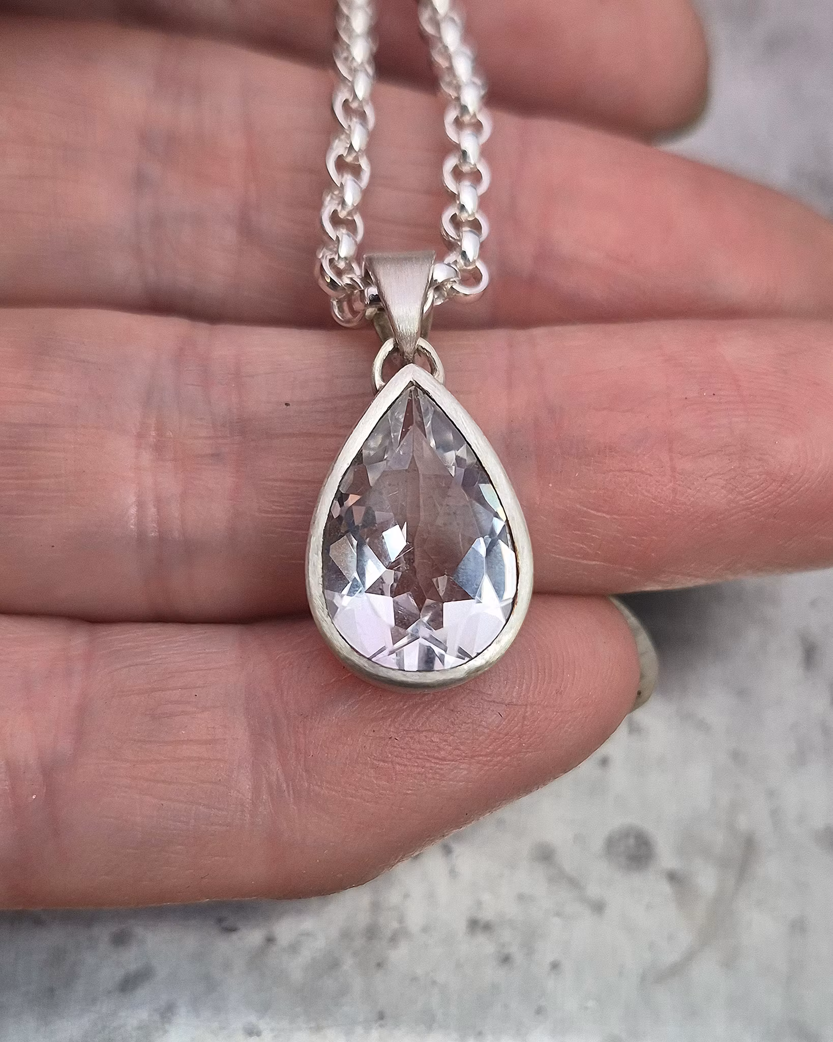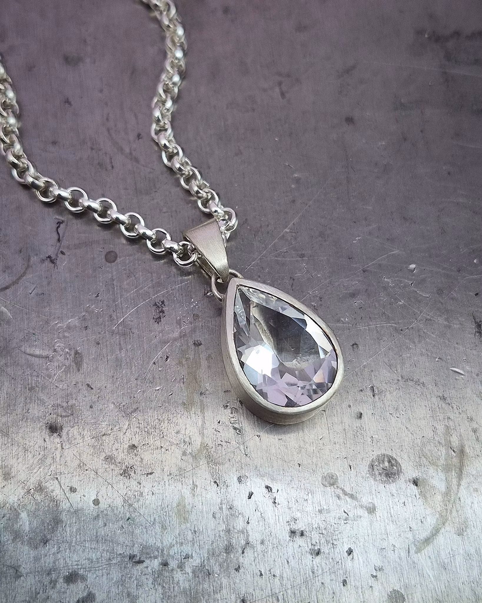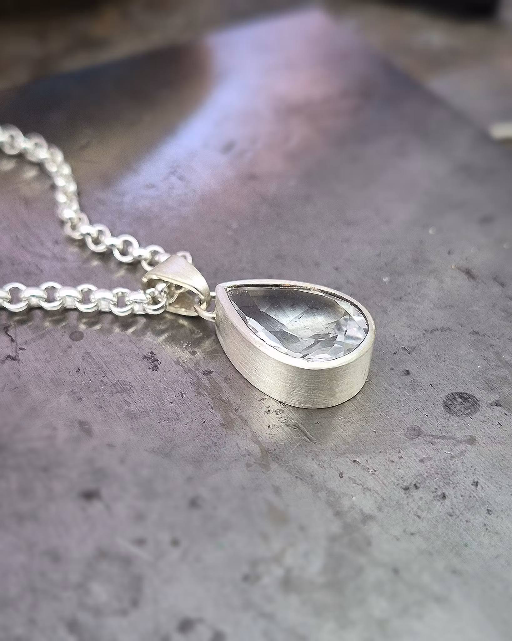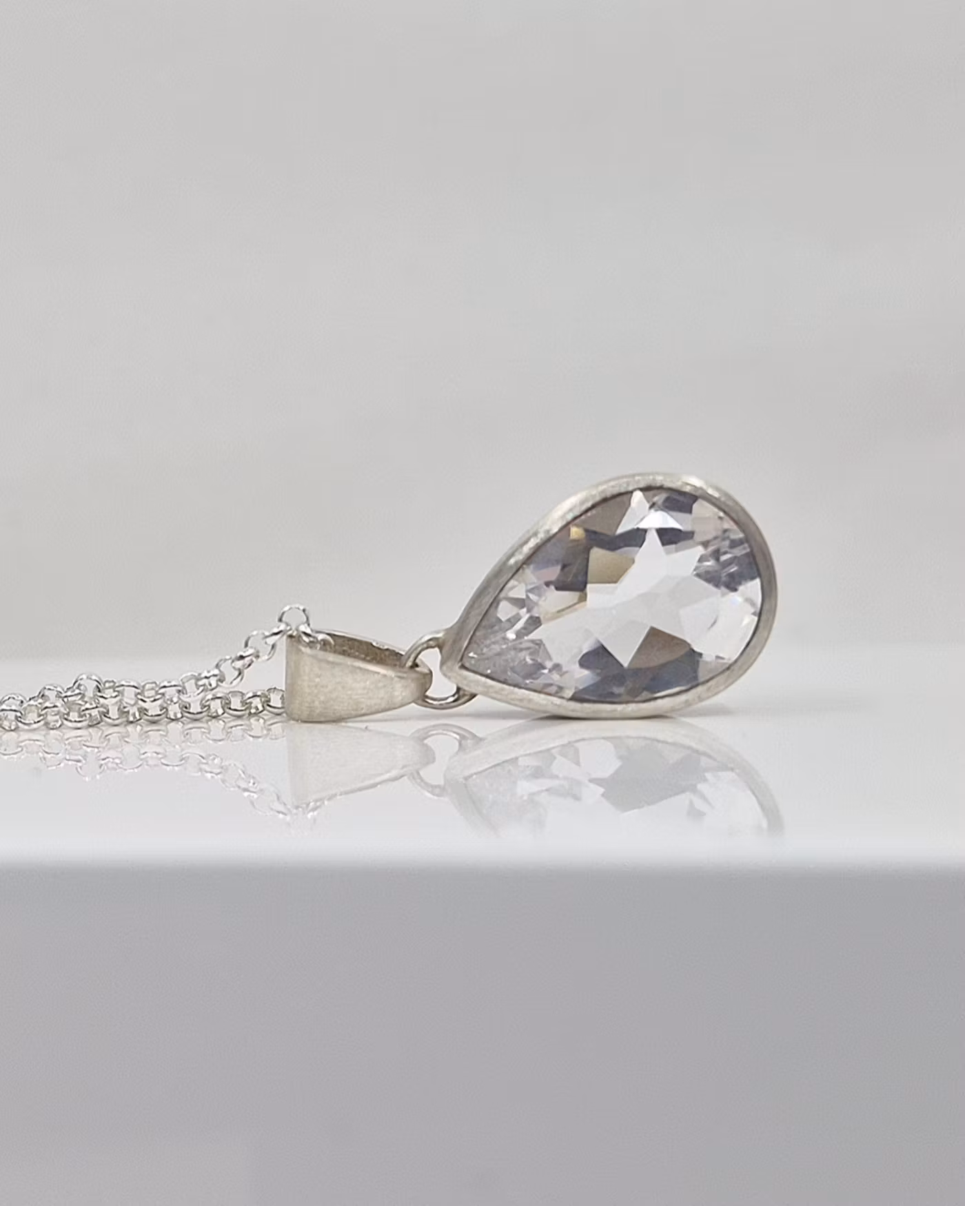 Naturlig vit Topas, päronslipad i en sidenmatt infattning i återvunnet sterlingsilver.